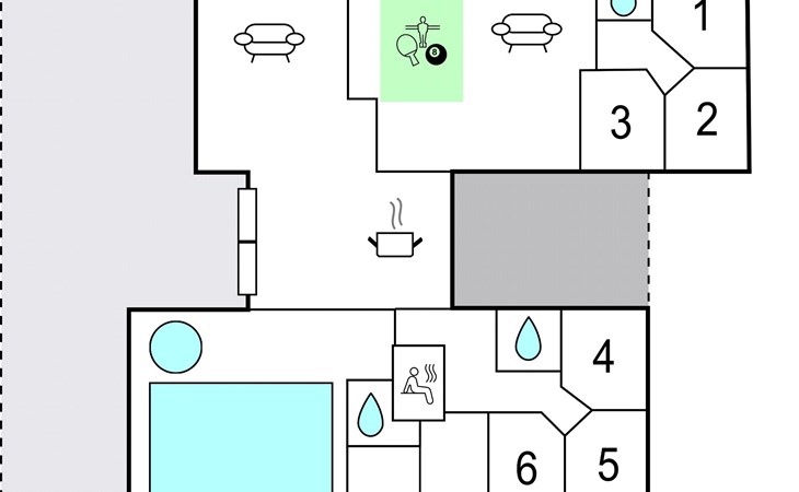 A quite fantastic vacation home with a good location close to a beautiful swimming beach on Nordfünen. The house has six good bedrooms and a sleeping loft of 10 m². In addition, there is an activity room with table soccer, billiards, table tennis and darts. The activity room is right next to the large beautiful living room with direct exit to the kitchen. In the pool room you can have a lot of fun in the pool and the 4-person jacuzzi. Here you also have the entrance to the sauna. Akontoverbrauch and final cleaning must be paid in the house along with the other consumption costs. Bed linen, towels, crib and chair can be rented at the local office for a fee.