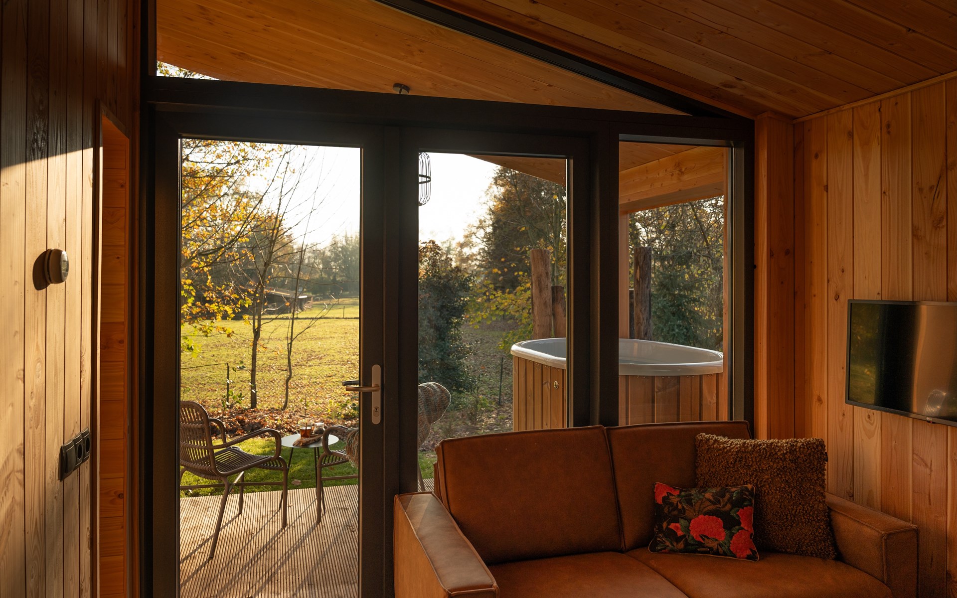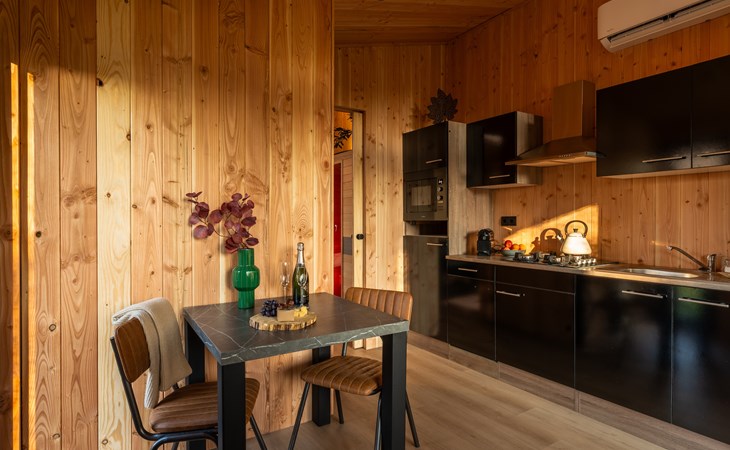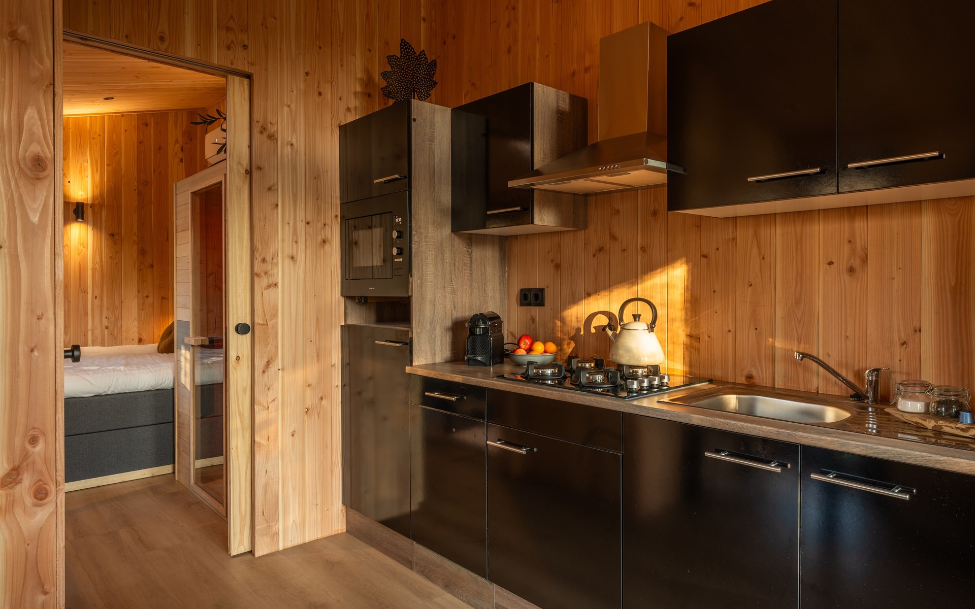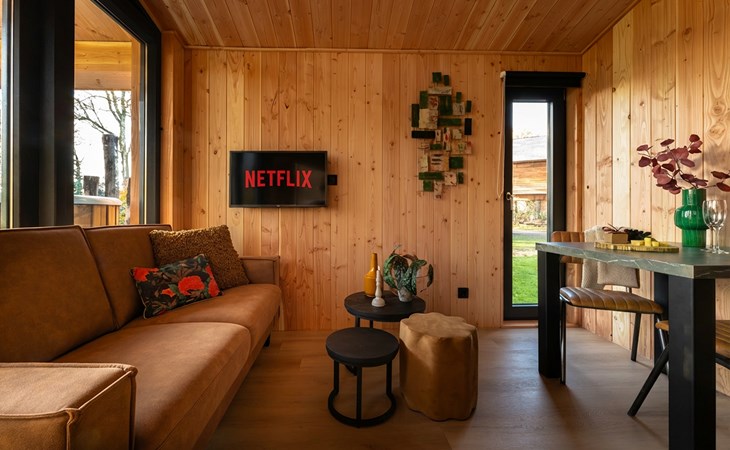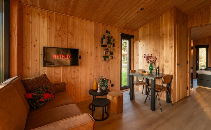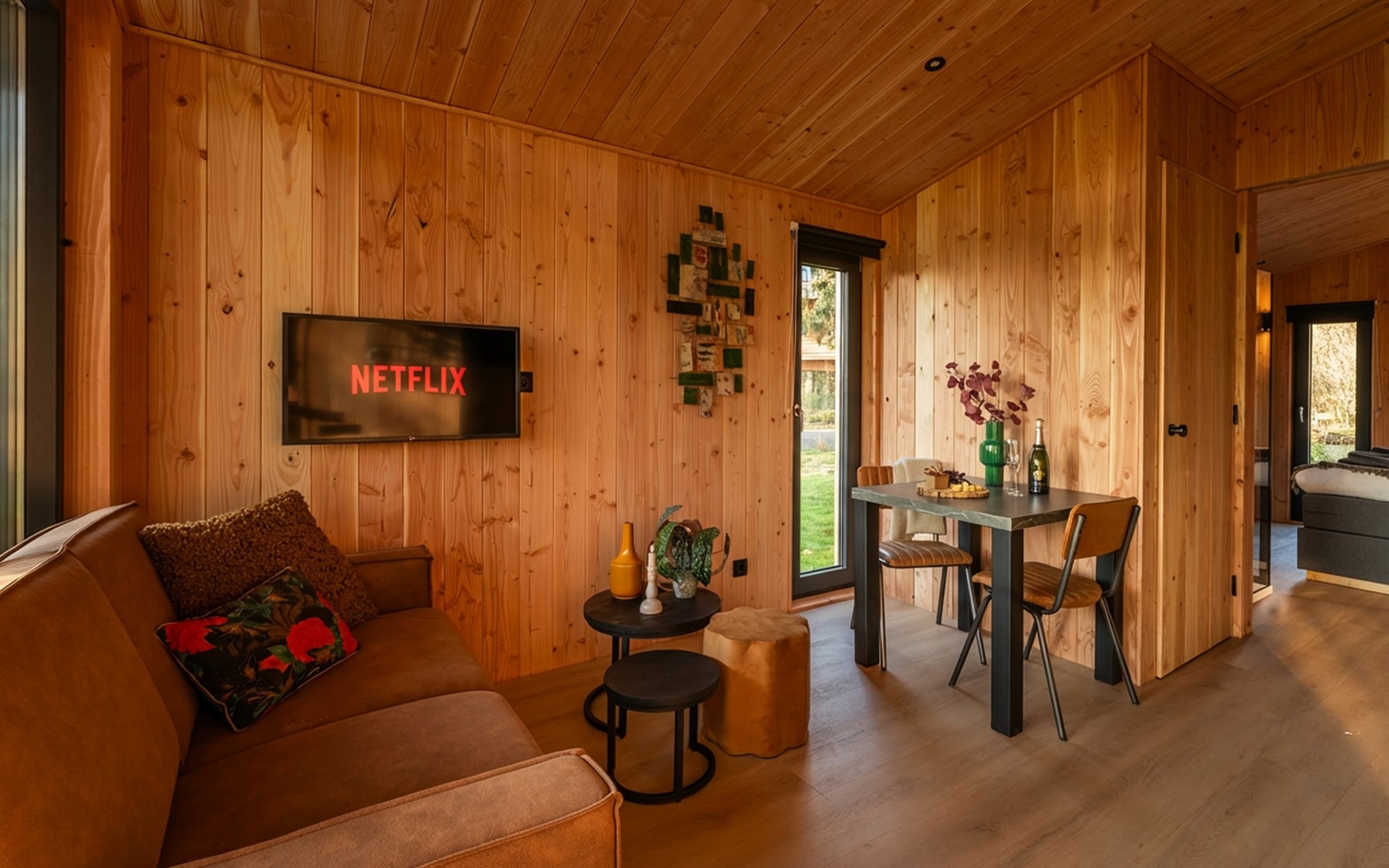 Inside, the warm and stylish interior creates an inviting atmosphere. The cosy seating area with Smart TV is perfect for unwinding in the evening. The fully equipped kitchen makes it easy to prepare breakfast or a romantic dinner, while the patio doors bring the surrounding nature right inside.