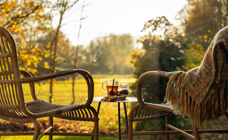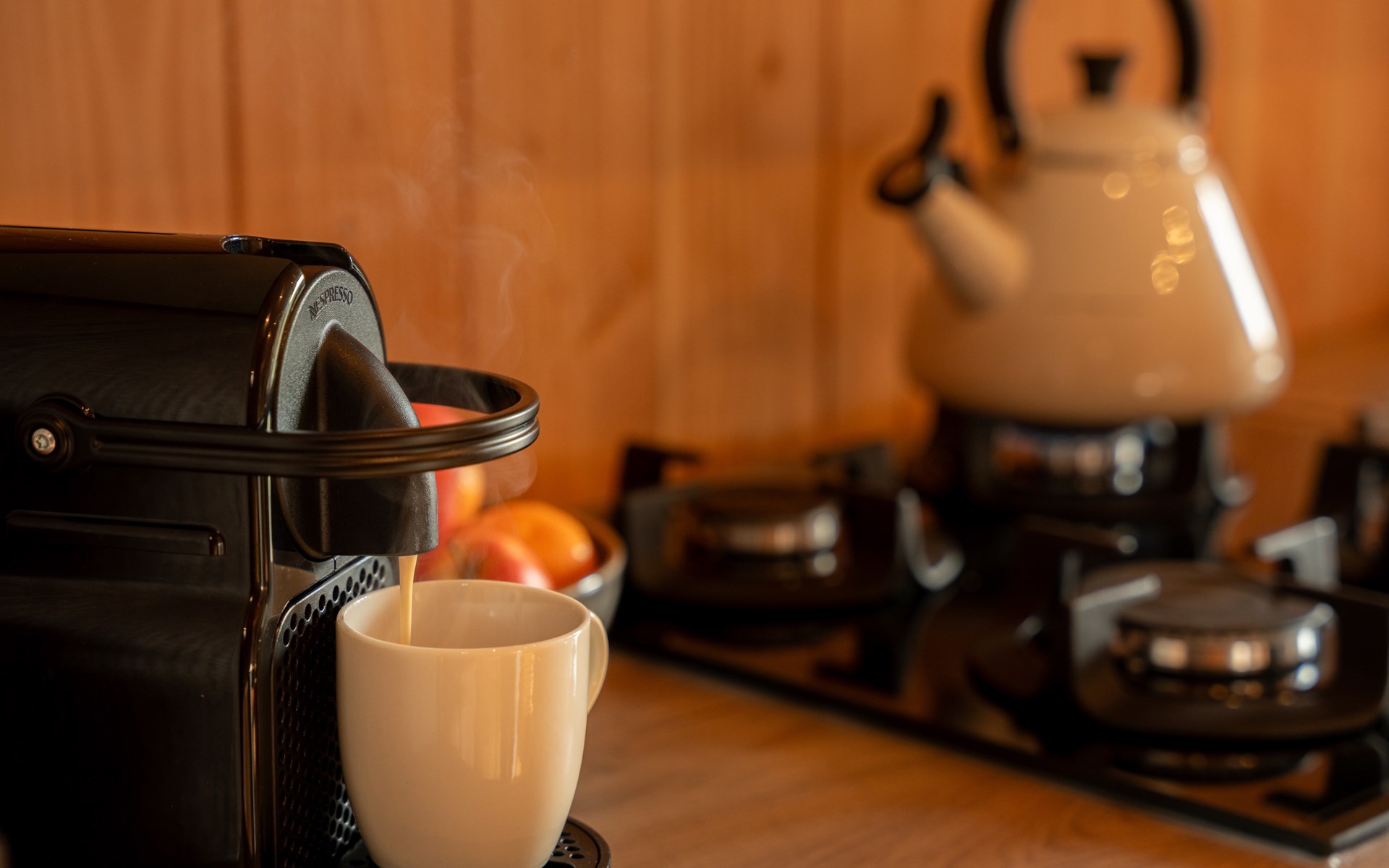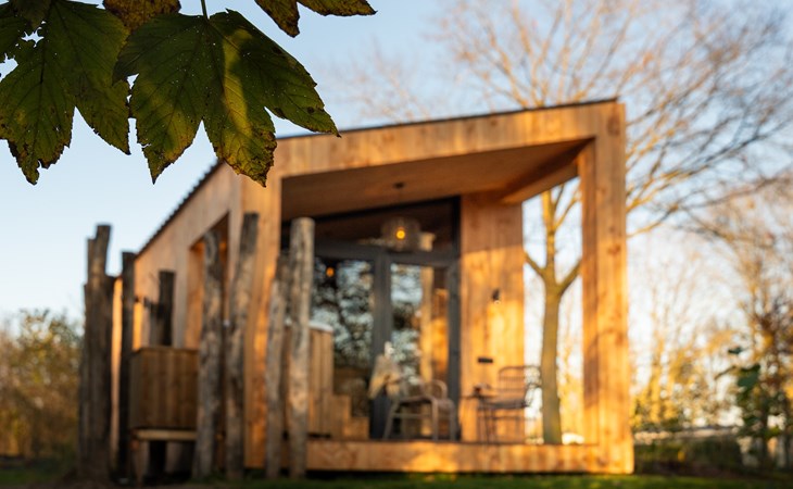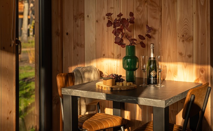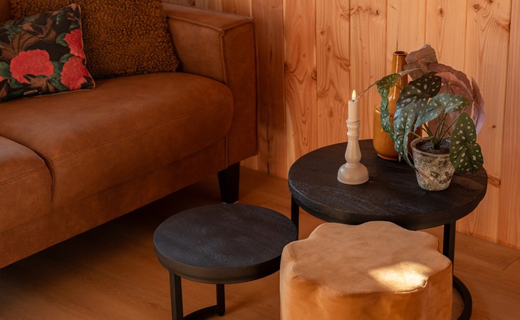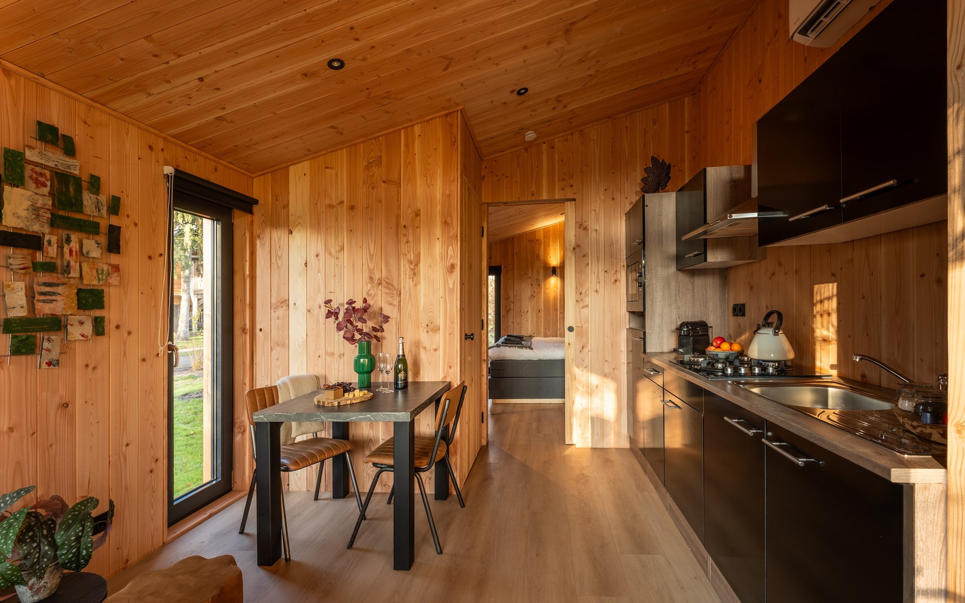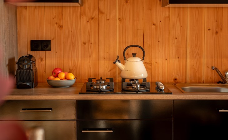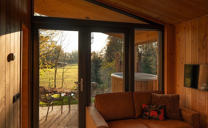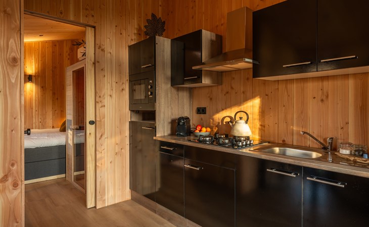 Inside, the warm and stylish interior creates an inviting atmosphere. The cosy seating area with Smart TV is perfect for unwinding in the evening. The fully equipped kitchen makes it easy to prepare breakfast or a romantic dinner, while the patio doors bring the surrounding nature right inside.