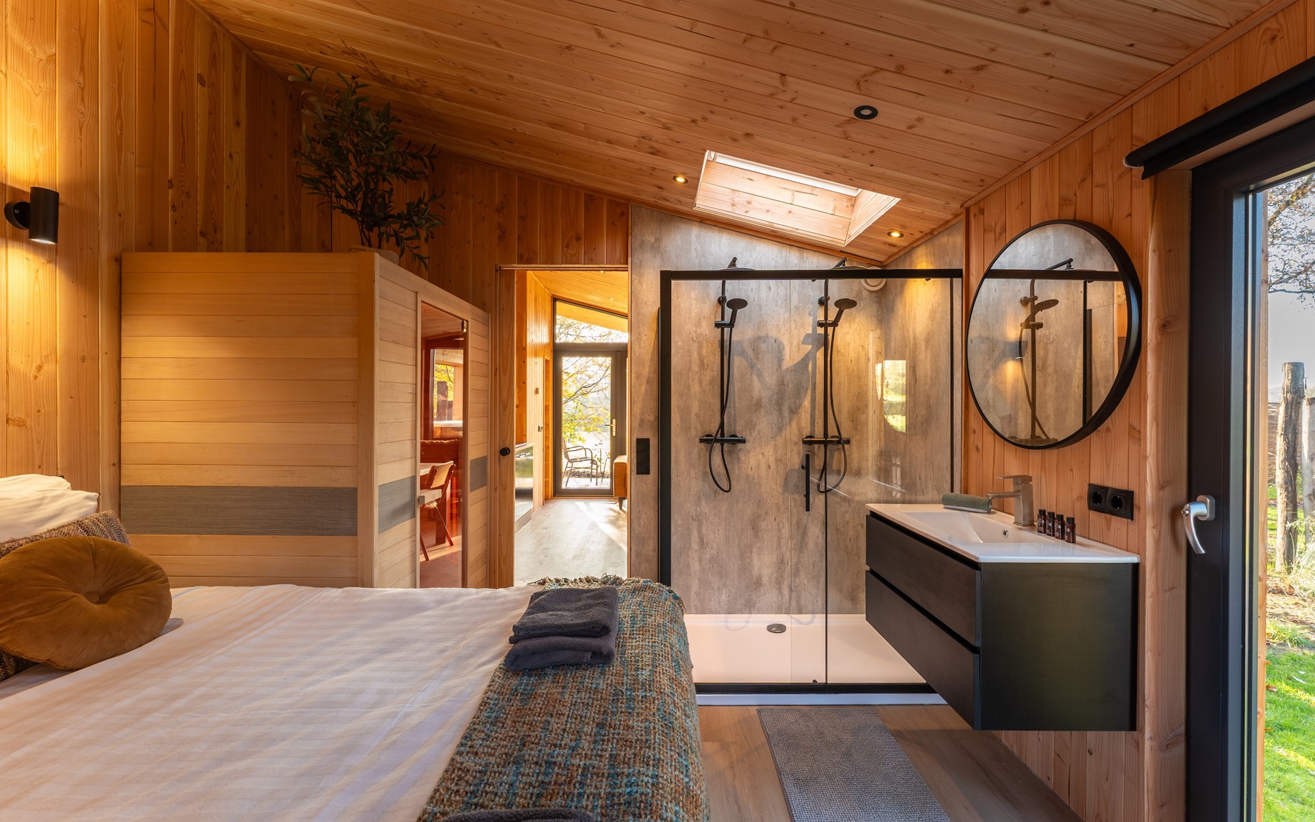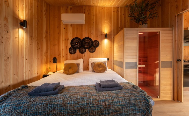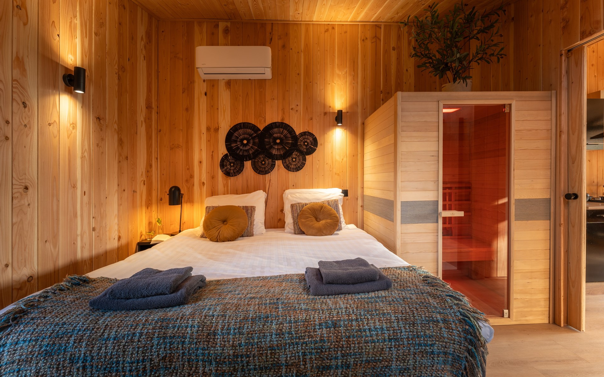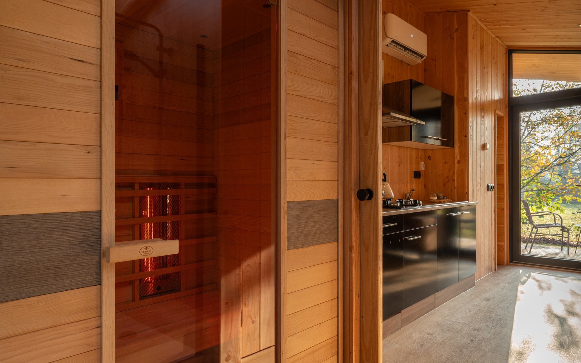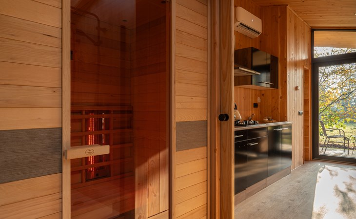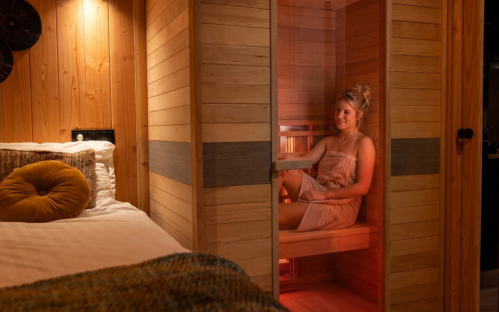 Enjoy pure relaxation together in this exclusive wellness lodge for two. Everything here is designed to offer peace, comfort and the feeling of truly getting away from it all. The lodge features a private hot tub, an infrared sauna and a modern bathroom, allowing you to create your own wellness ritual at any moment of the day.
