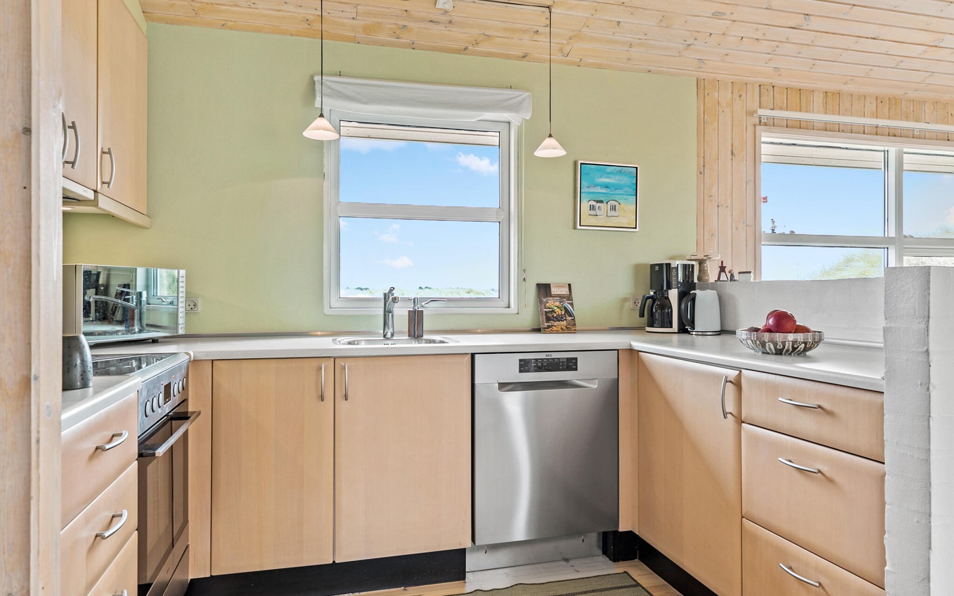 Experience relaxing days in your charming holiday home in the dune landscape of Løkken. This cosy accommodation offers everything you need for a relaxing holiday with the family. The modern, light-flooded kitchen invites you to cook and offers a marvellous view of the surrounding nature. The living and dining area with its large windows lets in plenty of light and creates an inviting atmosphere. Spend your free time on the comfortable seating, play games together or enjoy stimulating conversations by the wood-burning stove.
