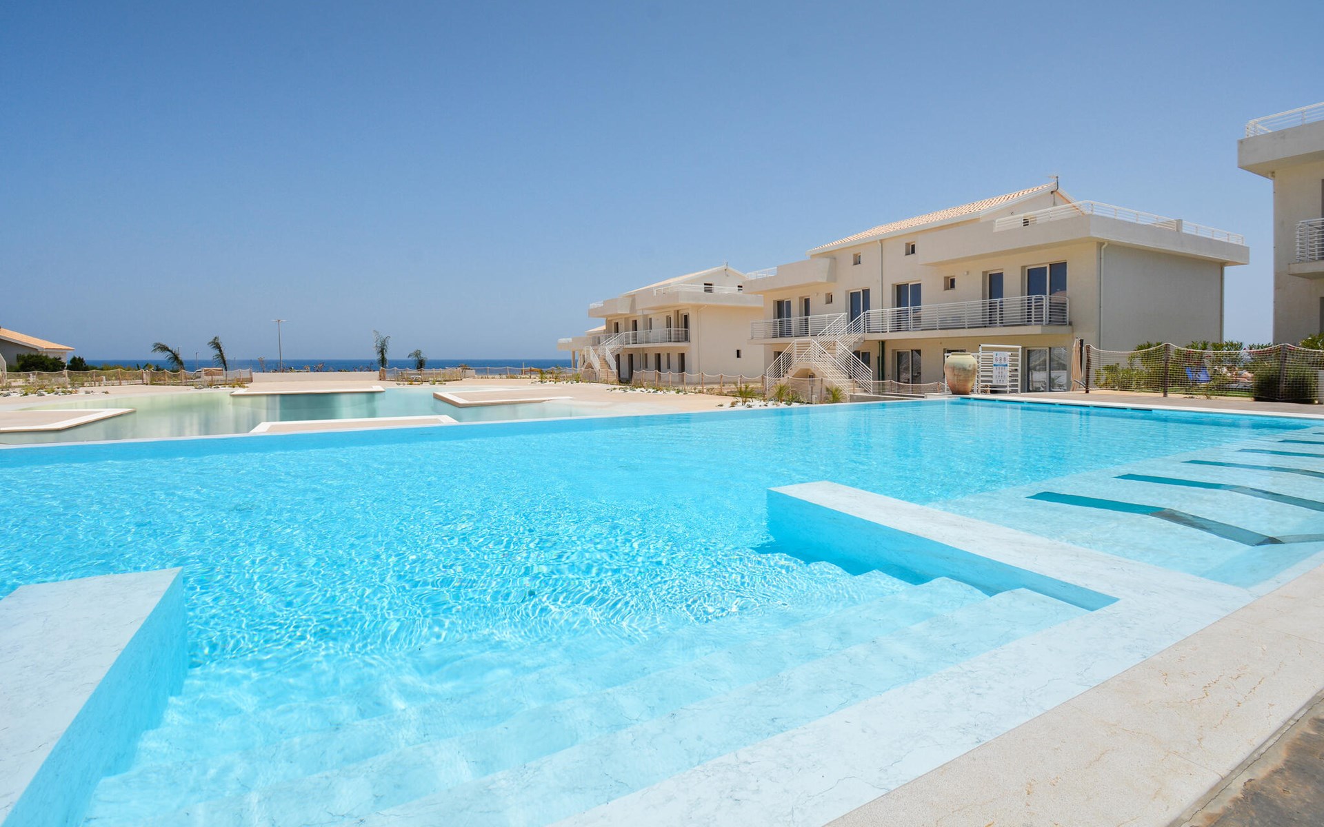 You can take a refreshing dip in the large communal pool after enjoying an ice cream on your terrace. Or take a stroll to the nearby sandy beach and dive straight into the sea.