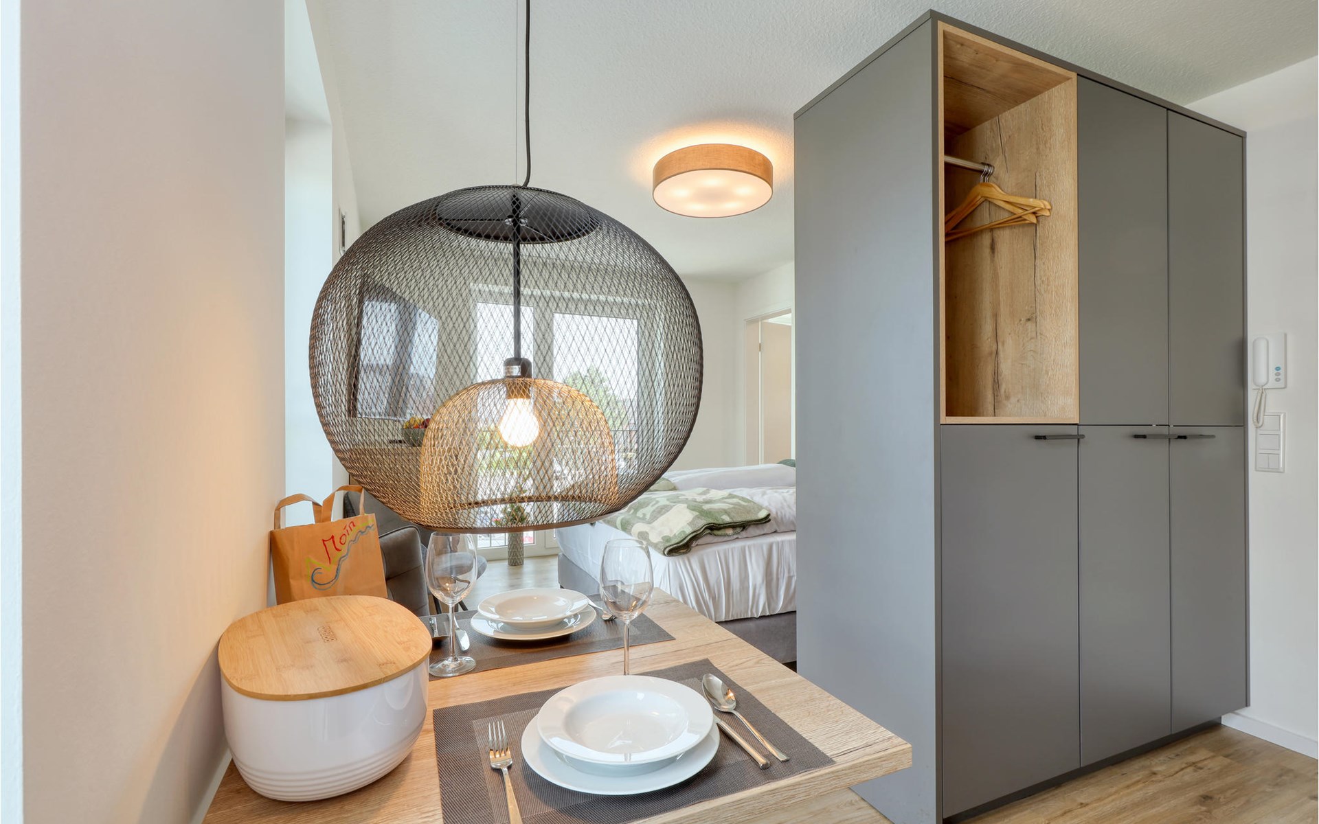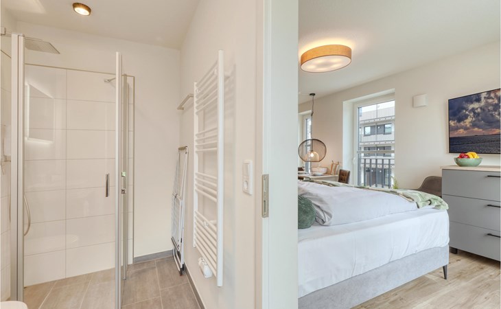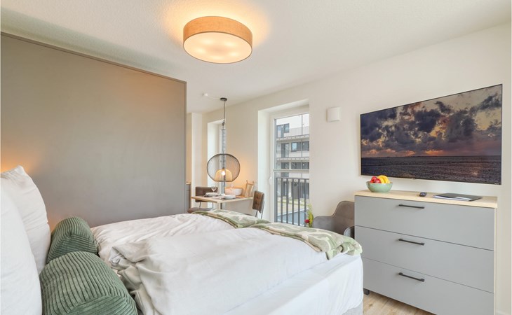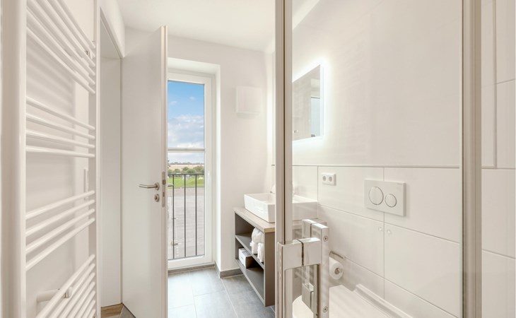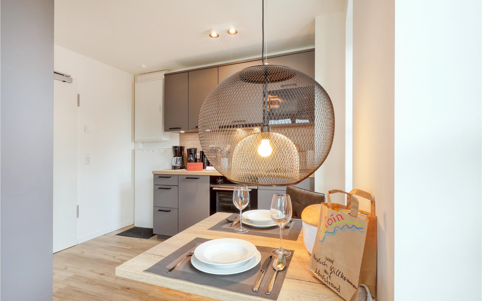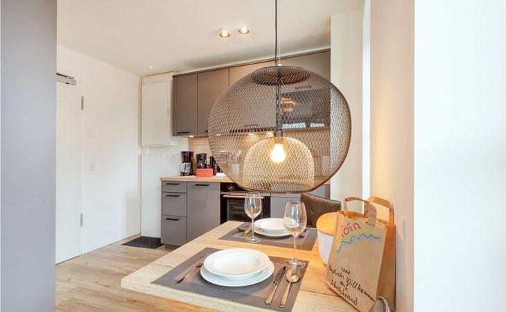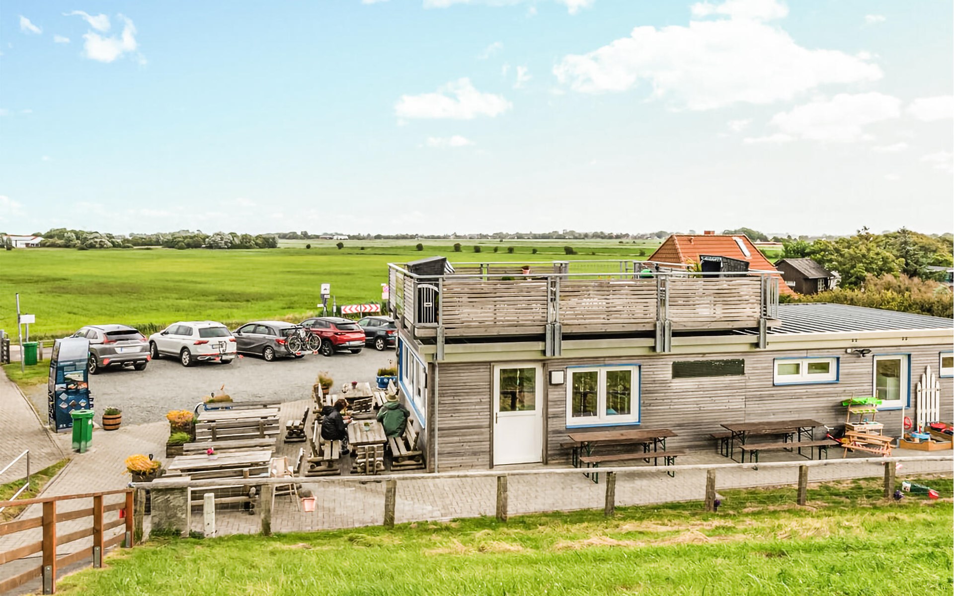 Welcome to Nordstrand, a beautiful peninsula on the Schleswig-Holstein North Sea coast in the Wadden Sea UNESCO World Heritage Site. The modern house with several holiday apartments is a true jewel in the middle of nature, the location directly behind the dyke makes the heart of every North Sea fan beat faster. The modern maritime expression of the exclusive holiday apartment immediately puts you in a holiday mood. Generous window fronts let in plenty of daylight and offer a breathtaking view of the surrounding landscape. With its focus on sustainability, the holiday home is the ideal place for holidaymakers who value relaxation in harmony with nature. Start your day with a delicious breakfast in the cosy living room with open-plan kitchen.