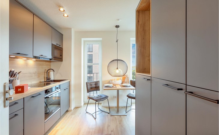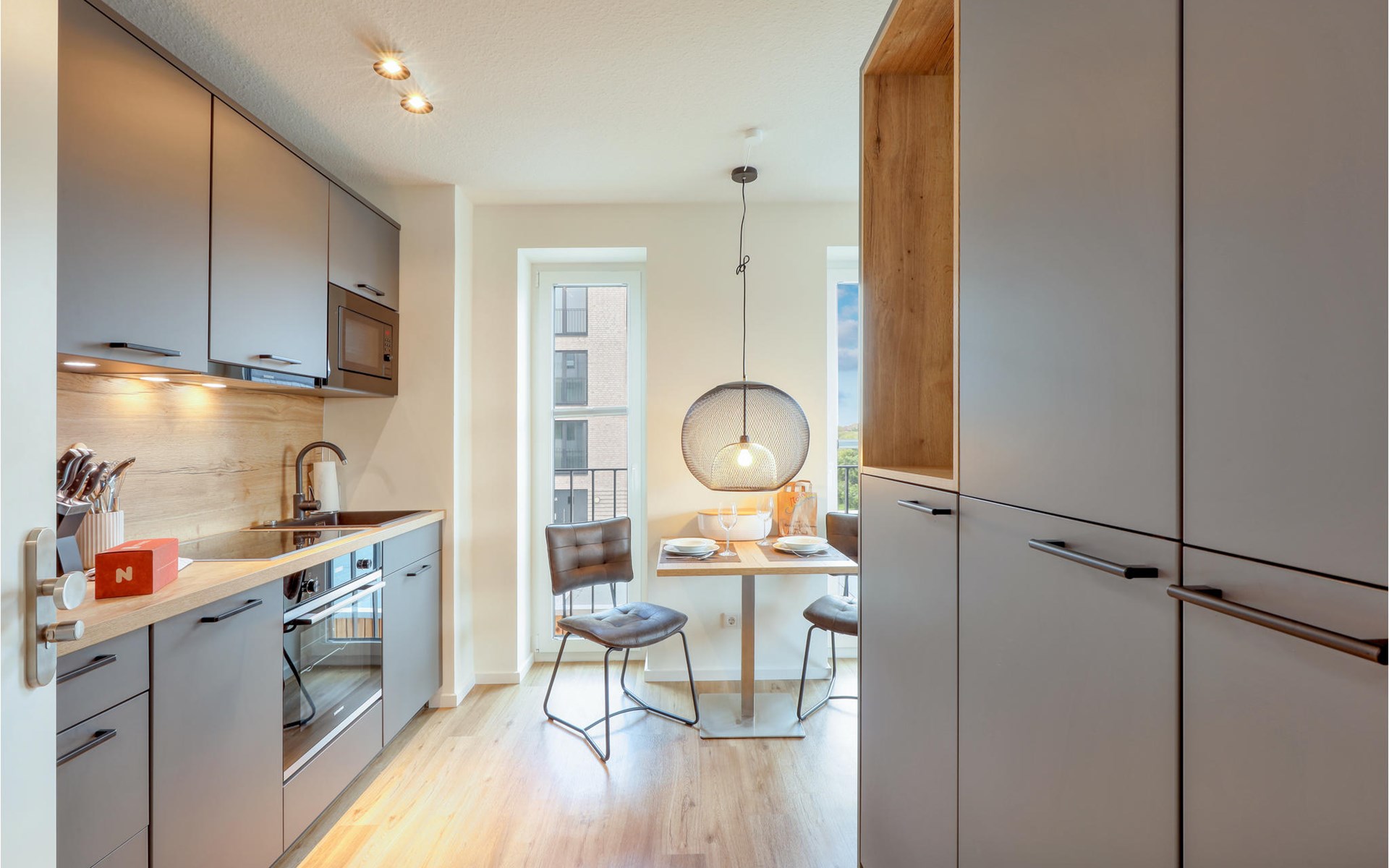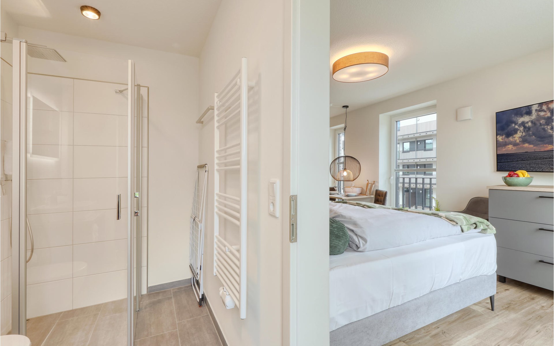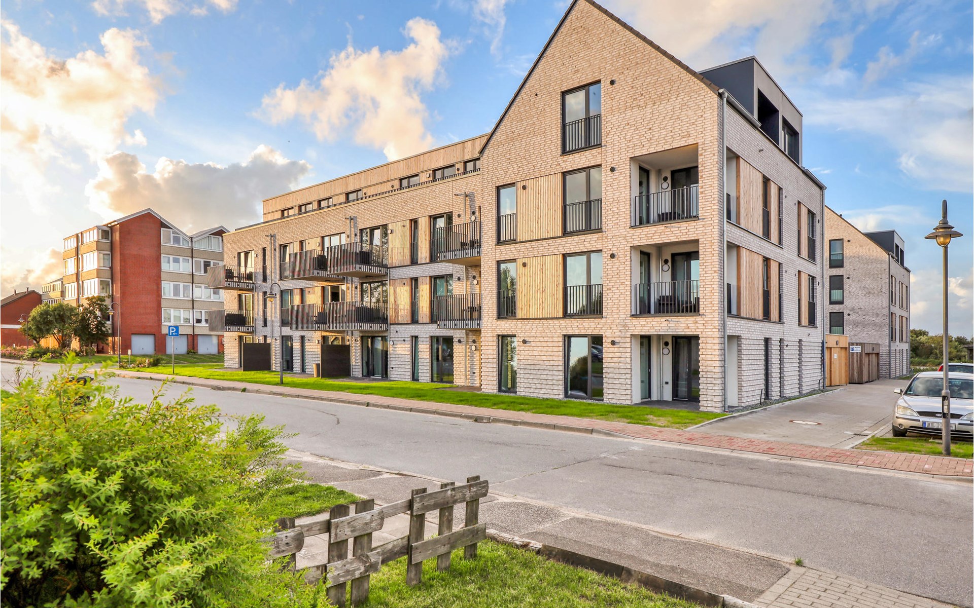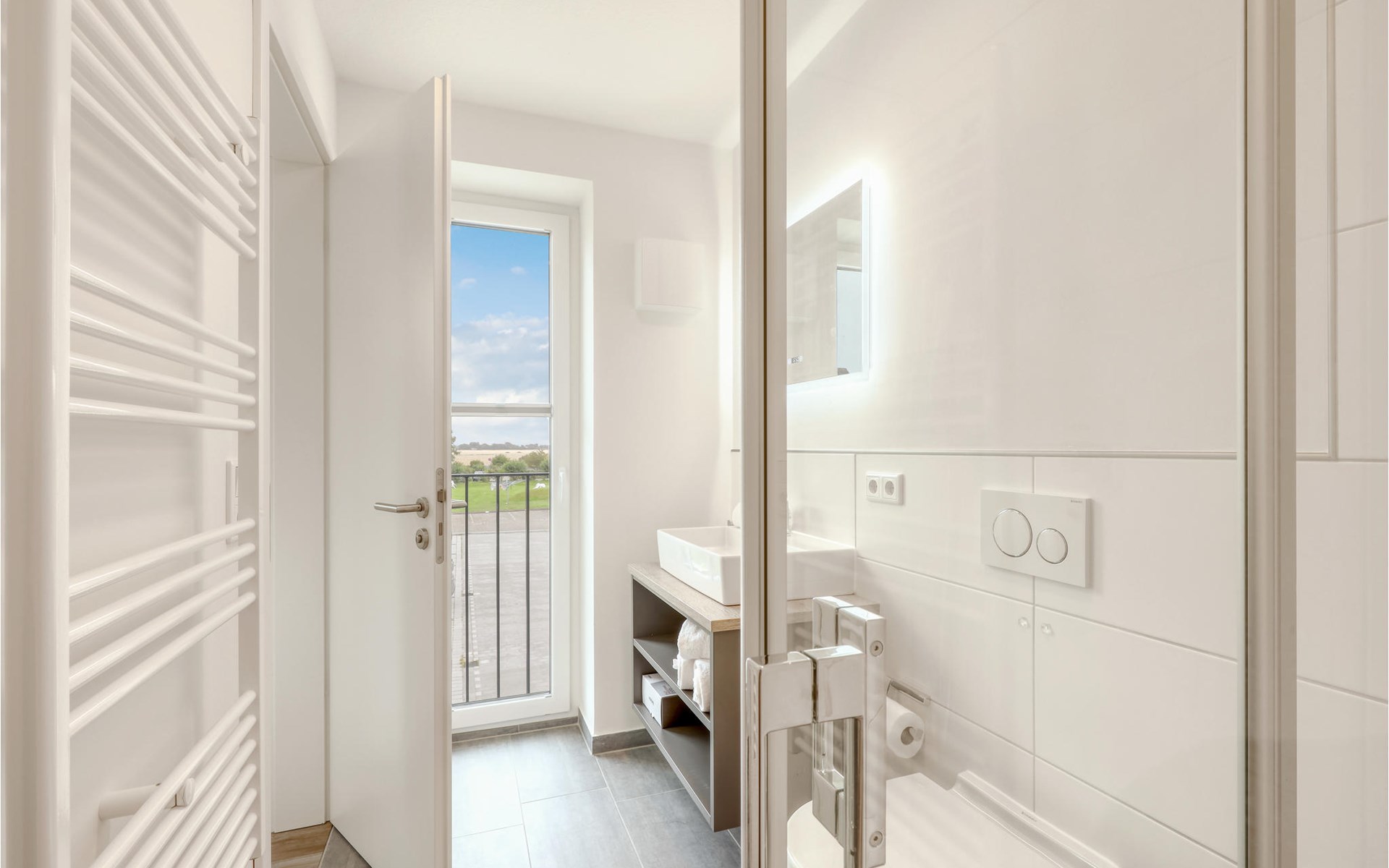 Welcome to Nordstrand, a beautiful peninsula on the Schleswig-Holstein North Sea coast in the Wadden Sea UNESCO World Heritage Site. The modern house with several holiday apartments is a true jewel in the middle of nature, the location directly behind the dyke makes the heart of every North Sea fan beat faster. The modern maritime expression of the exclusive holiday apartment immediately puts you in a holiday mood. Generous window fronts let in plenty of daylight and offer a breathtaking view of the surrounding landscape. With its focus on sustainability, the holiday home is the ideal place for holidaymakers who value relaxation in harmony with nature. Start your day with a delicious breakfast in the cosy living room with open-plan kitchen.