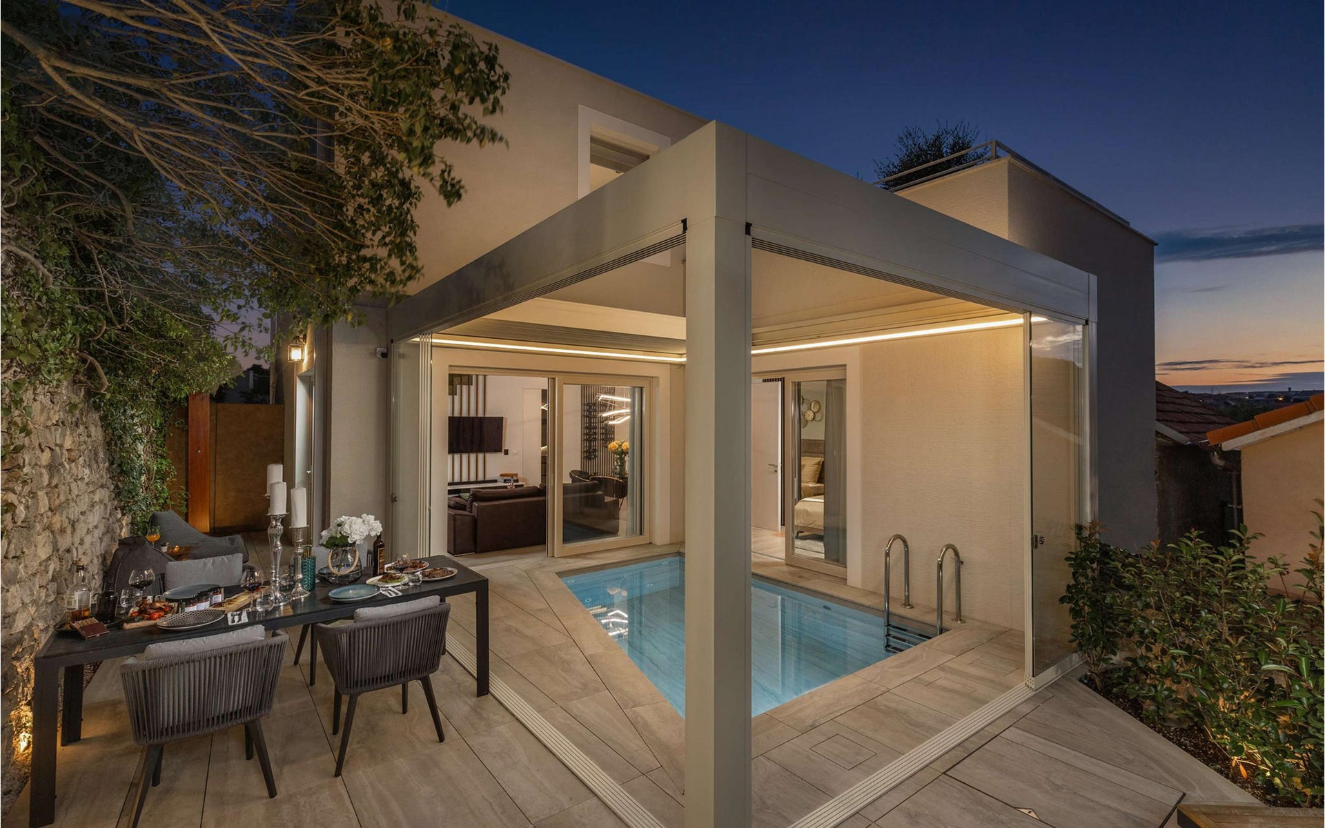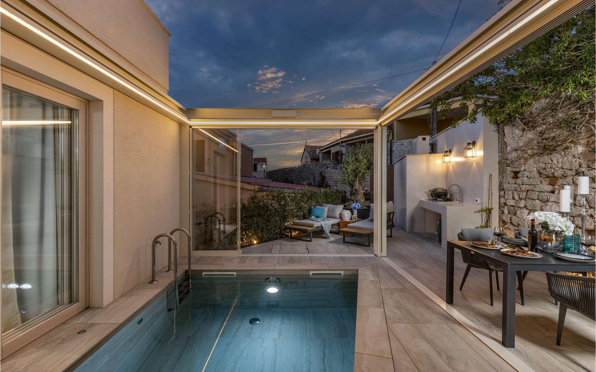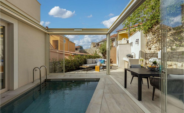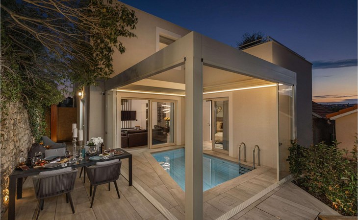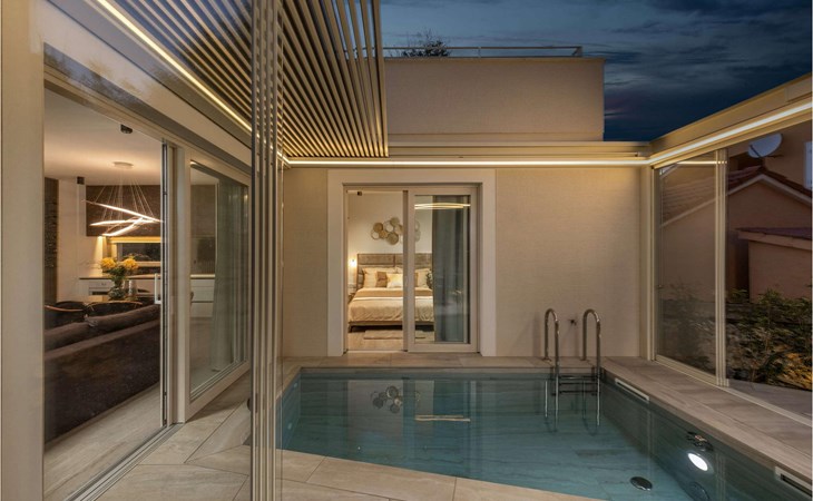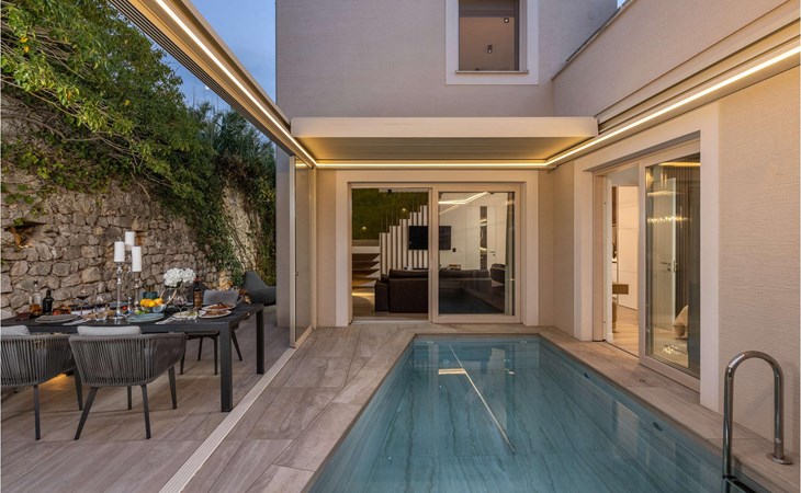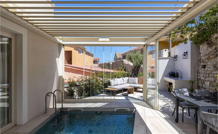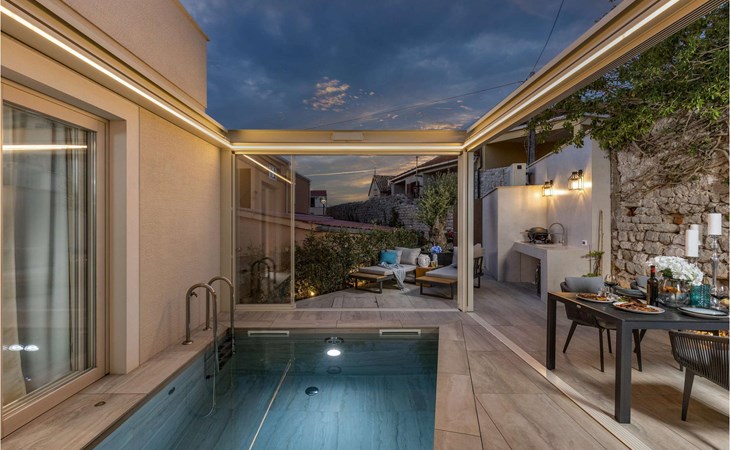 An open heated pool of 12 m2 and 1.5 metres deep is located on the terrace, but it can also be closed. Additional equipment for the pool is counter-current swimming, water and air massage, and a jacuzzi that is part of the pool. There is also an outdoor kitchen with an electric Webber grill on the terrace.