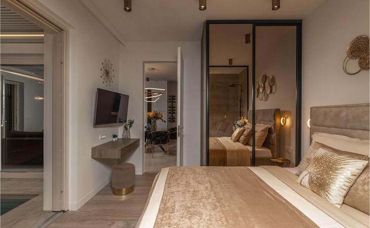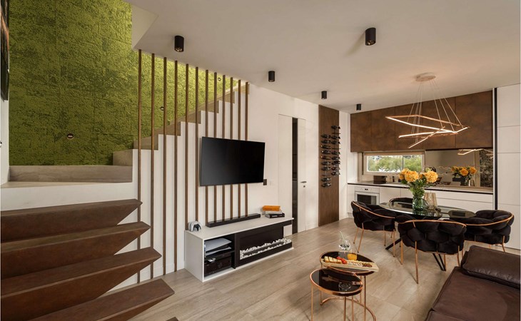 On the ground floor of the villa, there is a living room consisting of a sofa bed (which serves as an extra bed for two people), a TV, and a romantic fireplace. Children will be able to play PlayStation 5 or enjoy music thanks to the audio system, and for adults, there is a wine cellar and a cigar humidor (with an additional charge). There is also a kitchen where you will happily prepare delicious meals for the whole family and friends, and a dining room with a dining table with 6 seats. On the ground floor, there is also a sauna with a bathroom and a bedroom with a double bed, and an ensuite bathroom with a shower cabin.