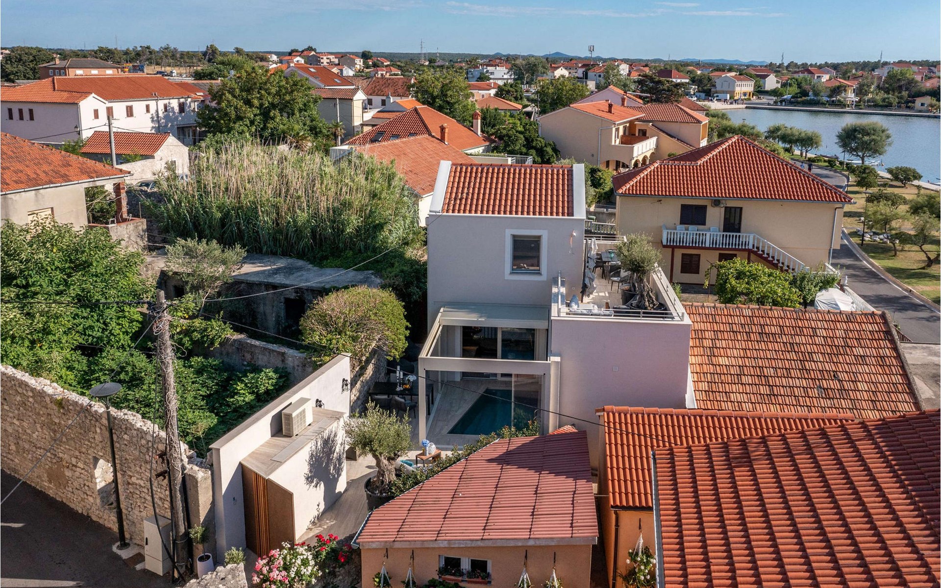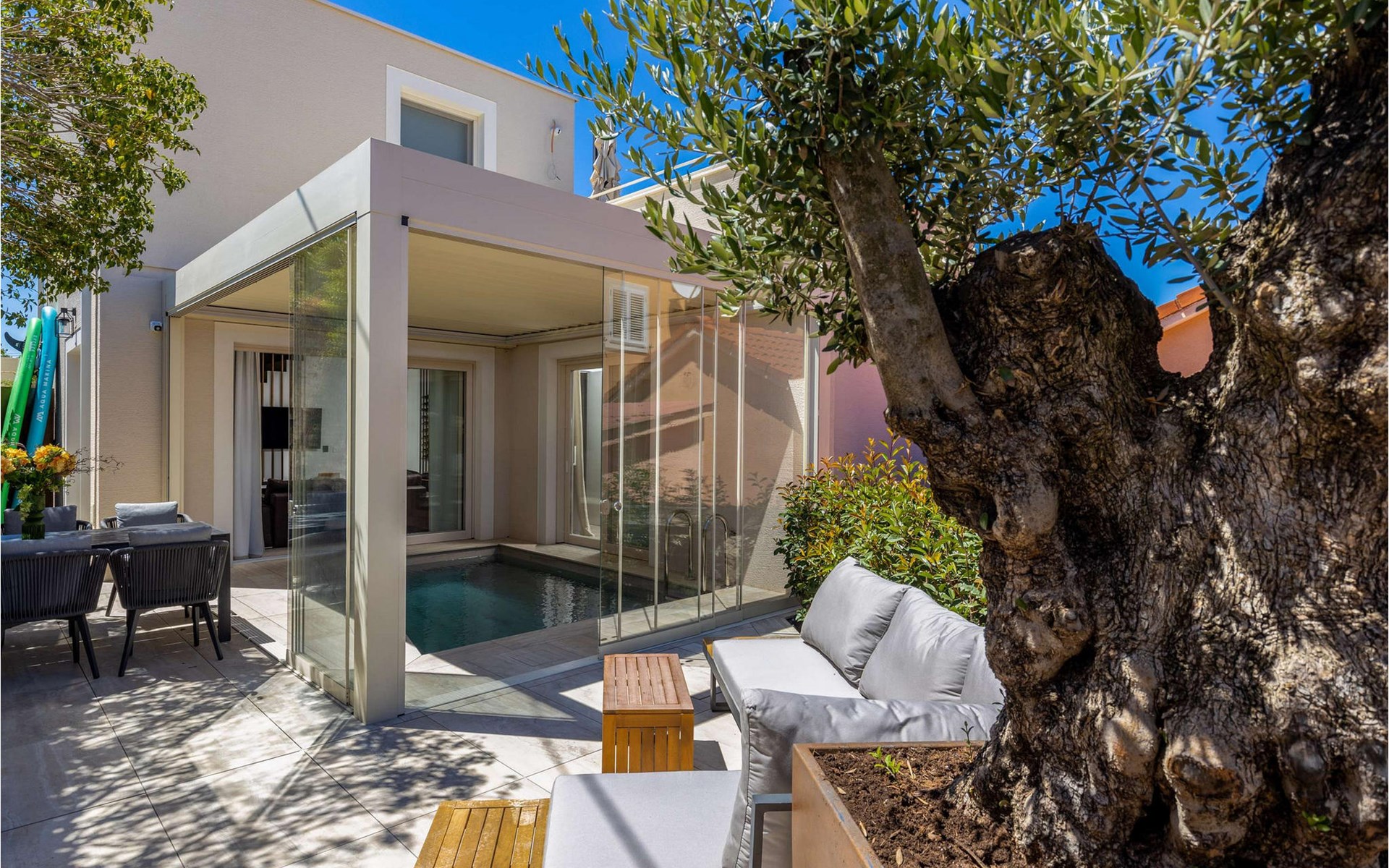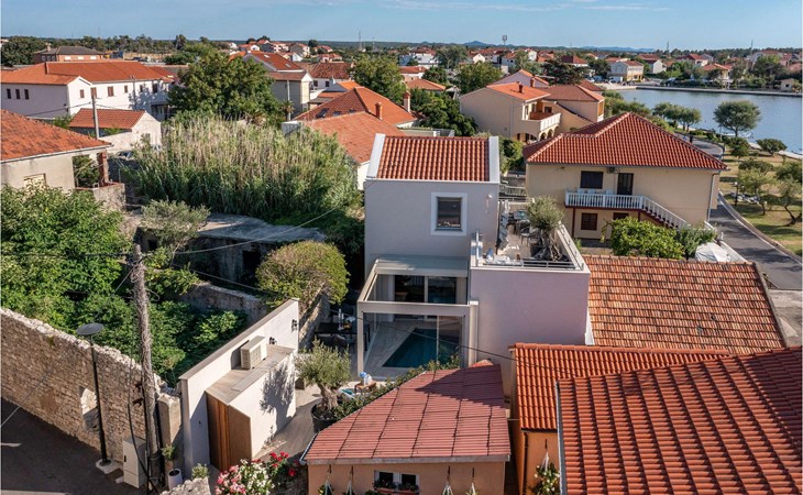 Relax with family and friends in a villa with a sea view in a quiet part of the old town of Nin with ancient city walls from the 16th century in the courtyard, wellness experience with heated outdoor/indoor pool, hydromassage, contra swimming, Finnish sauna. Enjoy the included stand-up paddleboards with the whole family in the beautiful sandy lagoon of Nin, and take windsurfing or kitesurfing lessons. With shops, restaurants, and a speedboat within a 1-2 minute walk, this is a real paradise in the heart of the ancient city of Nino.