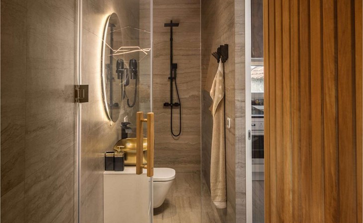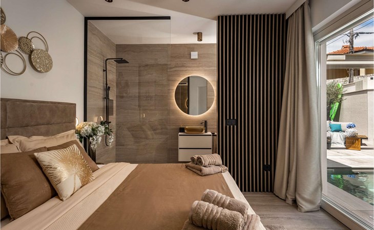 On the upper floor, there is another bedroom with a double bed and an attached en suite bathroom with a shower cabin, and a dining table next to which there is a lounge area with seating and 4 deckchairs. Likewise, from the top floor you will enjoy the view of the clean and clear Adriatic Sea.