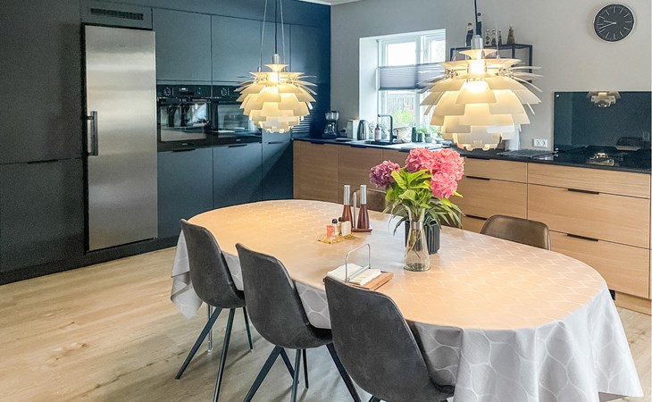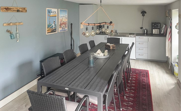 This well-kept holiday home in the centre of Thyborøn offers you ideal conditions for a break on the Danish west coast. Look forward to a well-equipped home that combines space, privacy and proximity to the sea and harbour. Spend time together in the bright living area with comfortable sofas, stylish furnishings and an inviting atmosphere. Use the modern kitchen with high-quality appliances and dining table for cooking evenings together. A separate room with a long table and second kitchenette is also ideal for socialising over meals. Relax after an eventful day with a film evening or in a quiet round with a book.