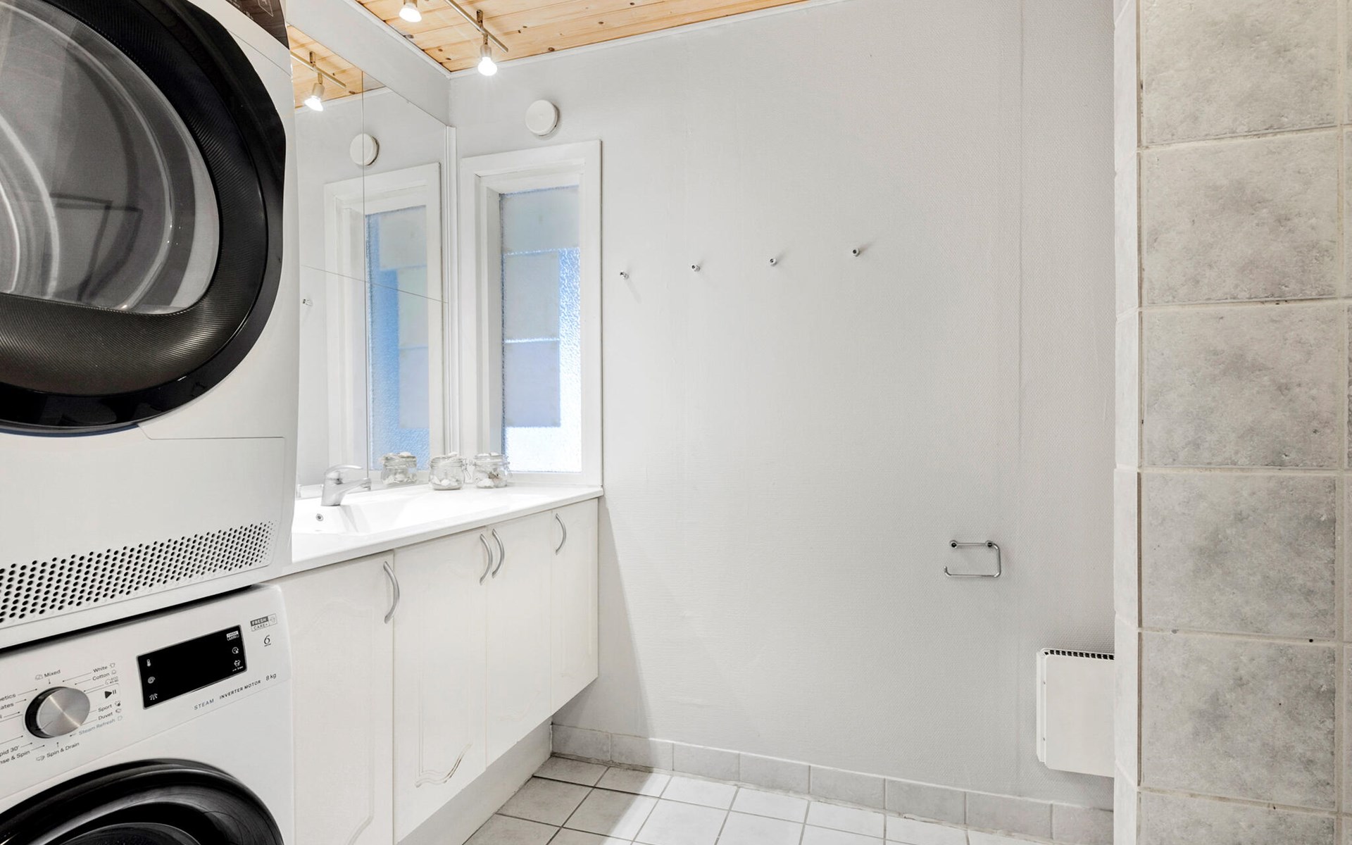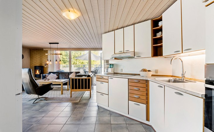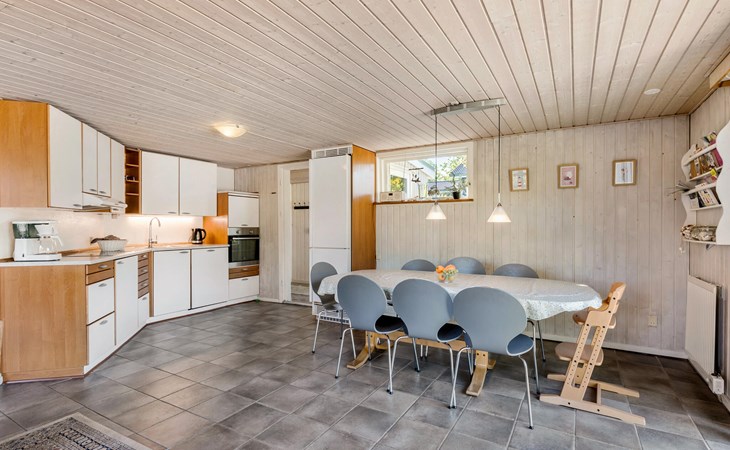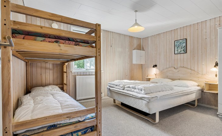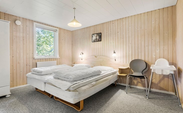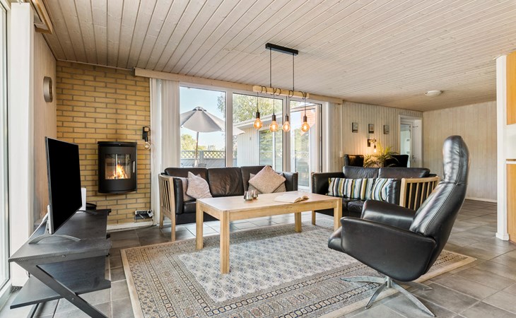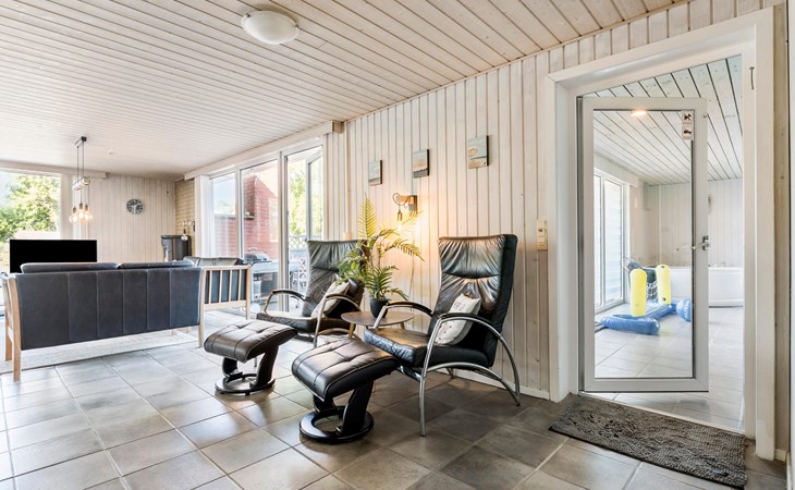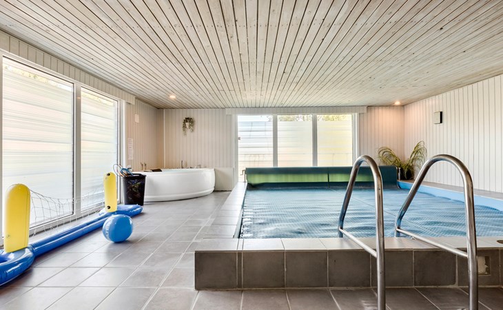 On a natural plot close to the Limfjord and the small town of Halpsund with several restaurants, a marina and a beautiful golf course lies this renovated vacation home with an enclosed sun yard. On the lawn in front of the house is plenty of space to play and romp. From the living room you enter the pool area with a whirlpool for two, a sauna and a separate shower. In one of the bathrooms there is a washing machine and dryer. The house is furnished with three bedrooms with double beds. In the largest room there is also a bunk bed. The well-equipped kitchen is open to the living room. The house is heated with solar energy.