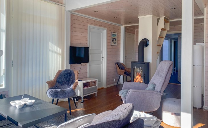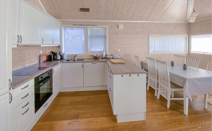 Inside this house you will find a bright, cosy ambience with large windows that allow warm daylight to flood in. The living area with fireplace invites you to relax after a day outdoors. Lean back on the comfortable sofa with a glass of wine, have a relaxed chat or listen to your favourite music. In the modern, open-plan kitchen, you can cook and eat together while your gaze wanders over the expansive natural surroundings.
