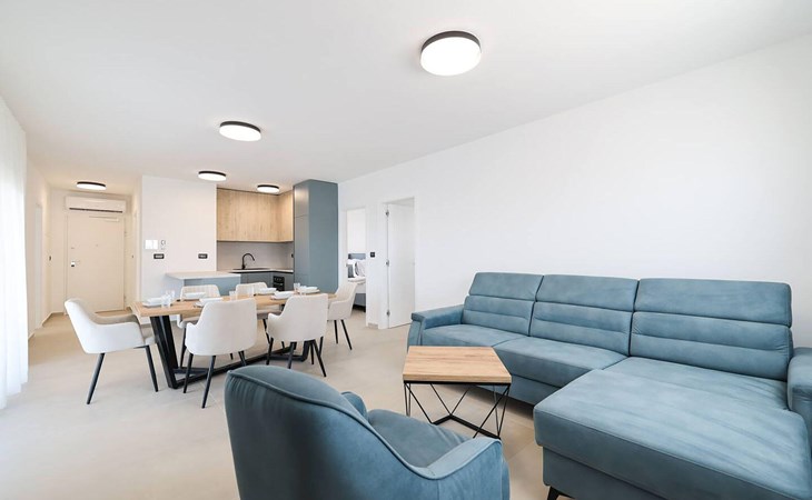 Enjoy a relaxing holiday in your bright, modern apartment that combines comfort, tranquillity and proximity to the beach. This accommodation offers everything you need for a carefree holiday with the whole family. Step inside and be welcomed by the clean, modern interior. Make yourself comfortable on the large sofa and enjoy time together in the open-plan living area. Prepare your favourite dishes in the fully equipped kitchen with high-quality appliances and take a seat at the stylish dining table.