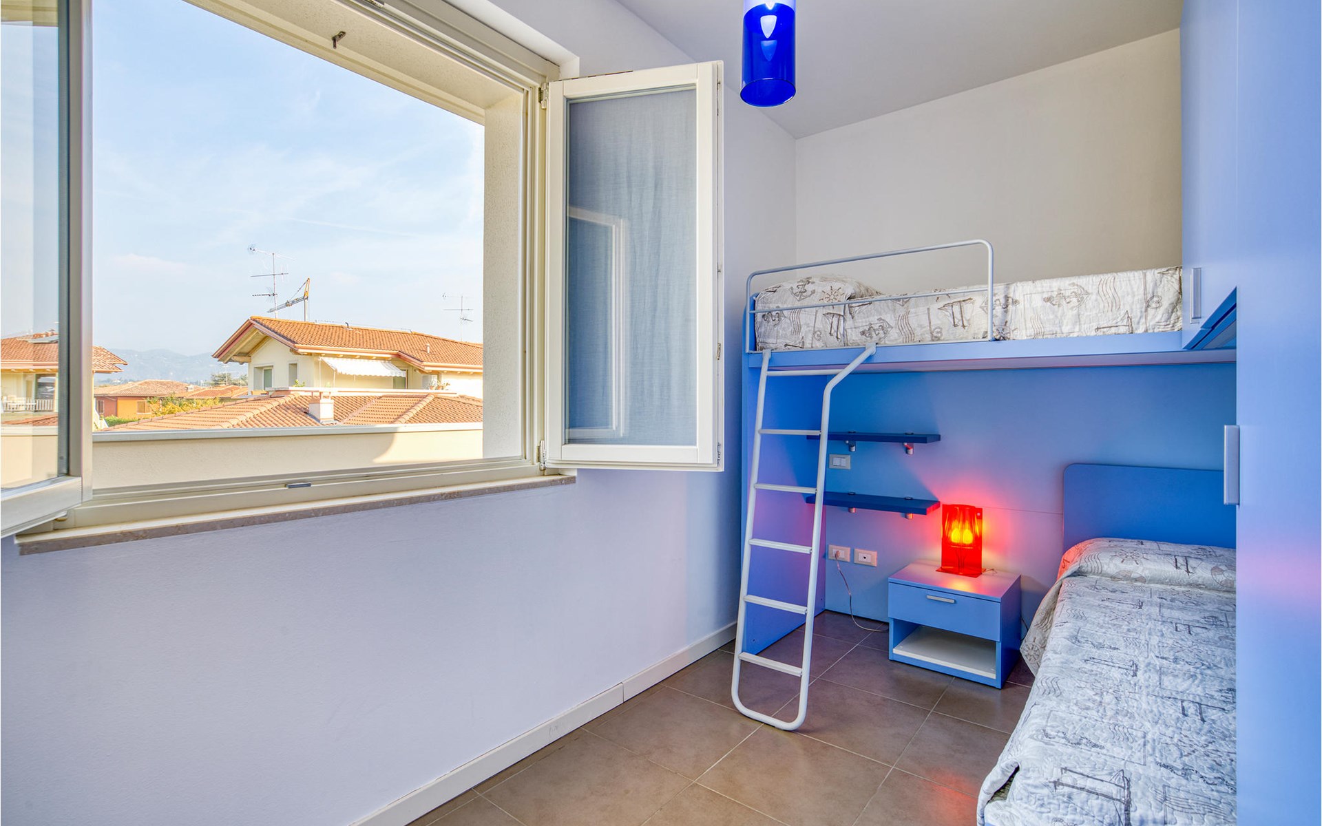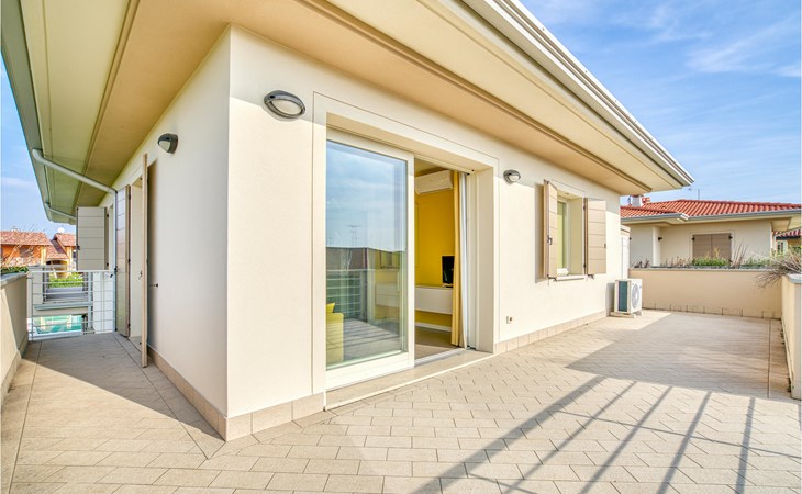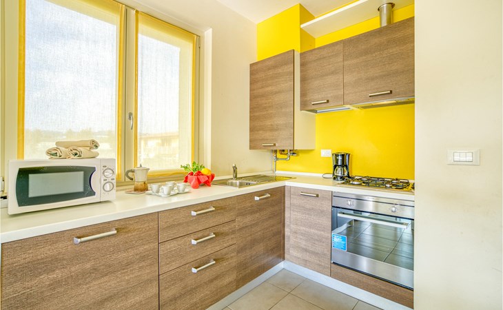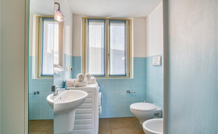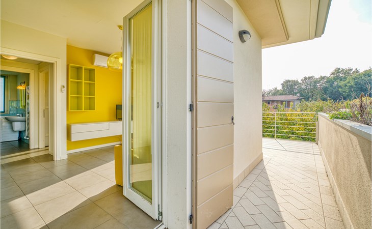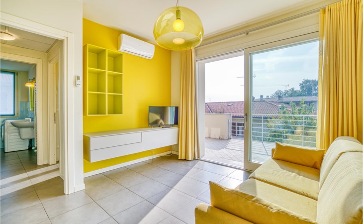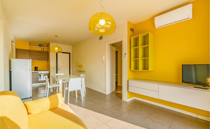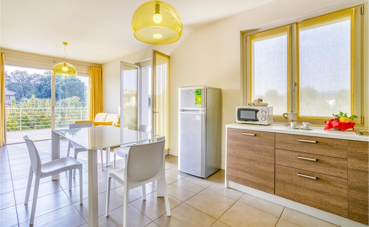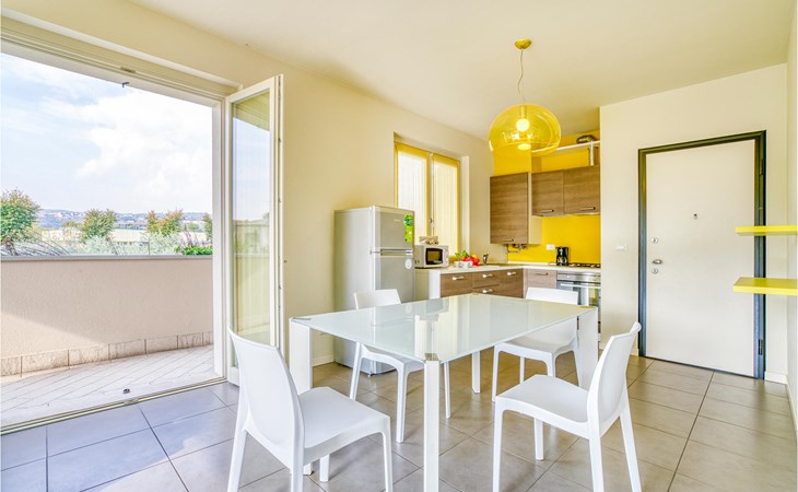 If you are looking for relaxation and enjoyment in the north of Italy, this vacation apartment might be something for you. Located not far from the southwestern shore of Lake Garda, this apartment offers you an ideal place for a relaxing and peaceful time for you and your family. The apartment is decorated in bright yellow and blue colors and from the living room you have access to the terrace, where you can relax or enjoy your morning coffee. If you go down the stairs, you will come around the corner to a larger shared terrace where you can jump into the pool or lay on the deck chairs and relax.