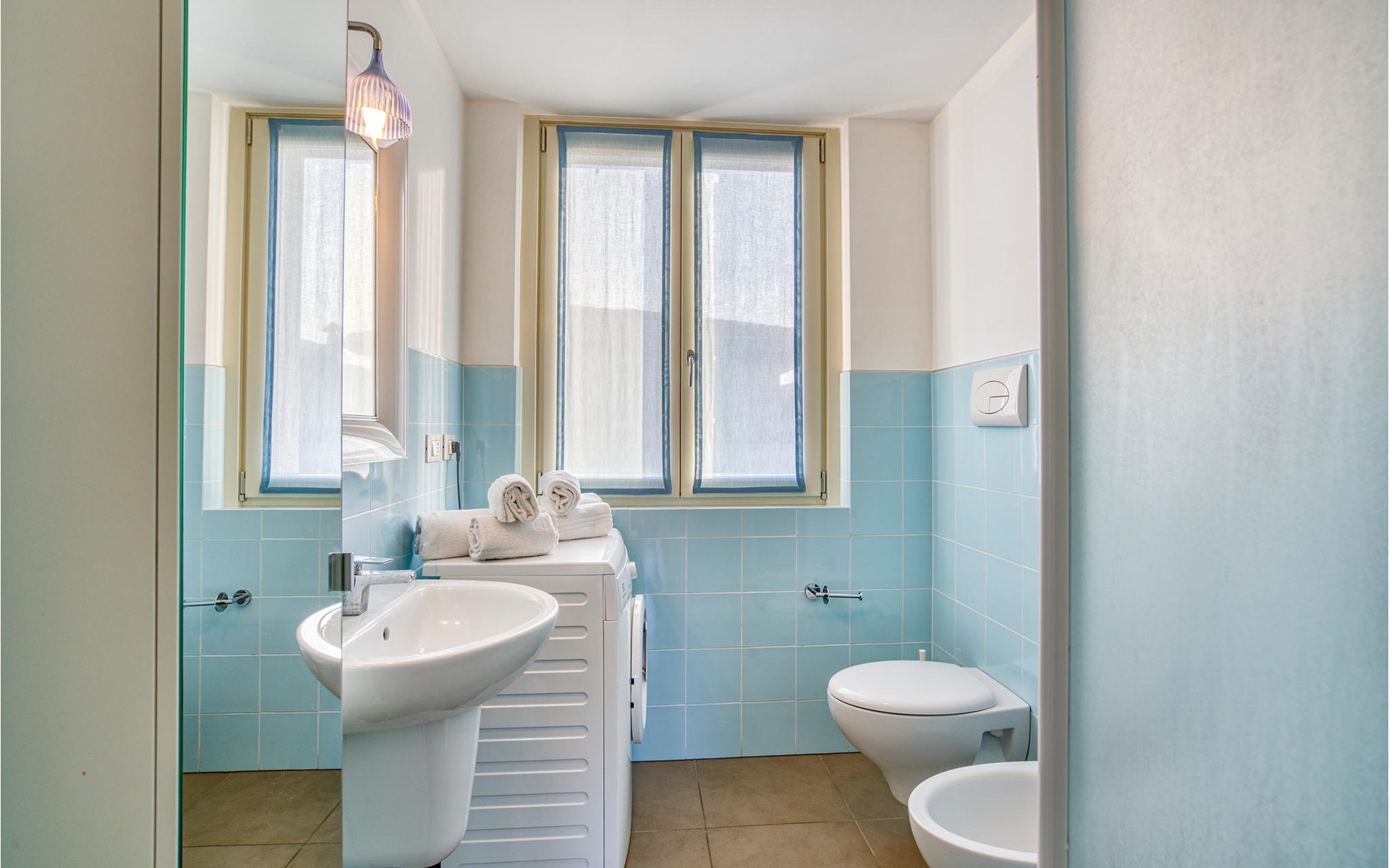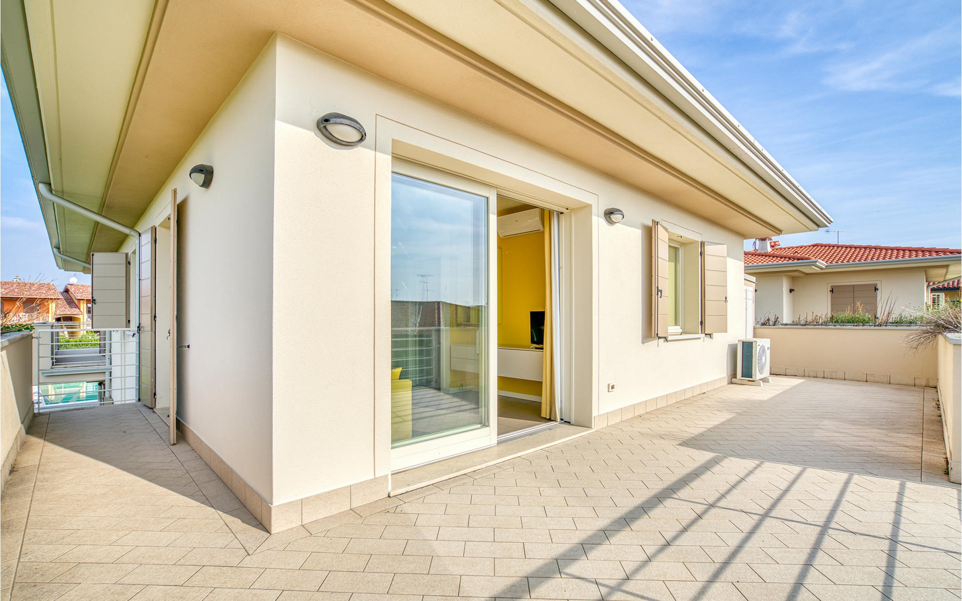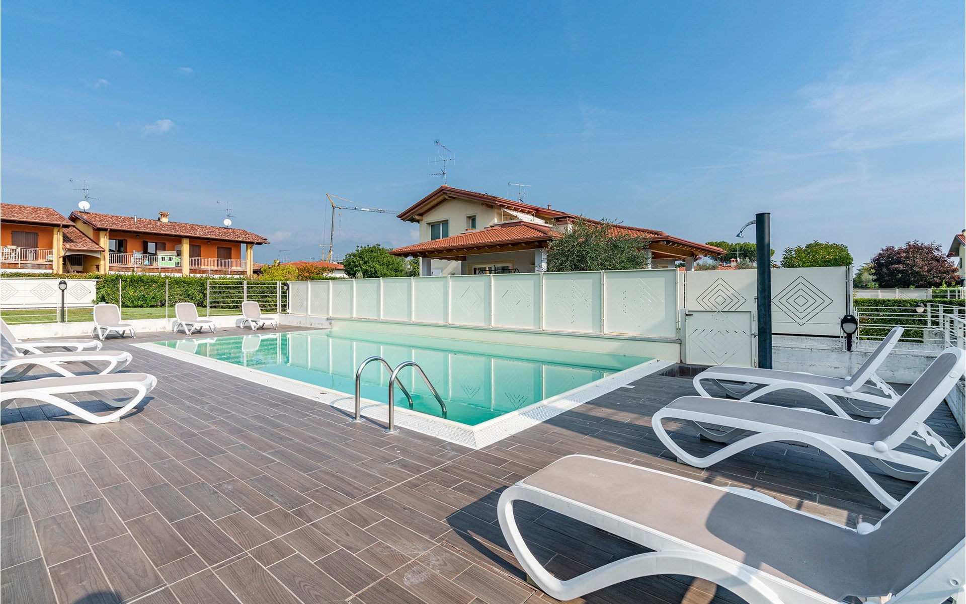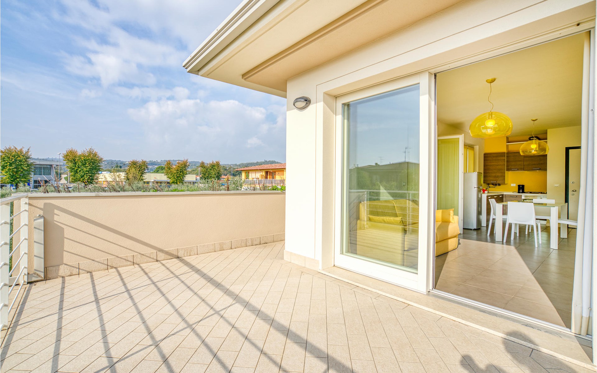 If you are looking for relaxation and enjoyment in the north of Italy, this vacation apartment might be something for you. Located not far from the southwestern shore of Lake Garda, this apartment offers you an ideal place for a relaxing and peaceful time for you and your family. The apartment is decorated in bright yellow and blue colors and from the living room you have access to the terrace, where you can relax or enjoy your morning coffee. If you go down the stairs, you will come around the corner to a larger shared terrace where you can jump into the pool or lay on the deck chairs and relax.