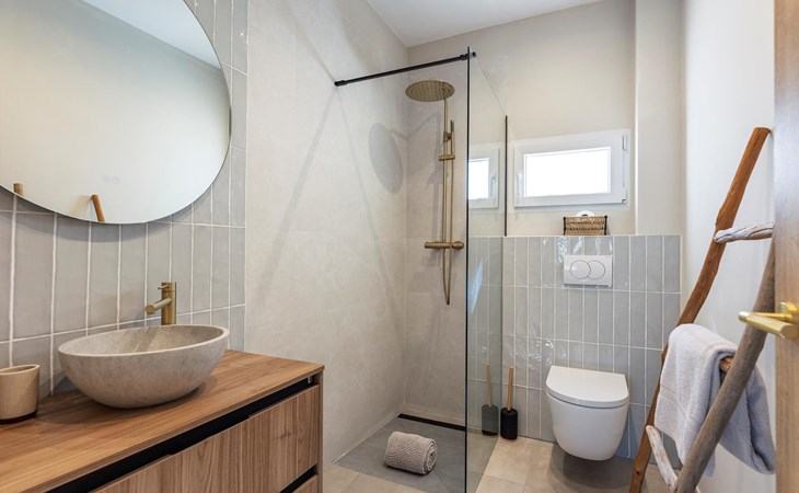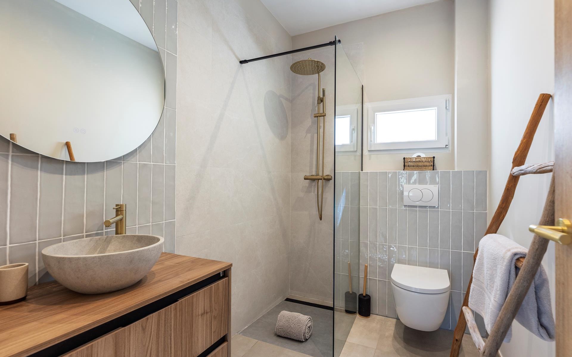 2 bathrooms, each with a single washbasin, shower, and toilet