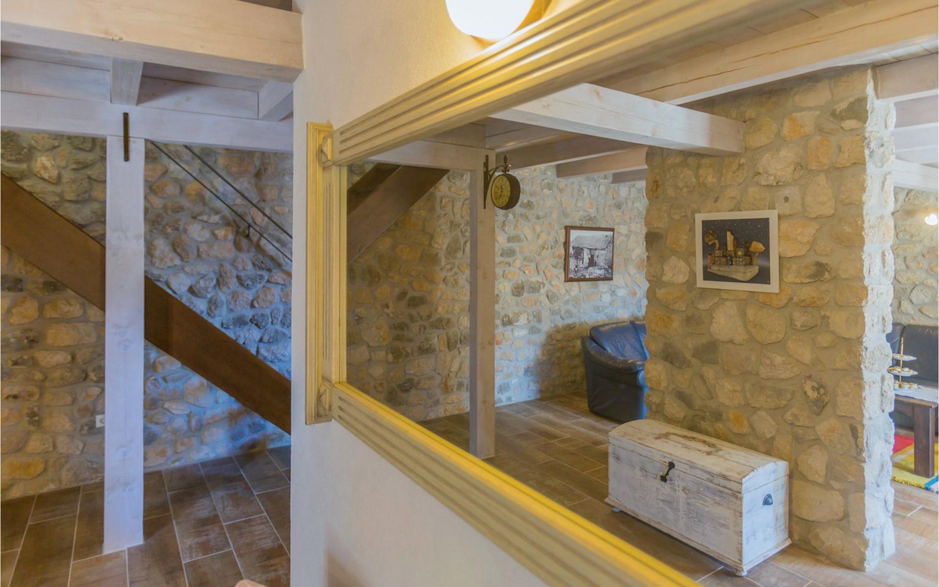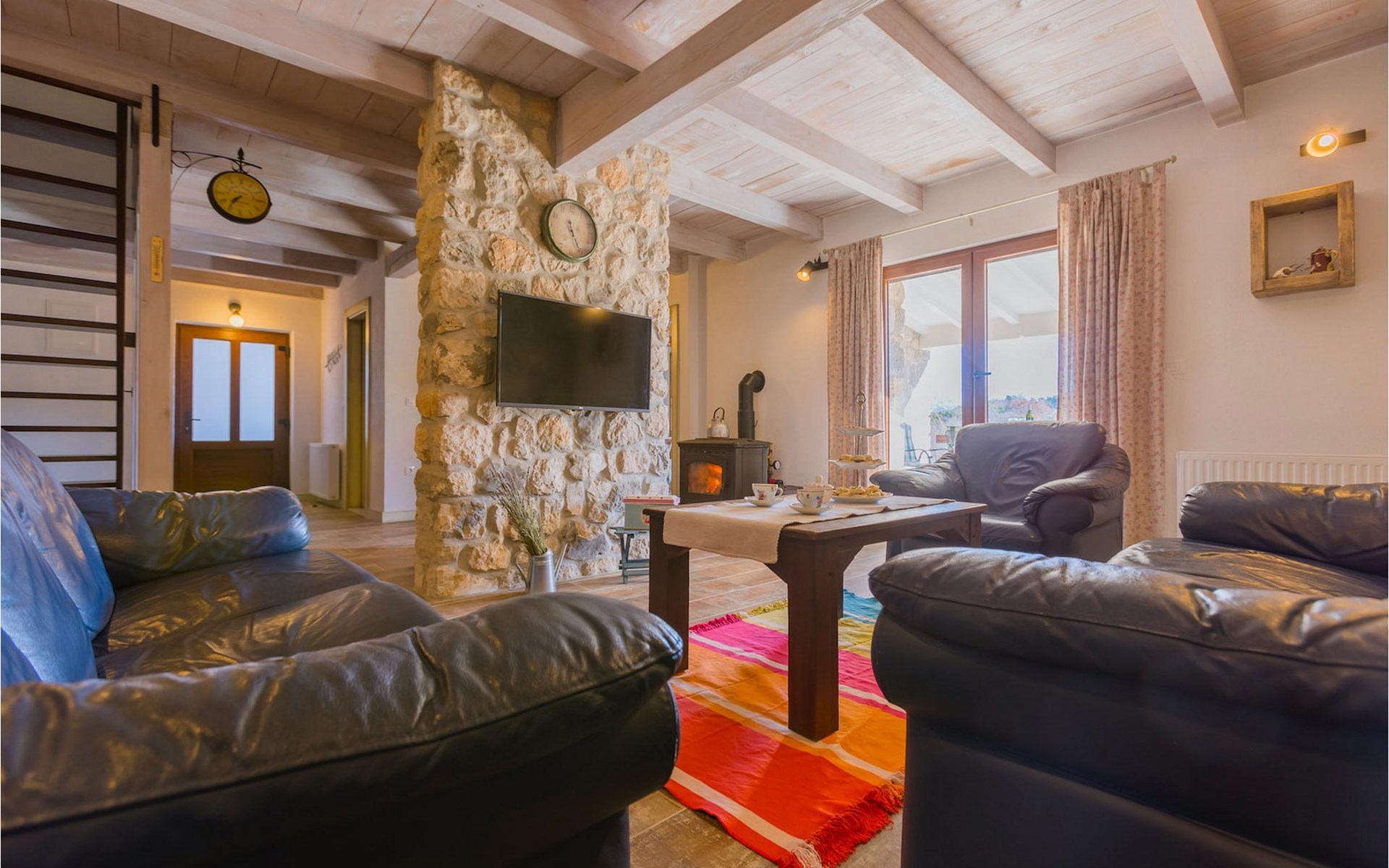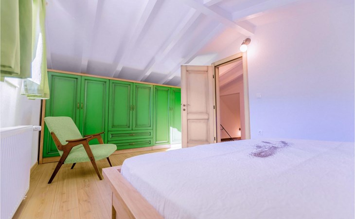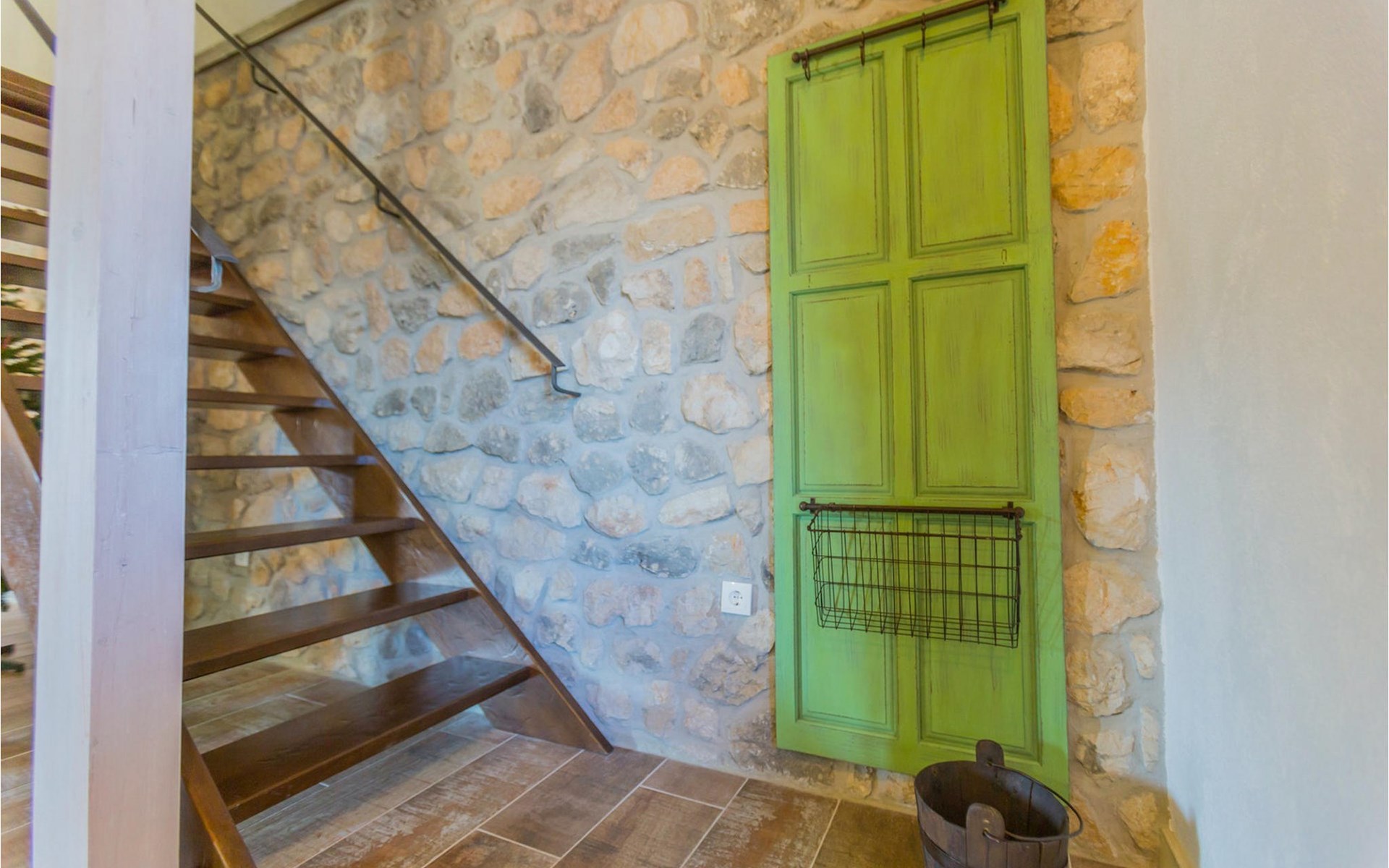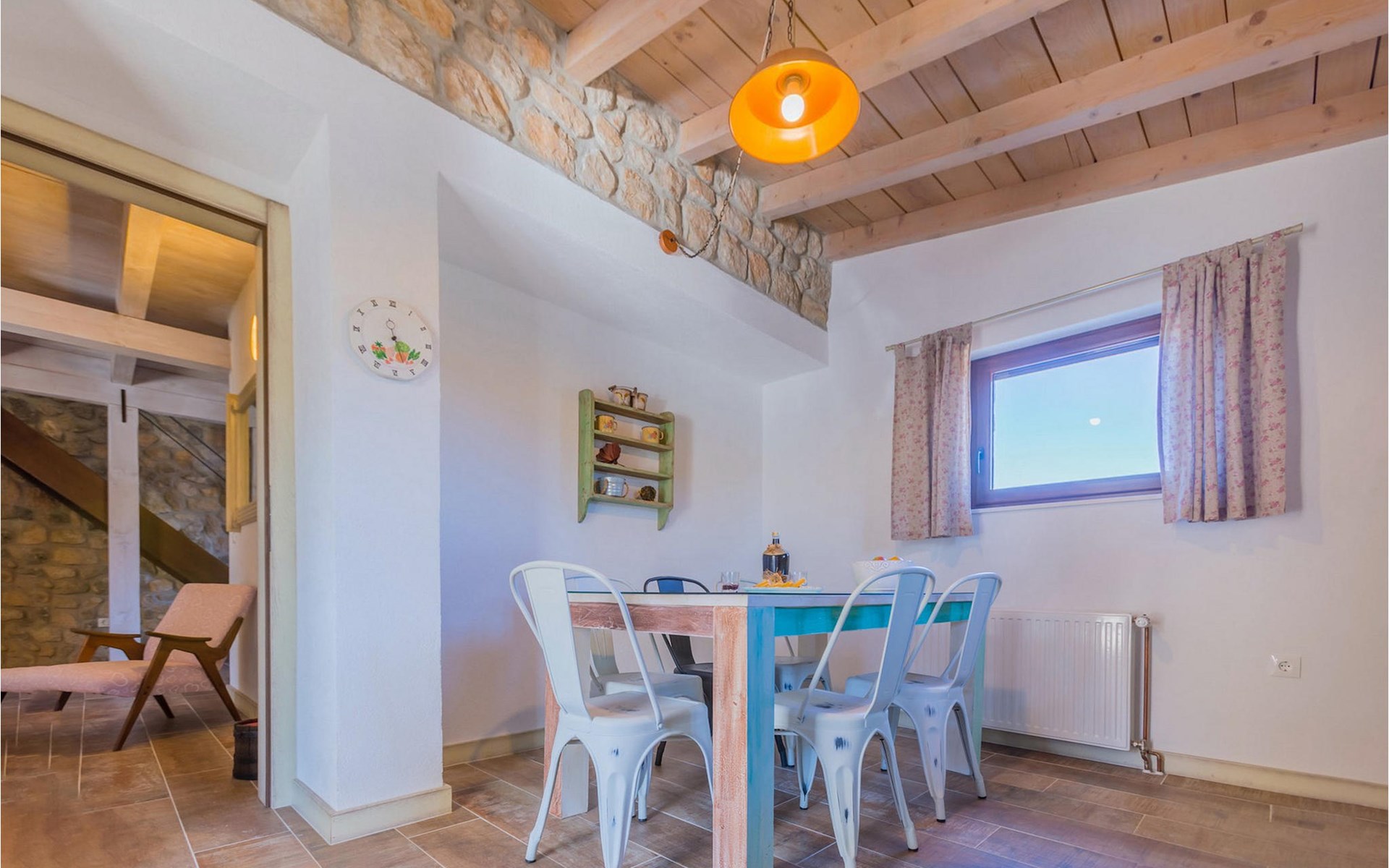 From the terrace you have direct access to the living room with traditional wooden beamed ceilings, open stone walls and a fireplace, which together create a warm, authentic atmosphere. It is clear from the many thoughtful and colorful details that this villa has been furnished with care to make you feel welcome. The living room is connected to the well-equipped, vintage kitchen with a beautiful dining area. The kitchen invites you to enjoy local food made from fresh local produce, which you can buy directly from the lovely villa owners. There is also a bathroom with a bathtub on the ground floor. On the second floor you will find three comfortable, individually furnished bedrooms (2 with double beds and 1 with 2 single beds).