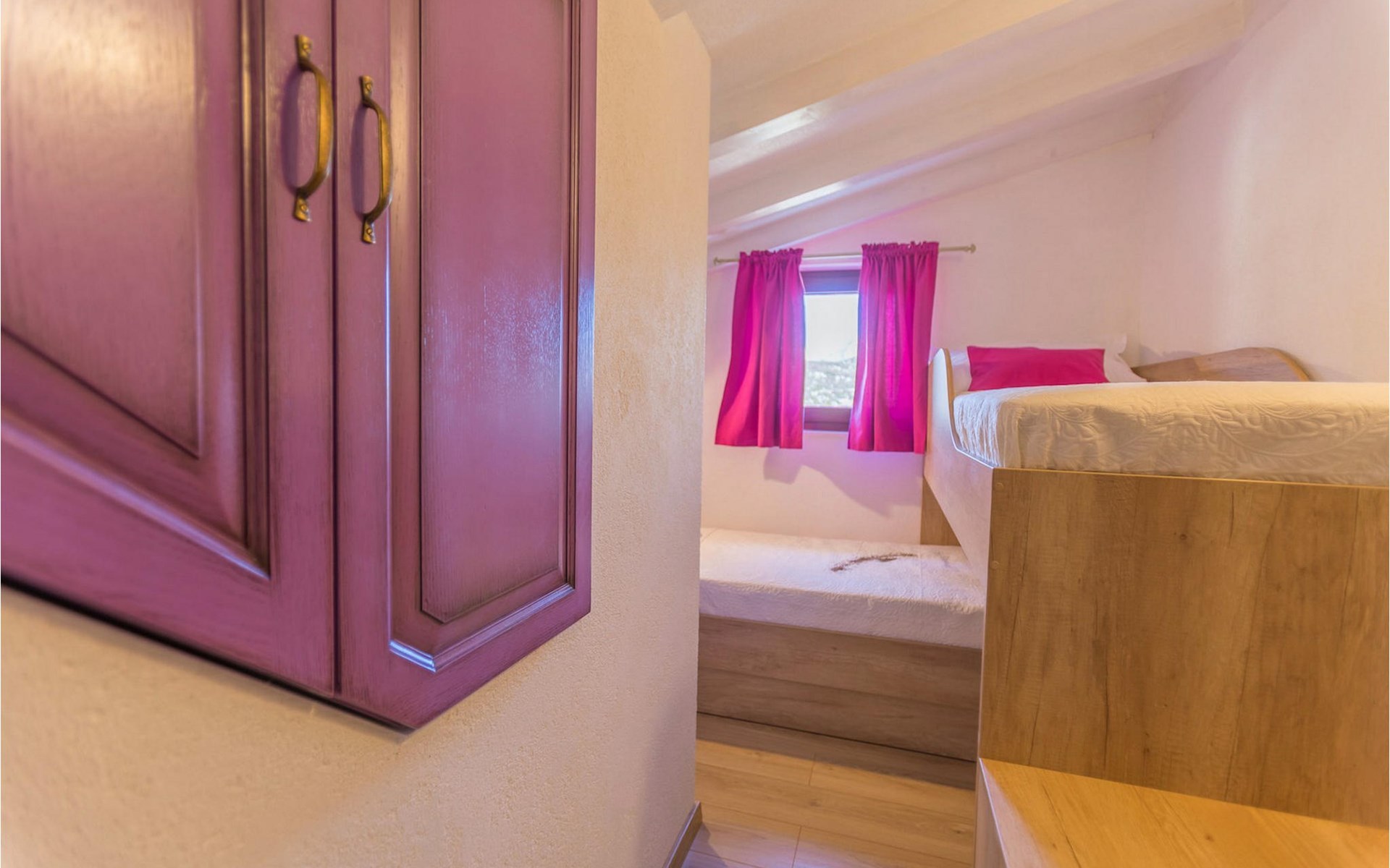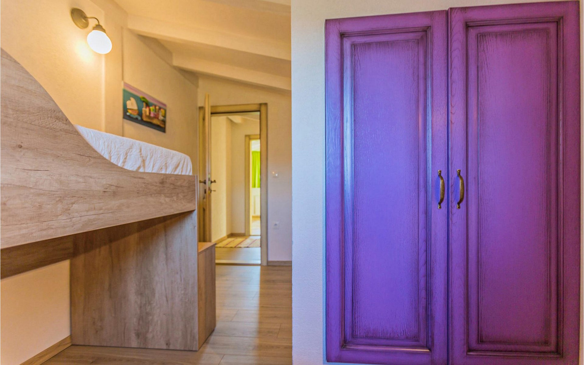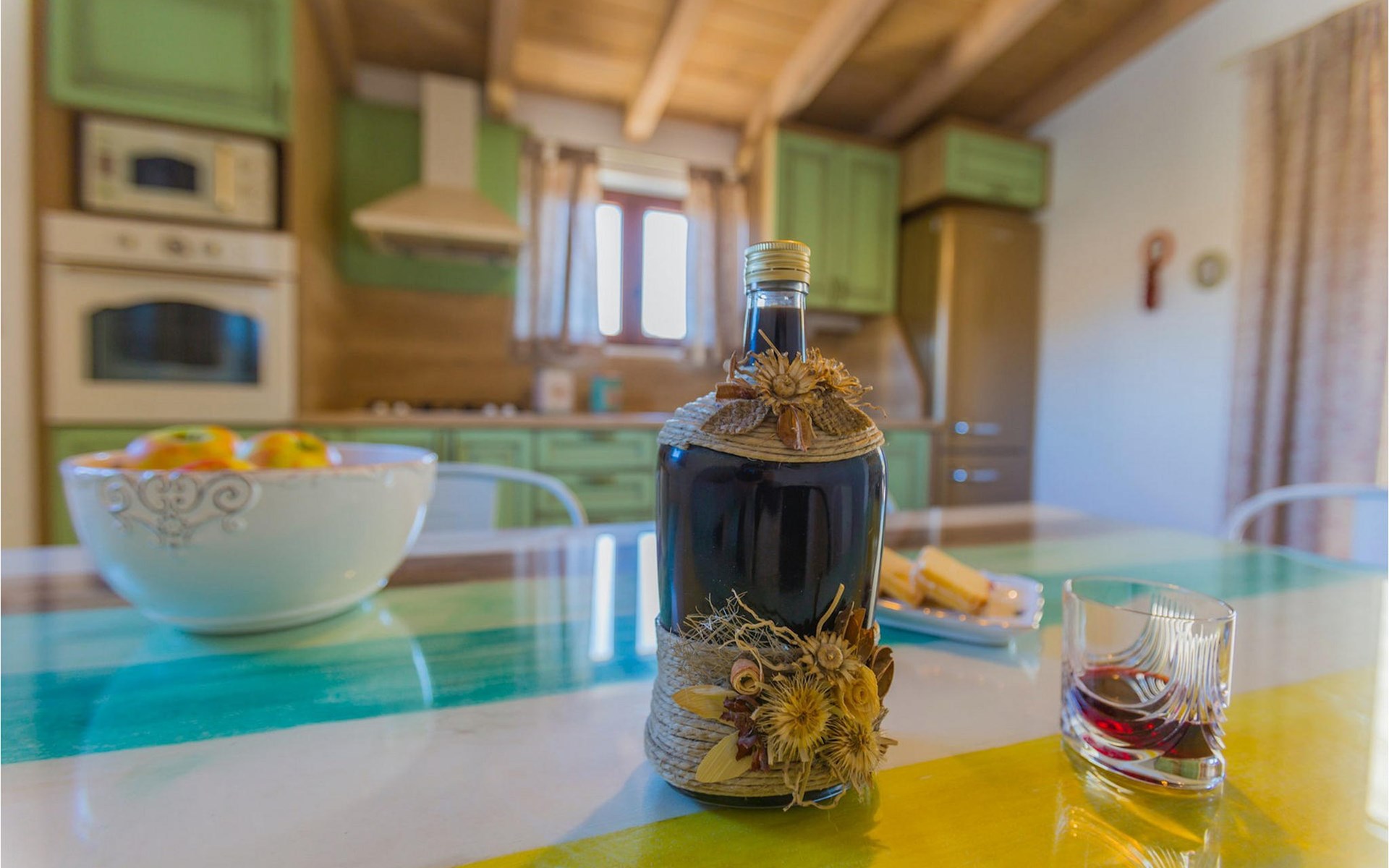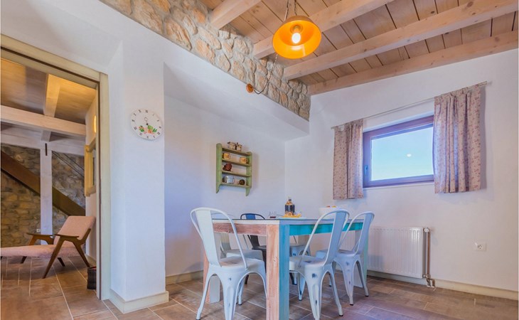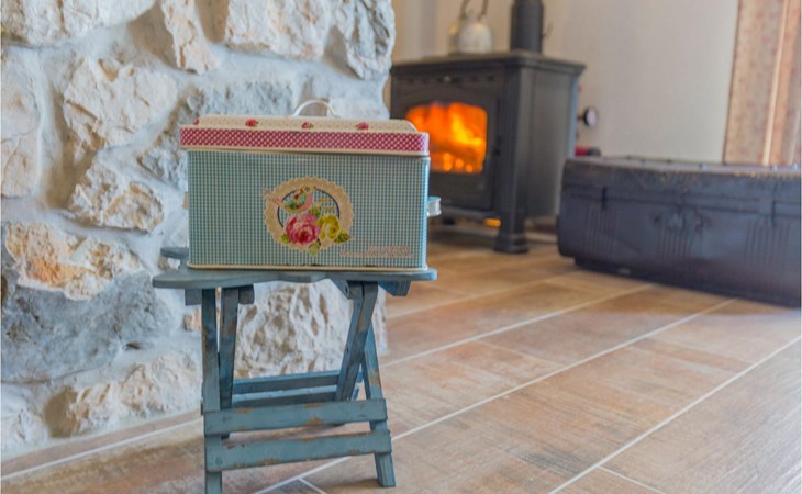 From the terrace you have direct access to the living room with traditional wooden beamed ceilings, open stone walls and a fireplace, which together create a warm, authentic atmosphere. It is clear from the many thoughtful and colorful details that this villa has been furnished with care to make you feel welcome. The living room is connected to the well-equipped, vintage kitchen with a beautiful dining area. The kitchen invites you to enjoy local food made from fresh local produce, which you can buy directly from the lovely villa owners. There is also a bathroom with a bathtub on the ground floor. On the second floor you will find three comfortable, individually furnished bedrooms (2 with double beds and 1 with 2 single beds).