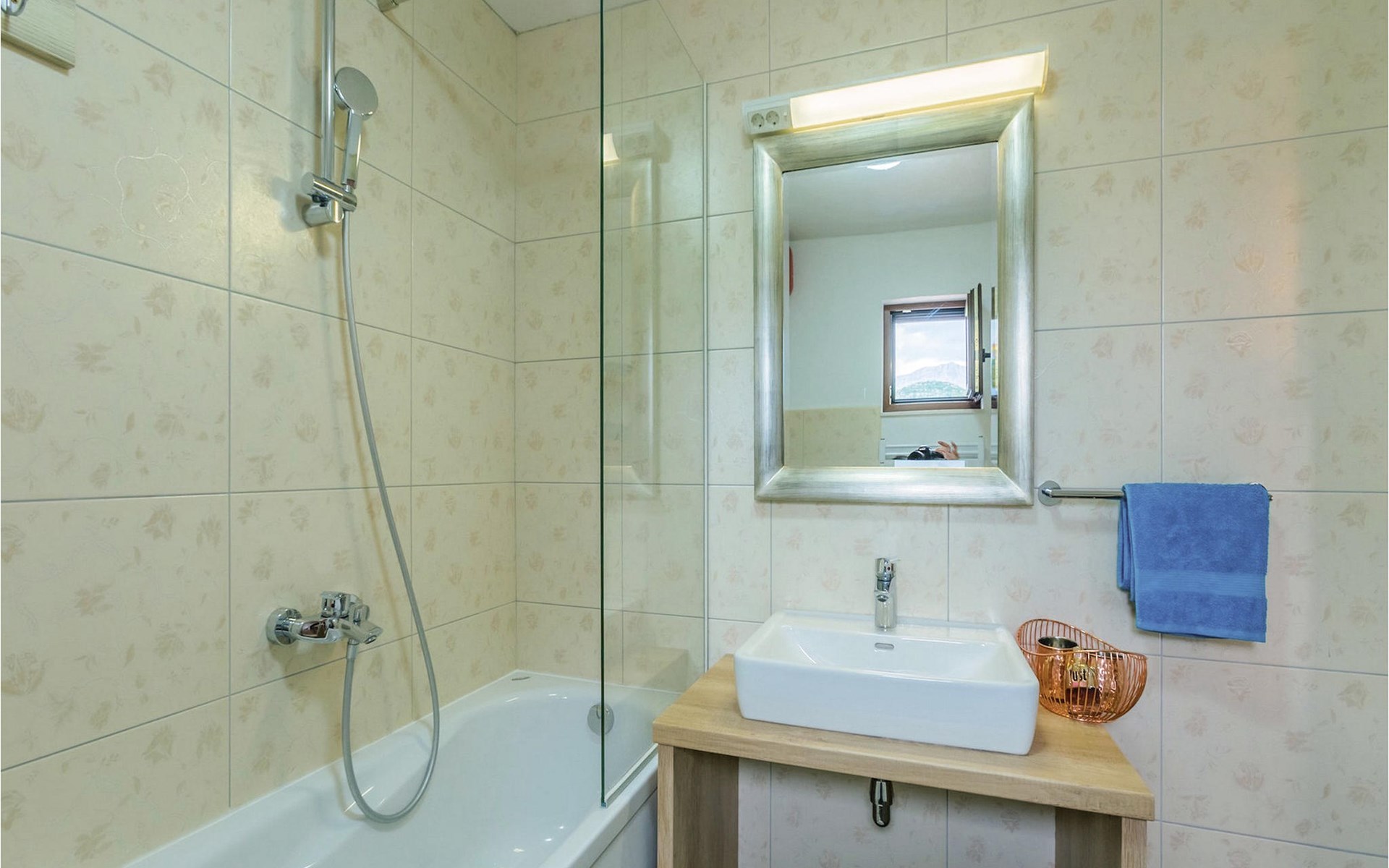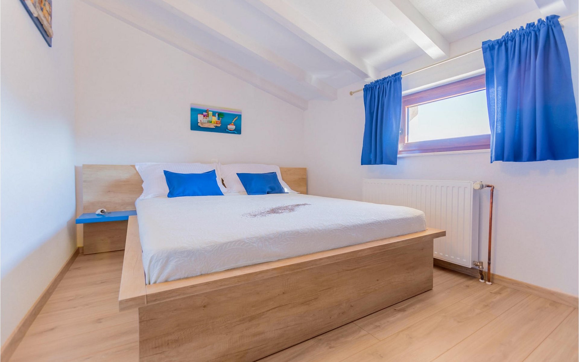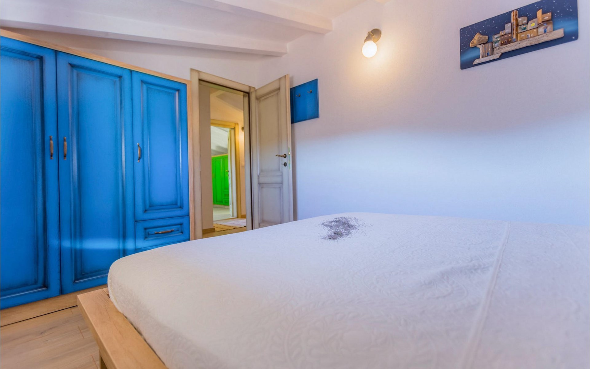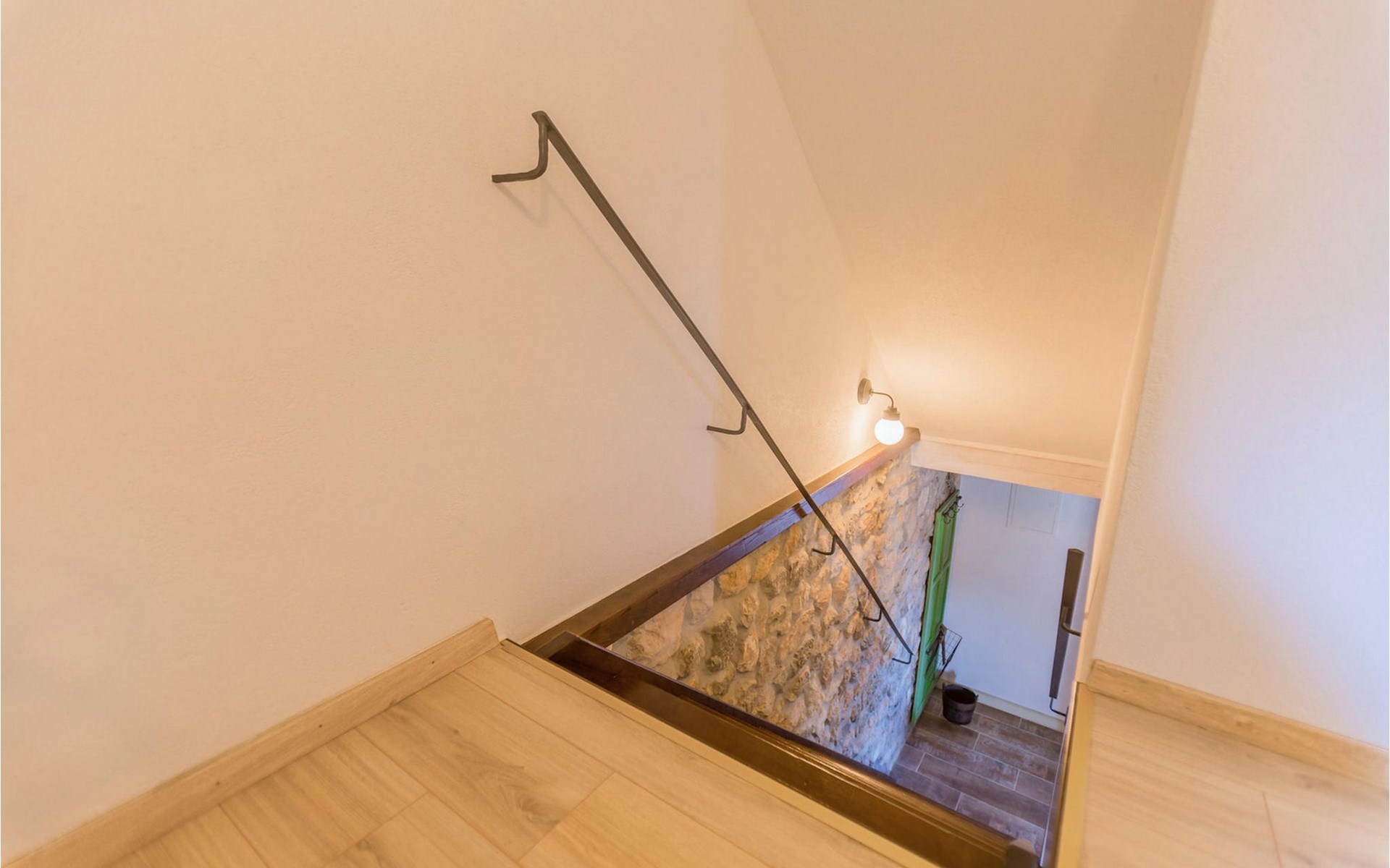 From the terrace you have direct access to the living room with traditional wooden beamed ceilings, open stone walls and a fireplace, which together create a warm, authentic atmosphere. It is clear from the many thoughtful and colorful details that this villa has been furnished with care to make you feel welcome. The living room is connected to the well-equipped, vintage kitchen with a beautiful dining area. The kitchen invites you to enjoy local food made from fresh local produce, which you can buy directly from the lovely villa owners. There is also a bathroom with a bathtub on the ground floor. On the second floor you will find three comfortable, individually furnished bedrooms (2 with double beds and 1 with 2 single beds).