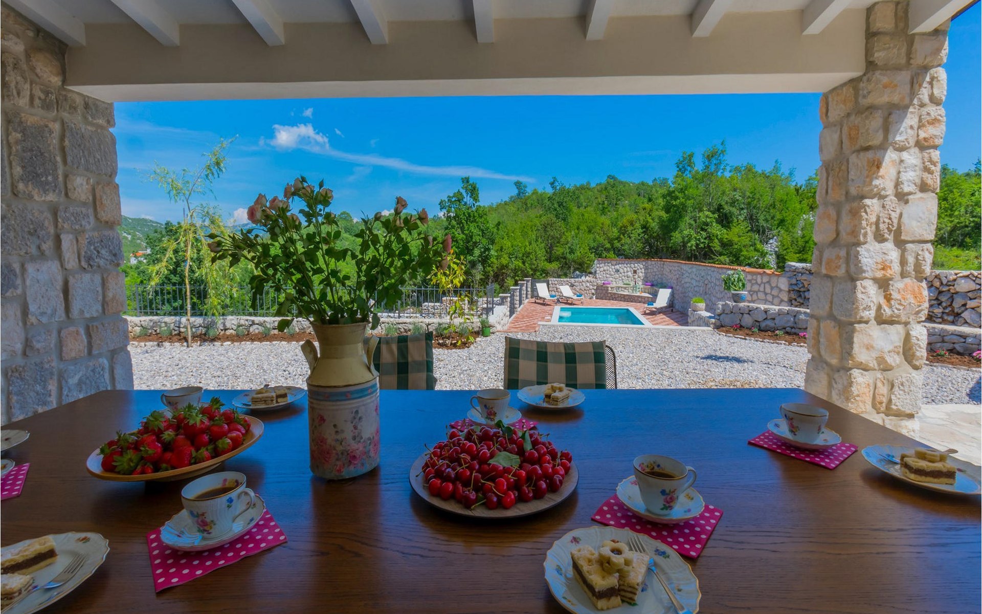 True to its name, the villa is surrounded by numerous garden areas, with a colorful array of Mediterranean herbs, seasonal vegetables and fruit at your disposal, of course. At the center, however, is the incredibly enticing private pool, surrounded by a beautiful stone terrace with stunning views of the mountains, inviting you to relax and sunbathe. A few steps up is the shaded outdoor dining area, with a traditional built-in barbecue. Throw a few steaks on the barbecue, enjoy a cold drink and relax with your family.