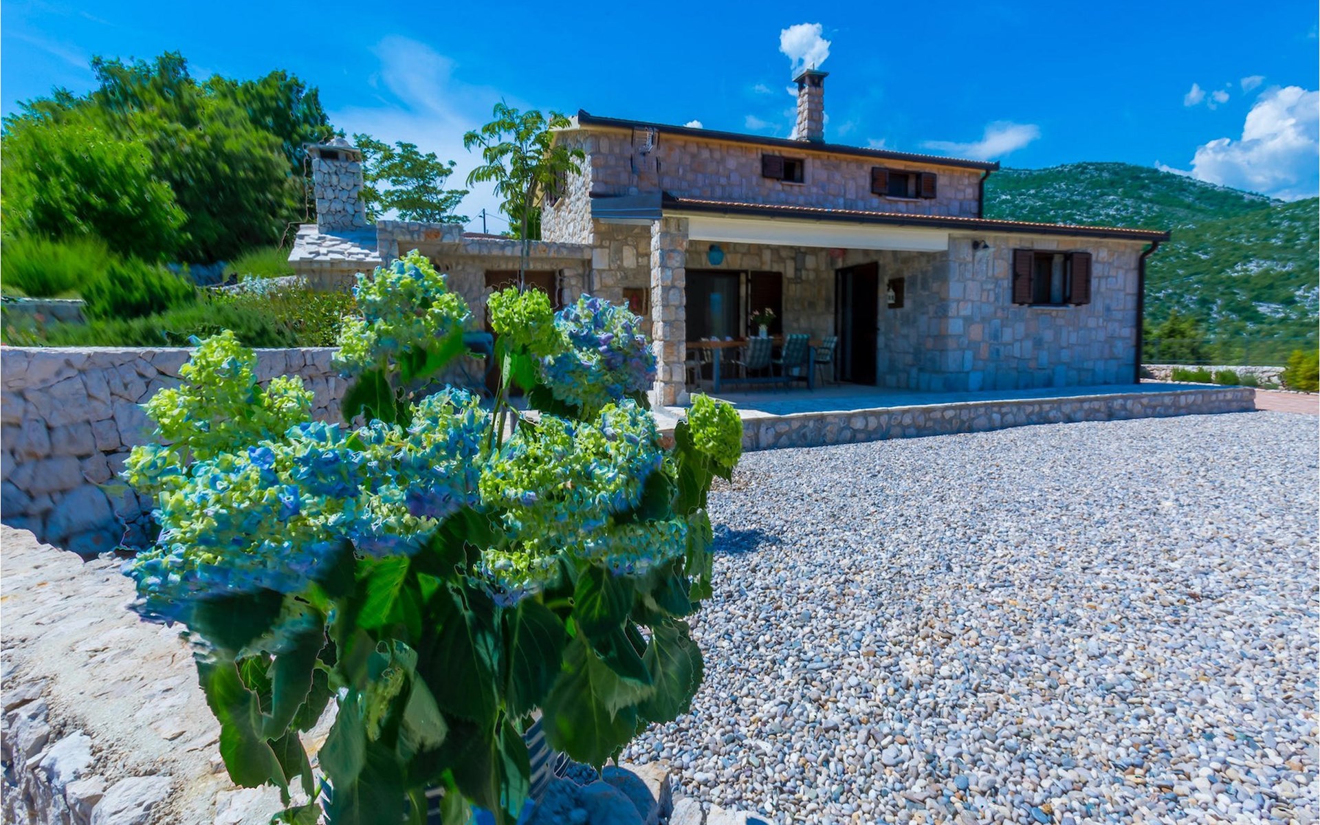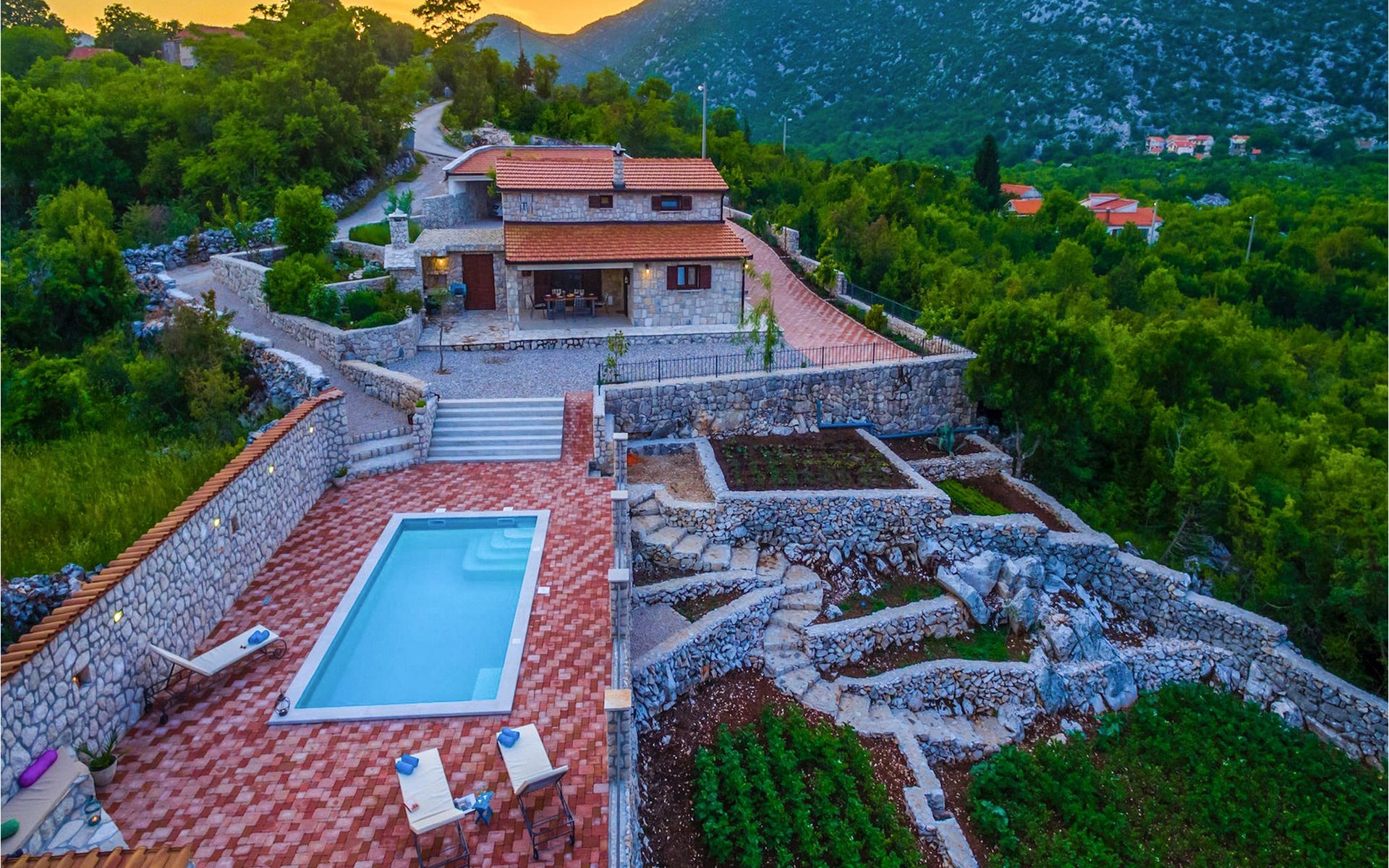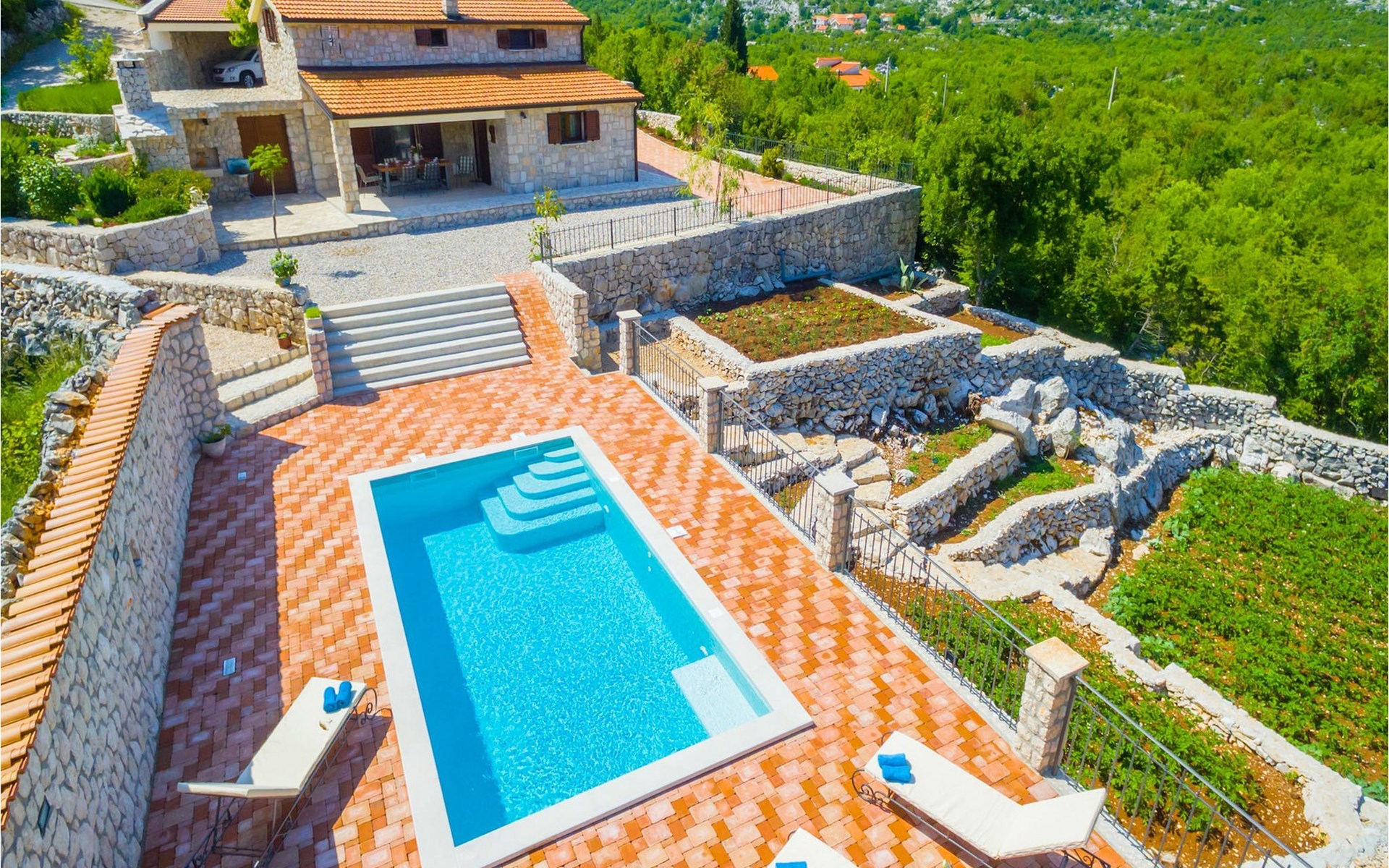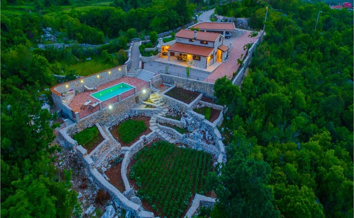 Villa Gardens is located in the small village of Duge Njive immersed within the spectacular karst landscape typical for the Dalmatian hinterland. There is a local restaurant at only 500 m from the villa, offering traditional spit roasted lamb and delicious homemade ham and cheese. For a larger variety of restaurants, bars and stores head to Vrgorac (cca. 20 km). This small town boasts rich cultural and gastronomic heritage which can be witnessed in the beautiful ethno-villages and agrotourisms of the area. The highlight is, however, the nearby Makarska Riviera, with its heavenly beaches, fragrant pinewoods and the stunning Biokovo Mountain towering above the glorious coastline. Lively nightlife and a rich variety of water sports are available here, as well as daily trips to the beautiful islands of Hvar and Brac. With mountains, sea and rivers side by side, this region is also a perfect playground for adventure enthusiasts.
