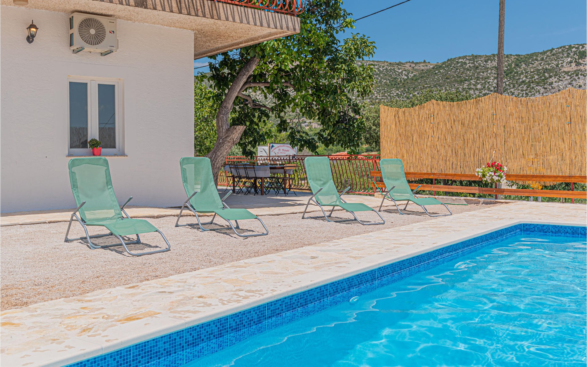 The common outdoor area invites you to get in touch with other guests and enjoy a delicious barbecue buffet in the shade of the tree, at the large dining table. Water fun is guaranteed for the little ones of the family in the large pool, while the adults can relax in the sun lounger.