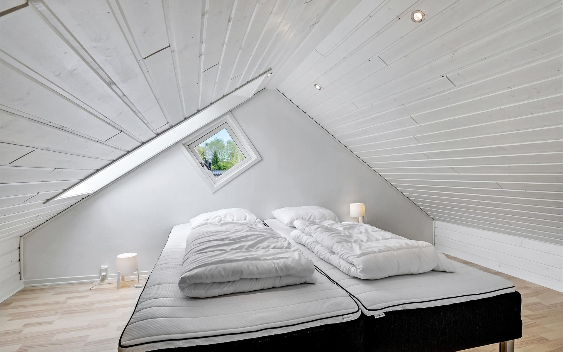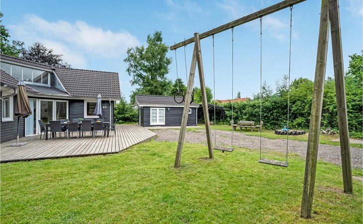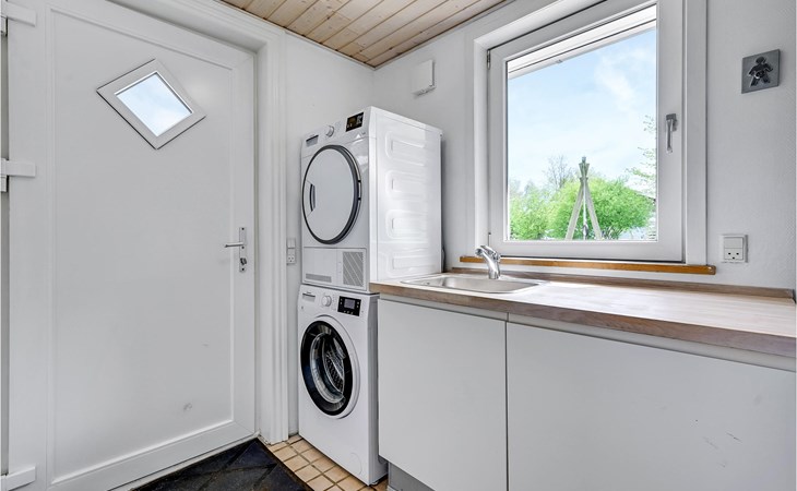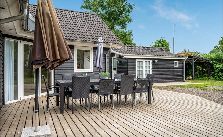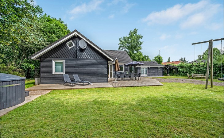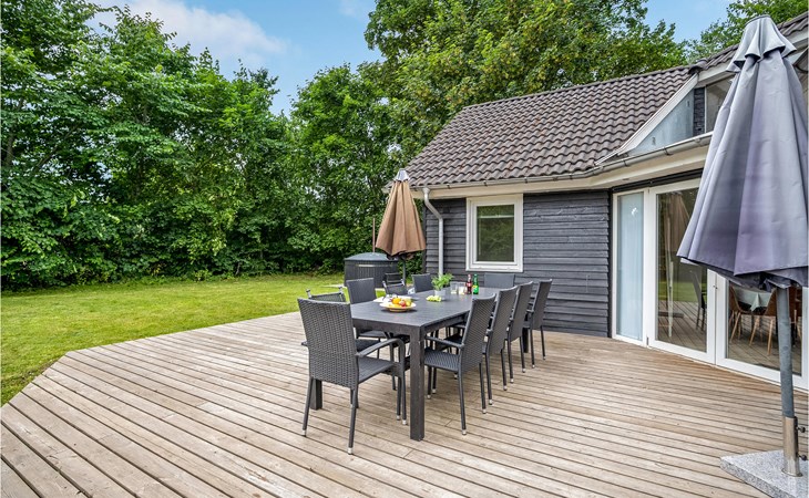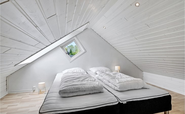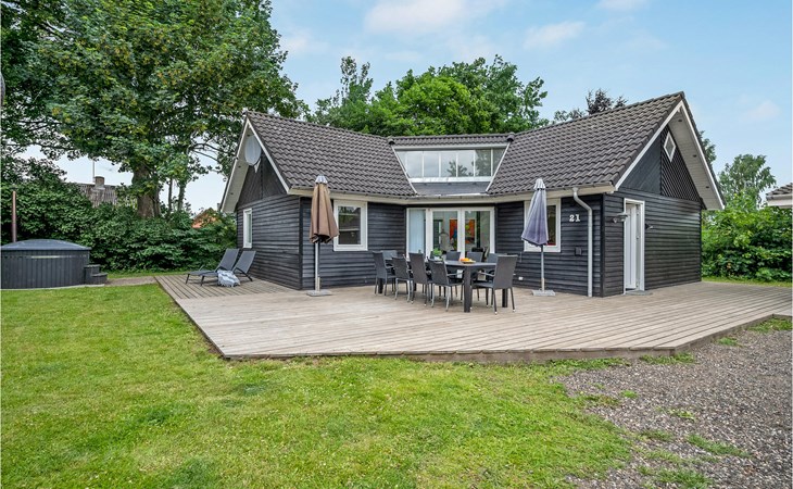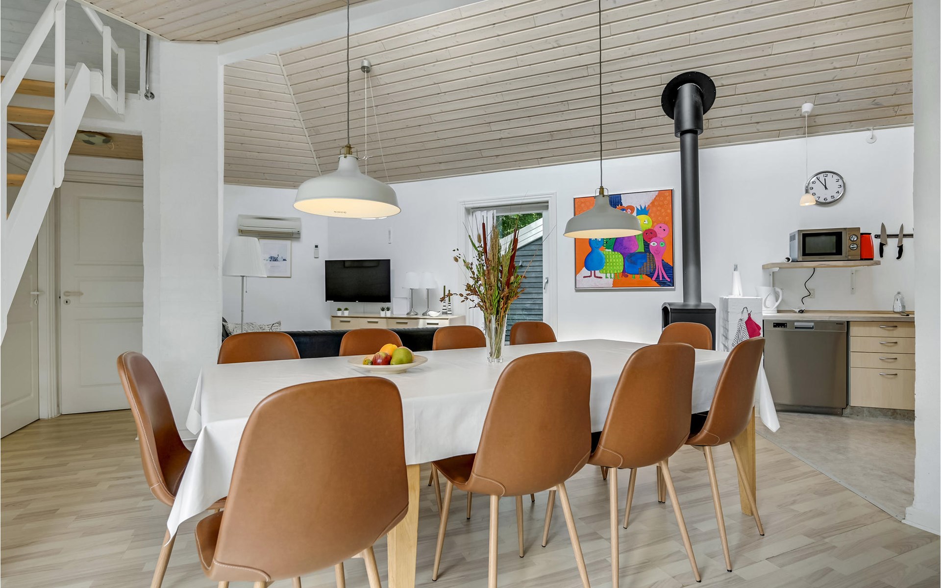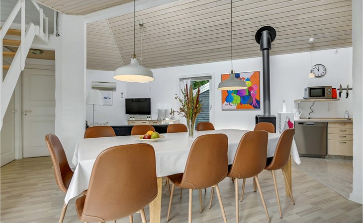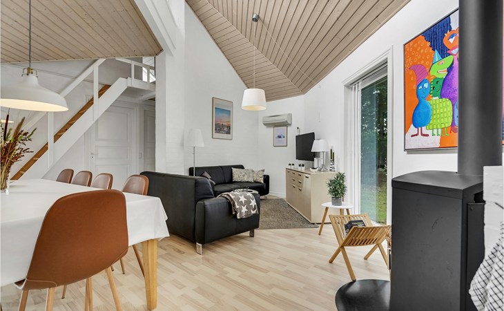 In a grown and established vacation home settlement is this vacation home with room for 10 people. It offers a beautiful living room with open roof ridge and large skylights that let in a lot of light during the day. The living room is open to the kitchen.