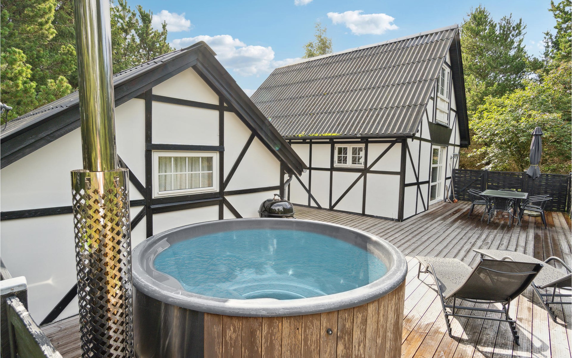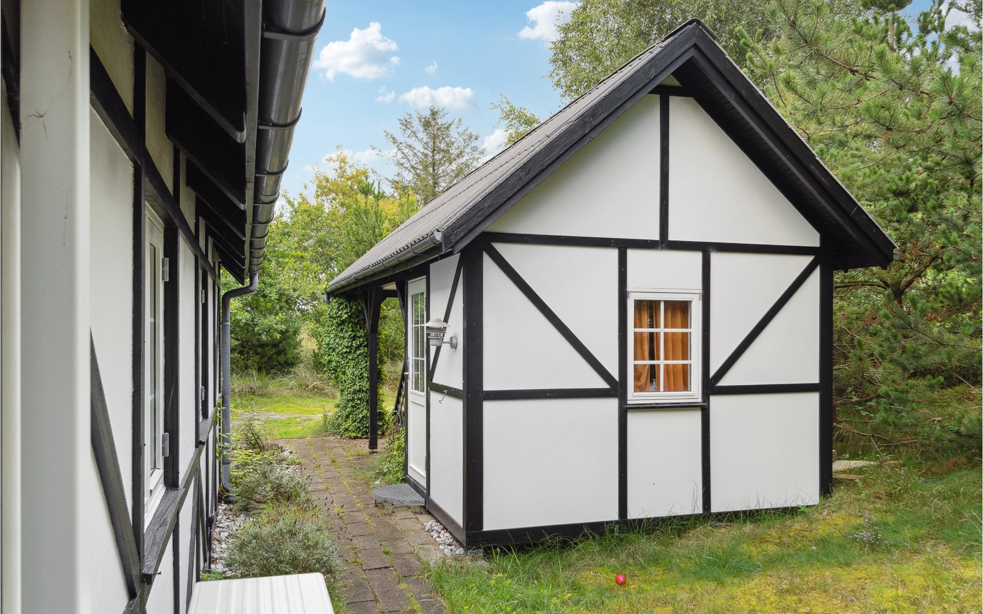 There is a private carport and the large plot is sheltered from view. There is also a heated outbuilding with a further bedroom.