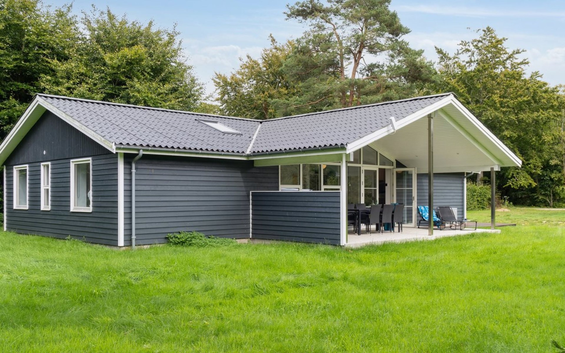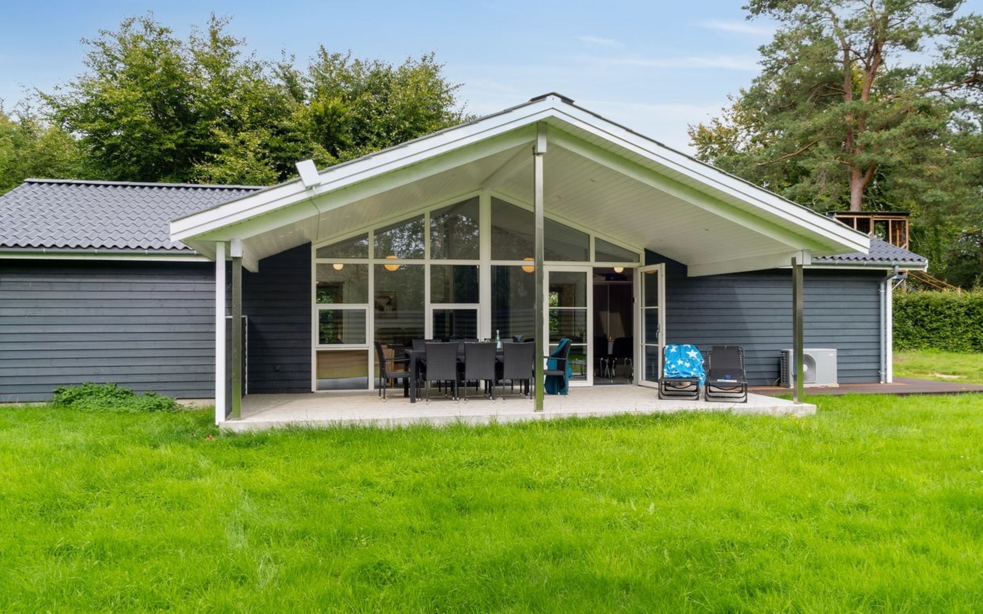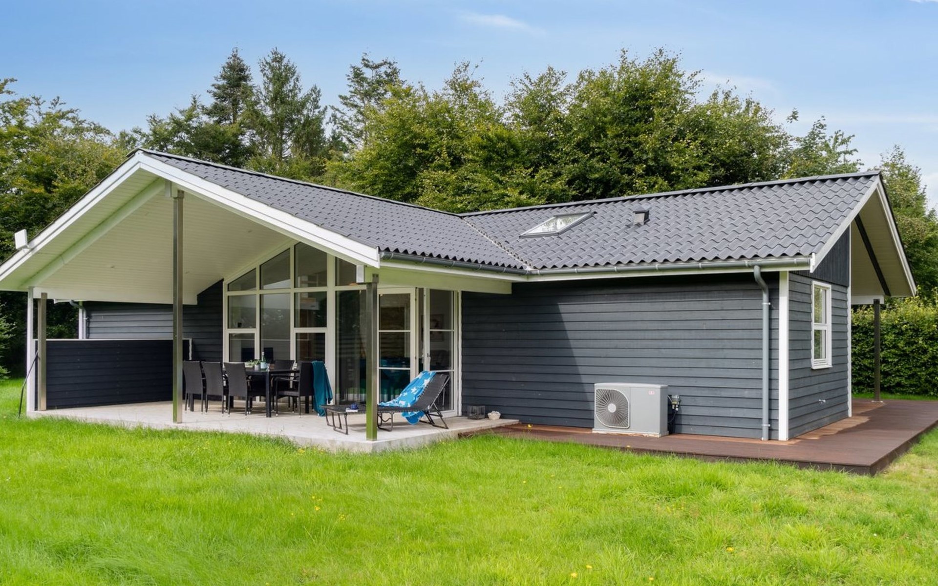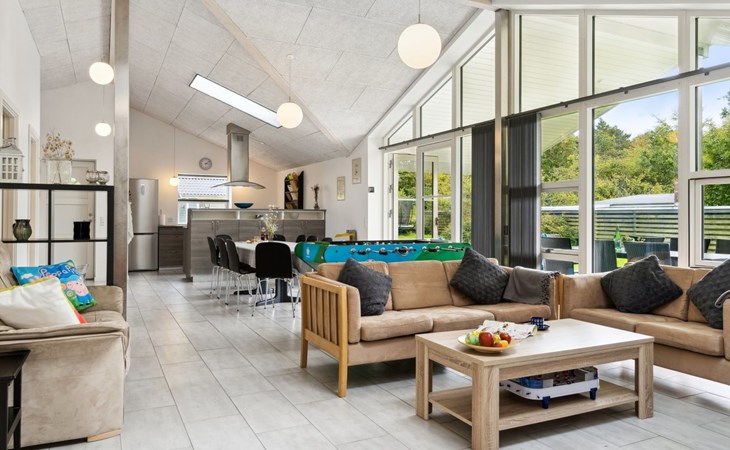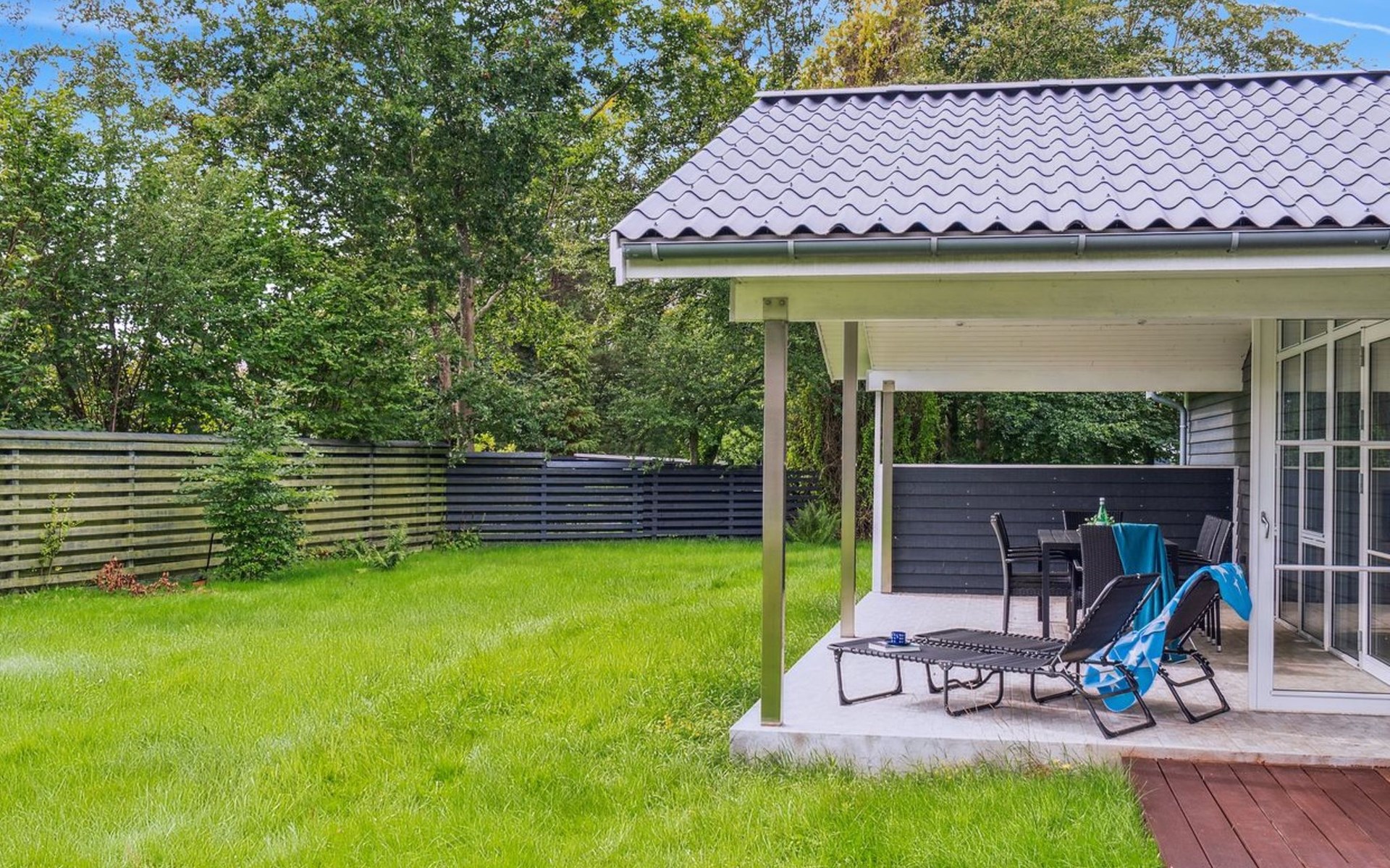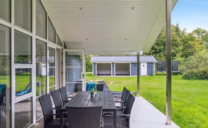 Single-family house, built in 2020. 1.3 km from the sea. Private: property 1'637 m2, well-kept garden. Terrace (15 m2), barbecue. In the house: sauna, trampoline, washing machine. Parking at the house. Carport. Grocery 600 m. Golf course 8.9 km. The owner does not accept any youth groups.