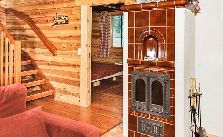 37 km to the north from Hämeenlinna, lake Iso-Roine 20 m (length 8 km, width 2 km), shallow bottom, pier. There is a steep stairs down to the shore in front of the cabin, nature trail to the pier, where you can swim. Near the pier, there is a small sand shore where the smallest members of the family can swim. The shore deepens fast. There is a shallow child-friendly sand beach within 200 m from the cabin (shared with neighboring cabins).