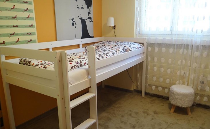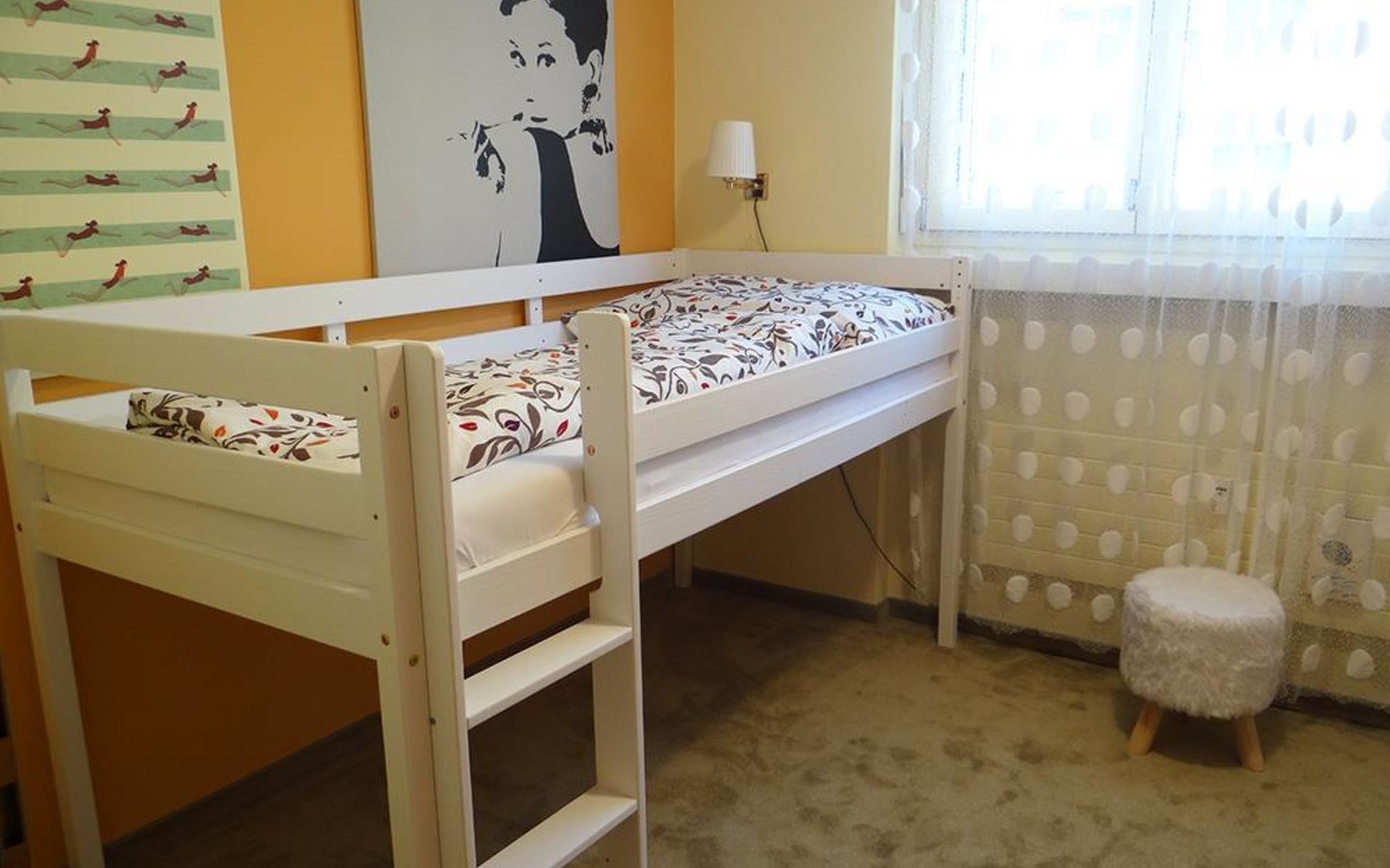 3-room apartment, 2nd floor: open kitchen, 1 bedroom with double bed, 1 bedroom with 2 single beds, living room, bathroom, separate WC, balcony.