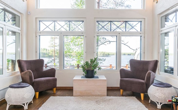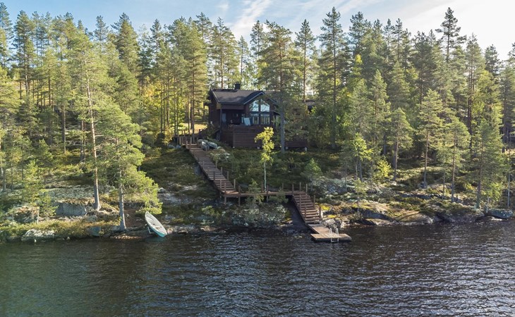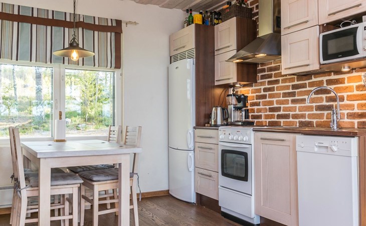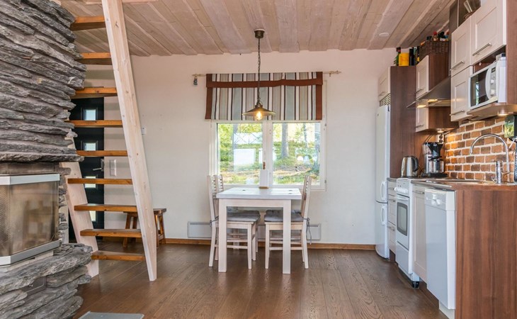 Located 82 km west of Jyväskylä, Lake Yltiä 30 m, deep rocky shore, own dock, and a rowing boat. The water is about 3 m deep at the end of the dock. The cabin is built of stone (2009) and includes a living room and open-plan kitchen. The living room has armchairs and a heat-storing fireplace. The kitchen area has a dining table for four and is well-equipped. There is one bedroom with a double bed.
