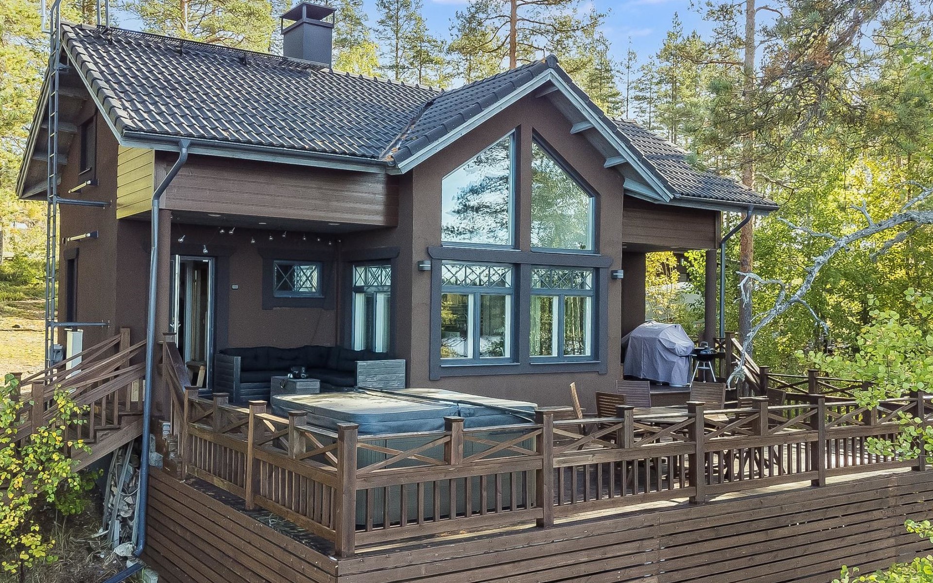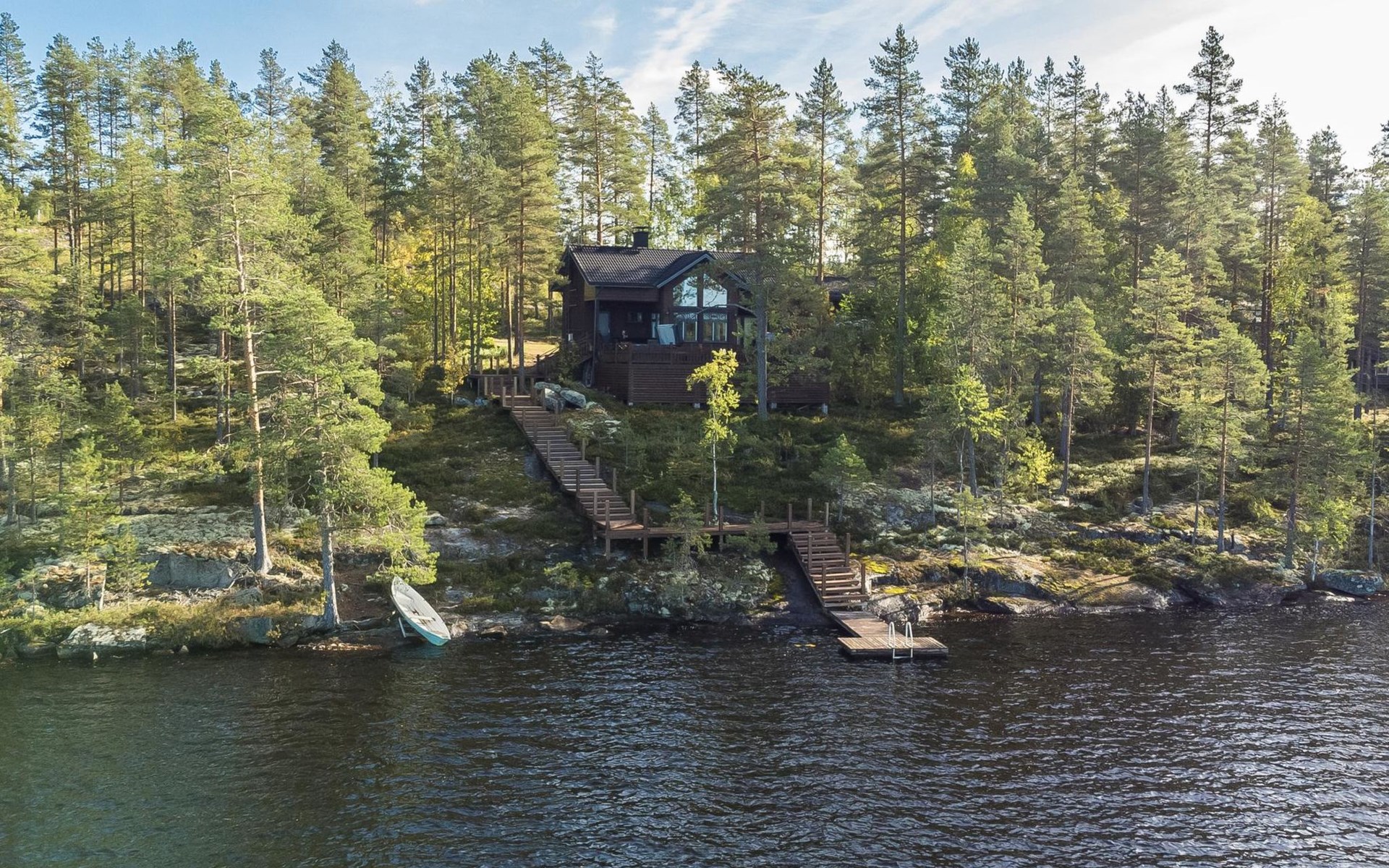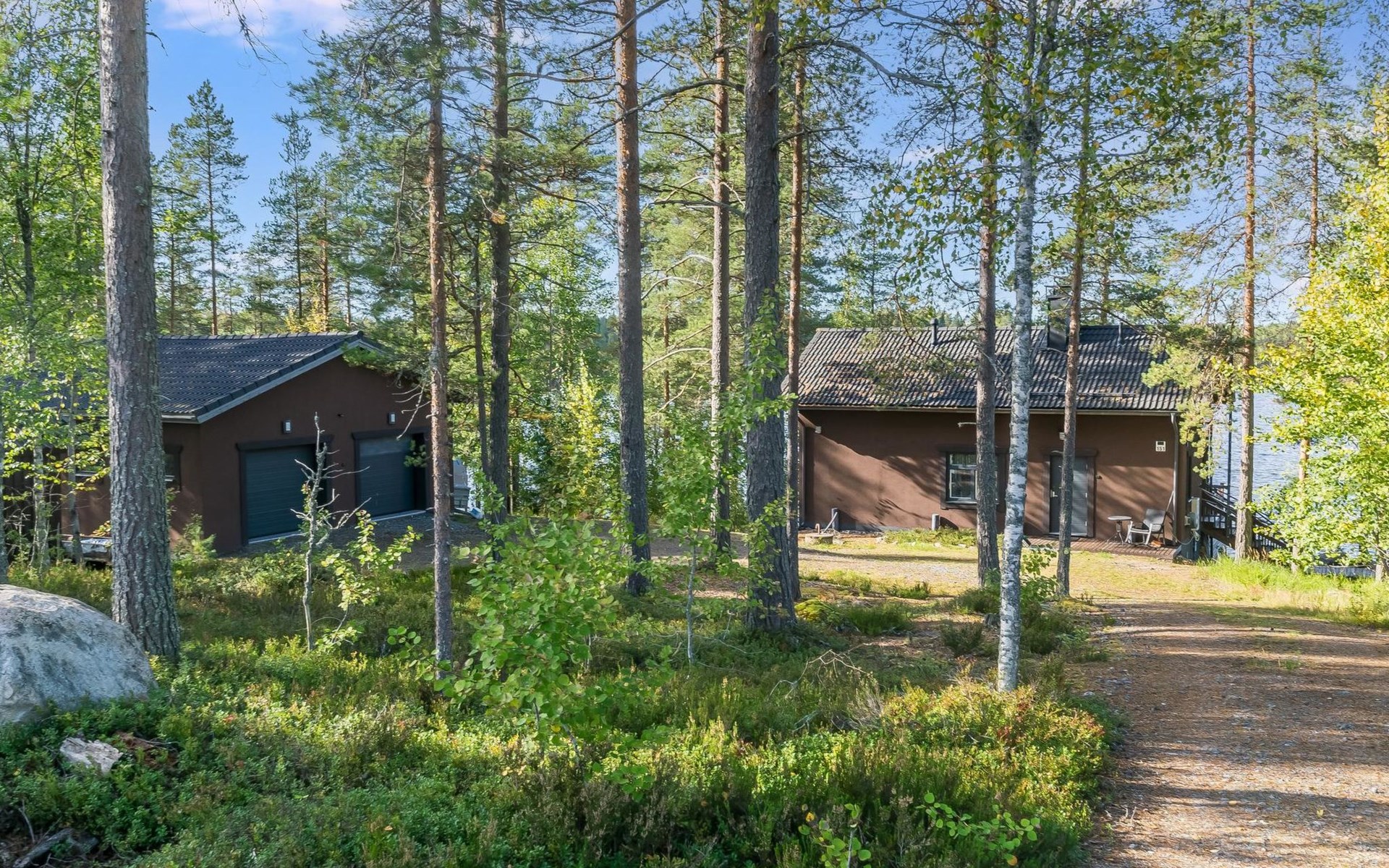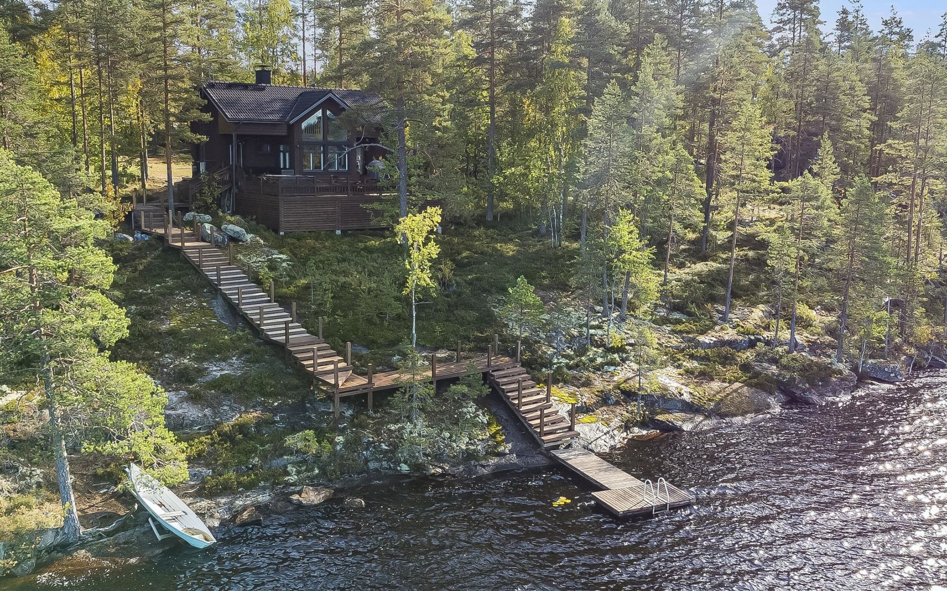 There is a garage on the property, but it is not available for use. The cabin is rented out only for peaceful vacations. Electric cars can be charged briefly using a personal charger with the yard’s standard outlet. The cabin is located in a quiet area, with space for multiple cars in the yard. The lounging areas enjoy sunlight throughout the day. From the terrace, steep stairs lead down to the rocky and deep beach, where the water is about three meters deep at the end of the dock.