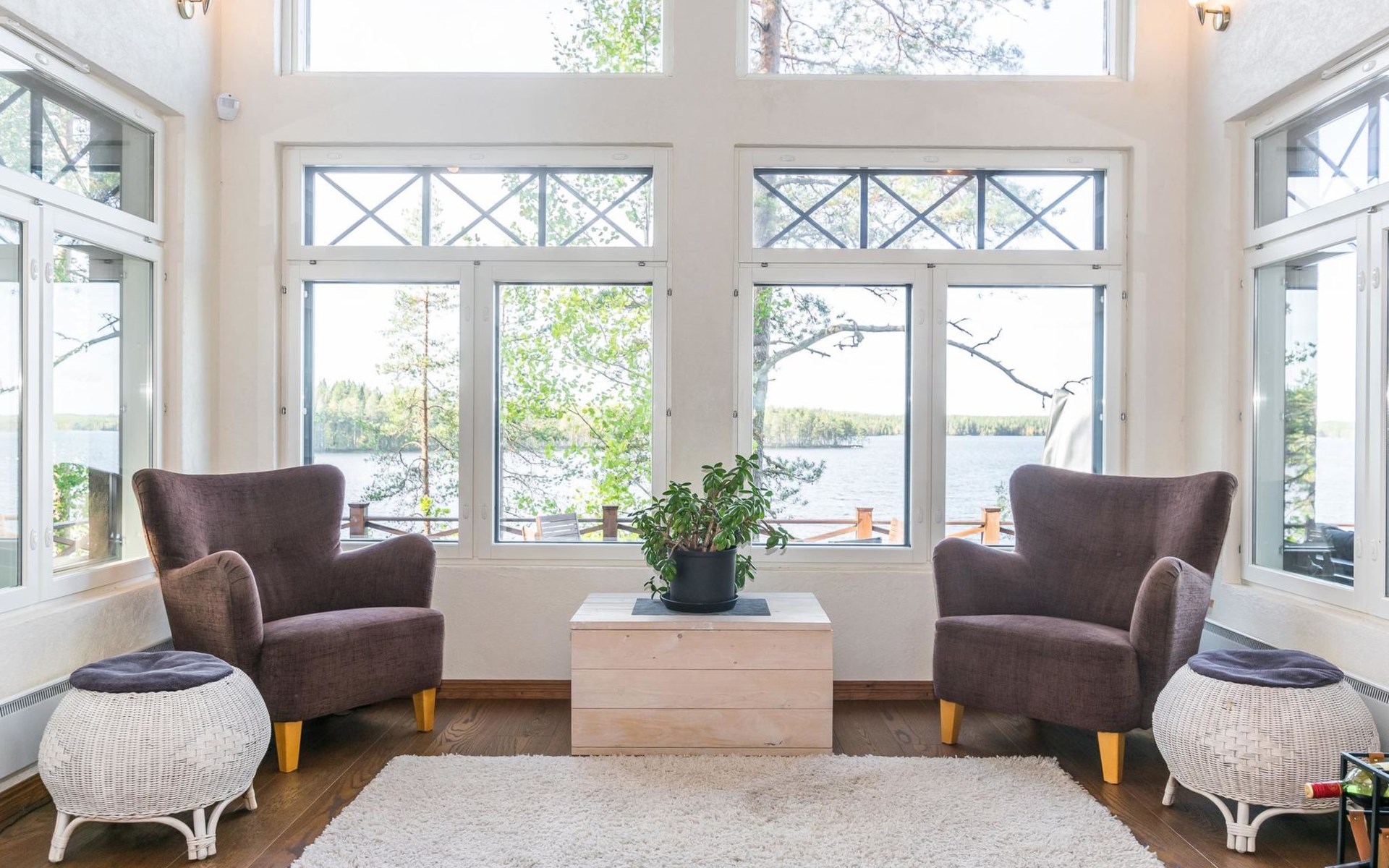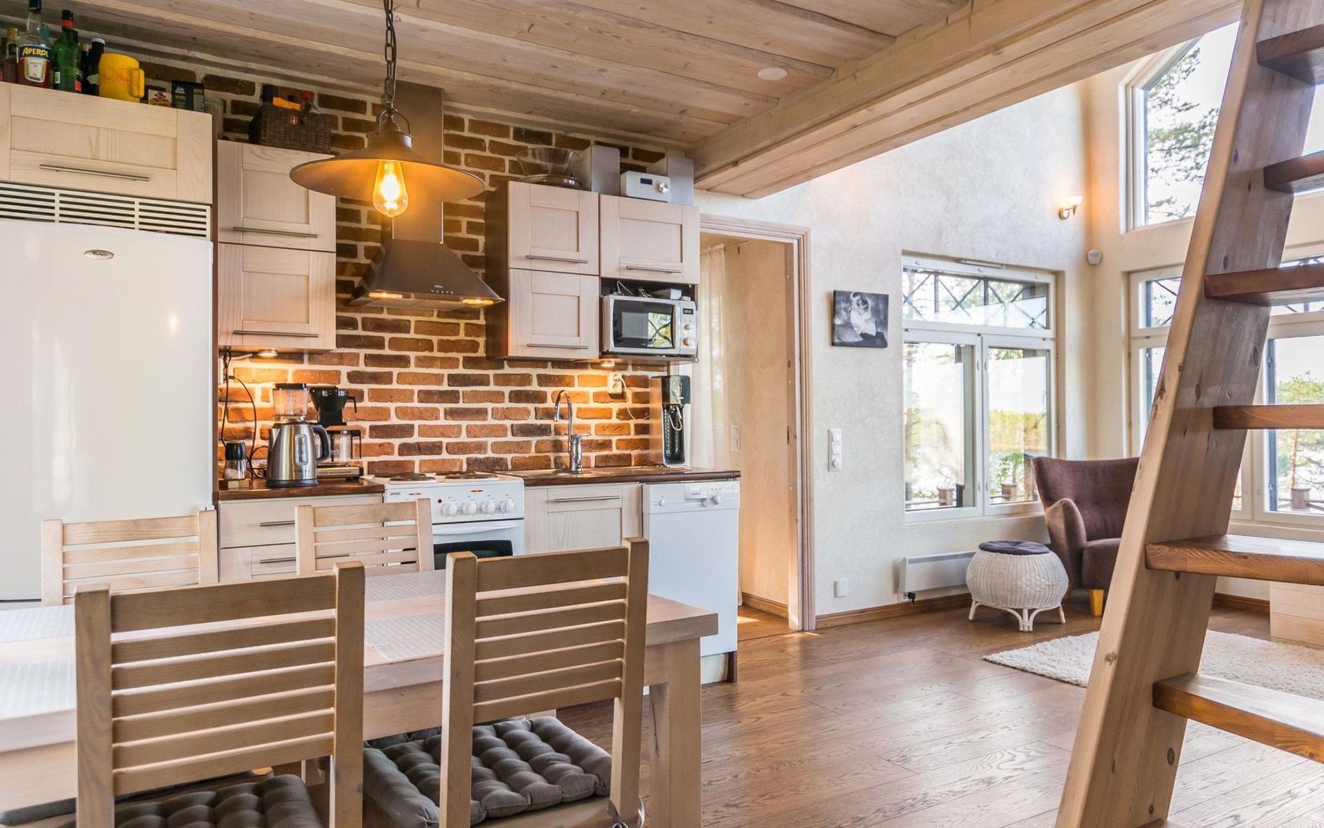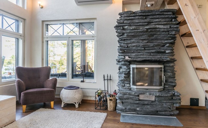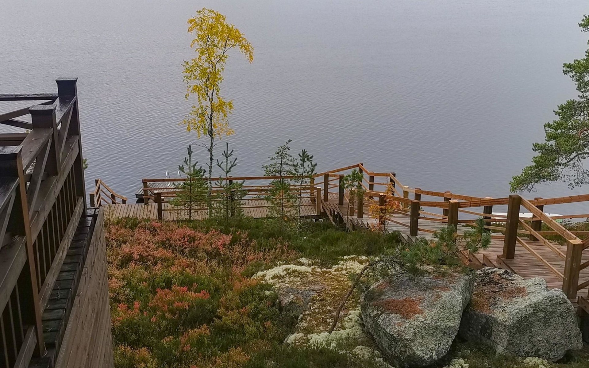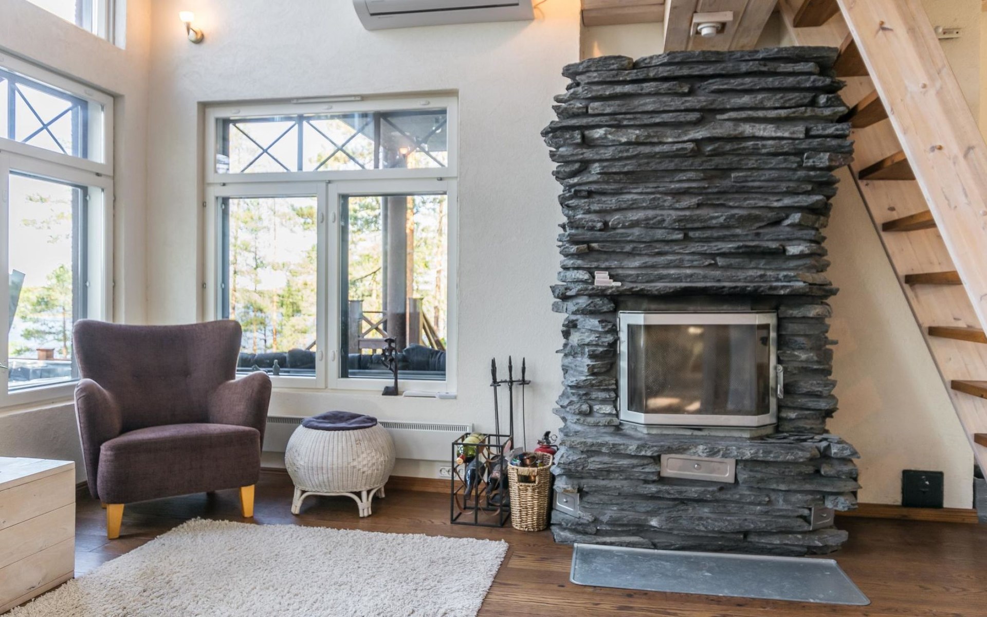 There is a garage on the property, but it is not available for use. The cabin is rented out only for peaceful vacations. Electric cars can be charged briefly using a personal charger with the yard’s standard outlet. The cabin is located in a quiet area, with space for multiple cars in the yard. The lounging areas enjoy sunlight throughout the day. From the terrace, steep stairs lead down to the rocky and deep beach, where the water is about three meters deep at the end of the dock.
