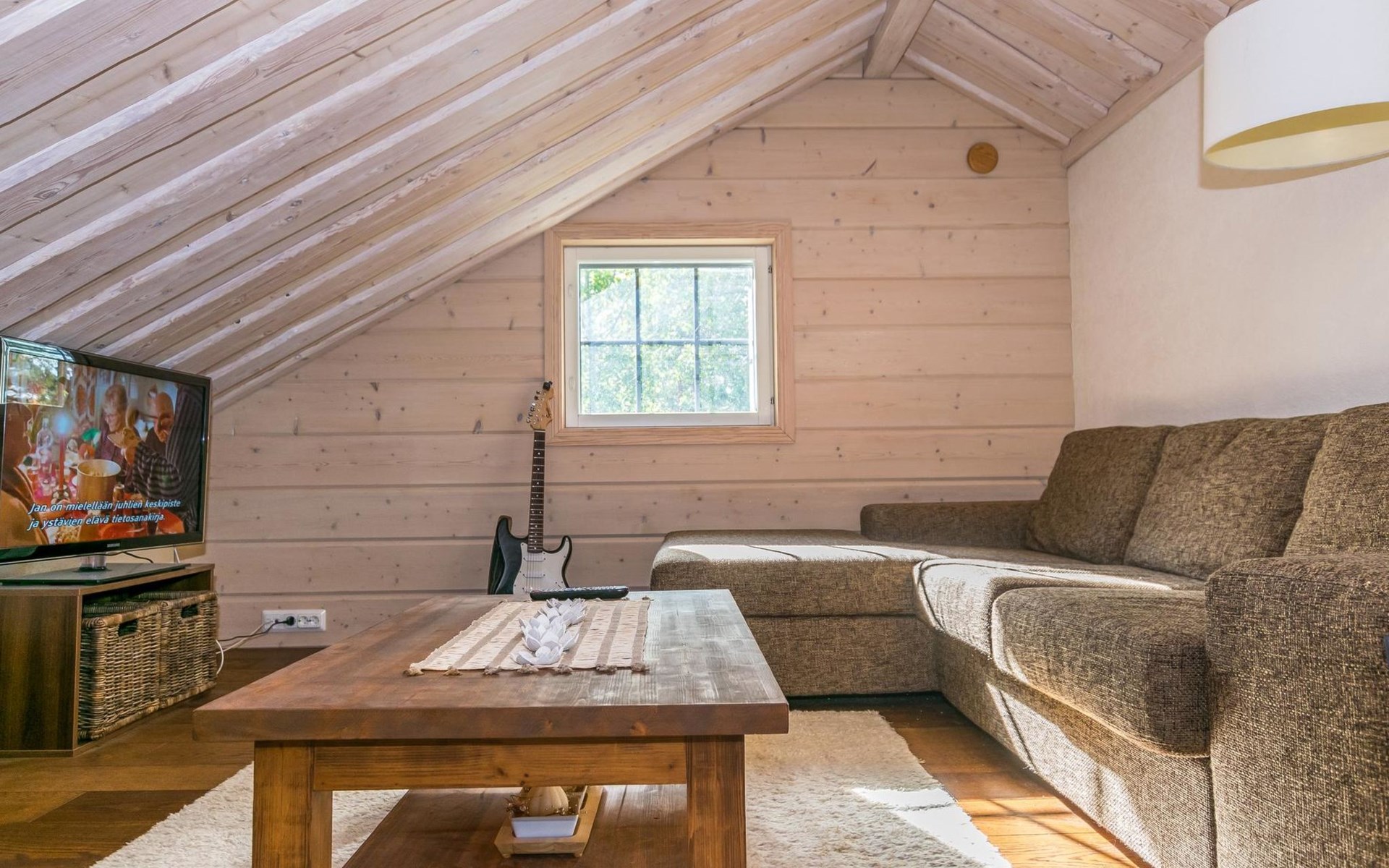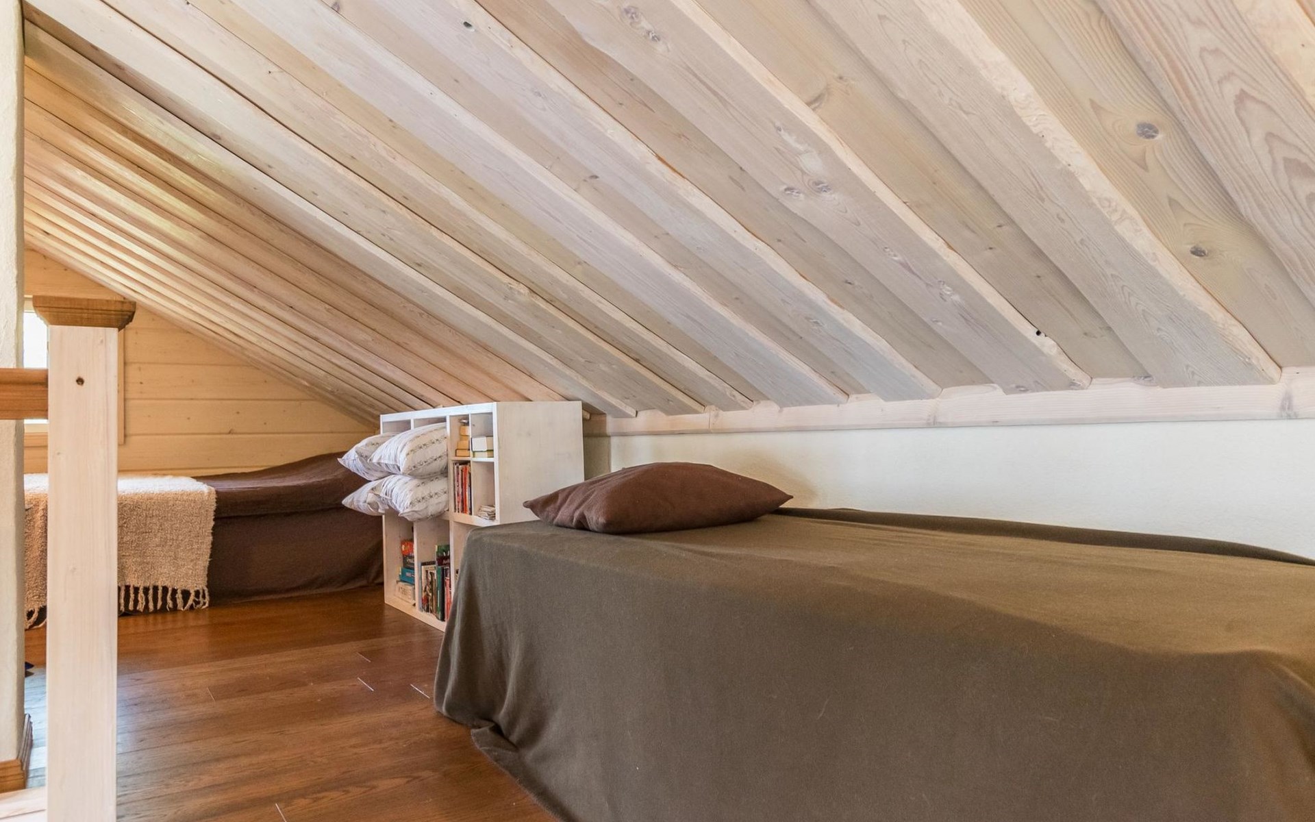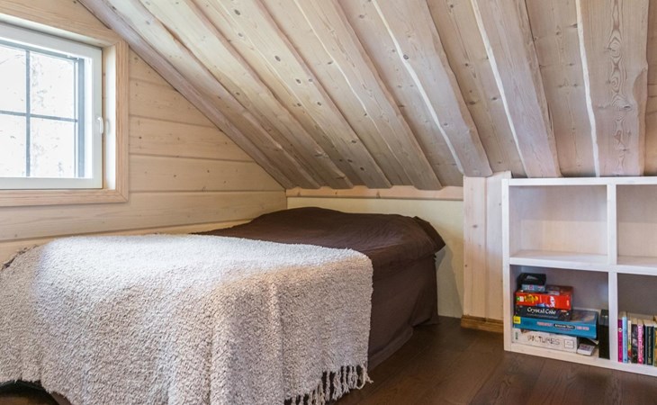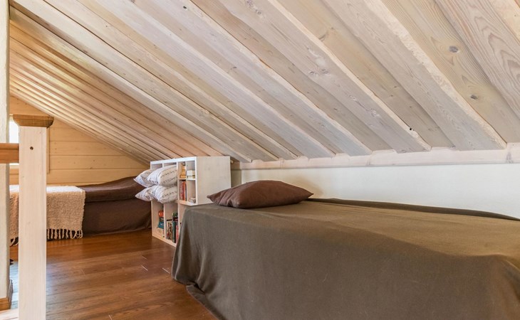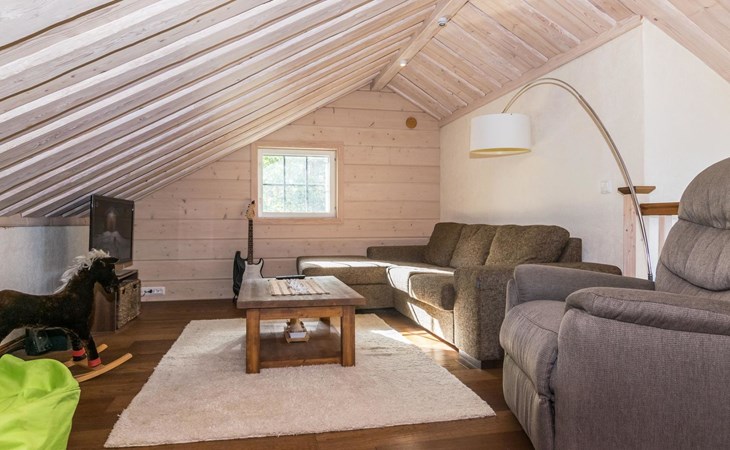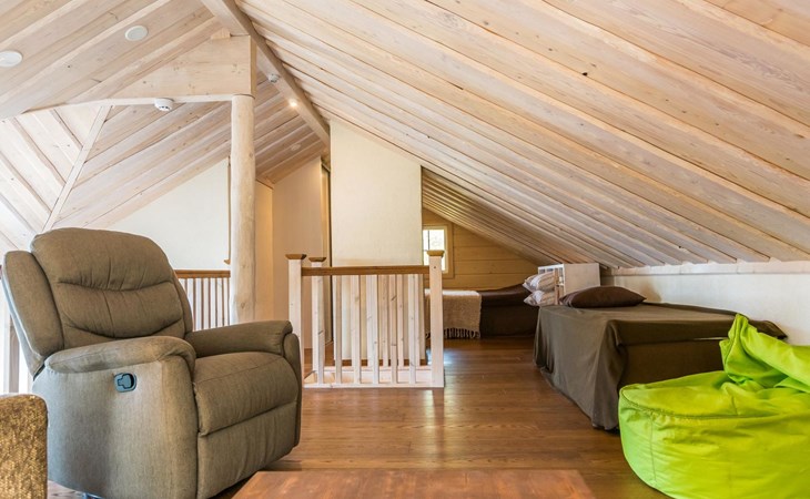 The upper floor has two beds (120 x 200 cm and 80 x 200 cm). The upper floor also includes a cozy lounge area with a sofa, armchair, and TV. The stairs to the upper level are quite steep. The cabin has internet access via Wi-Fi.