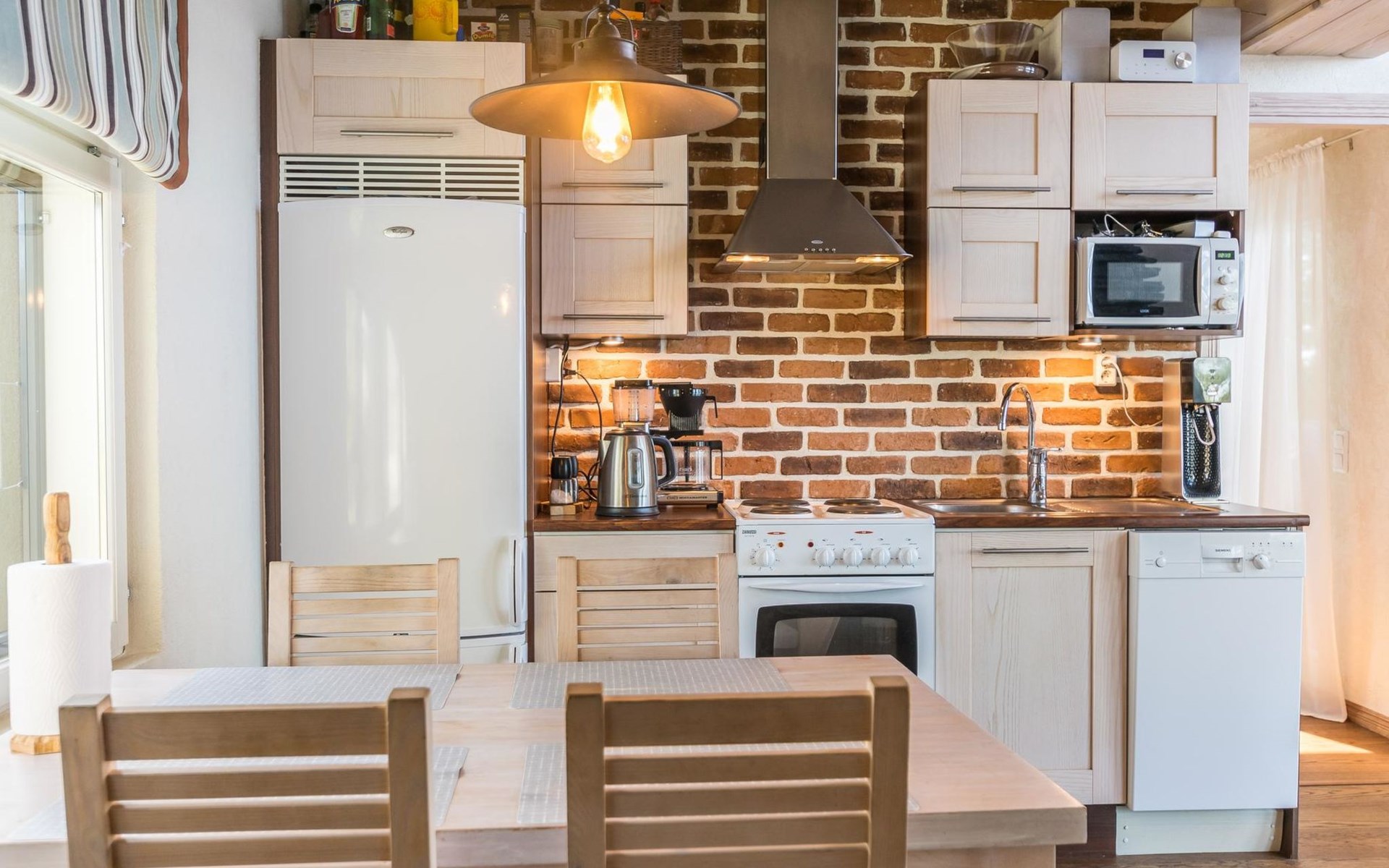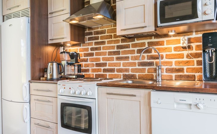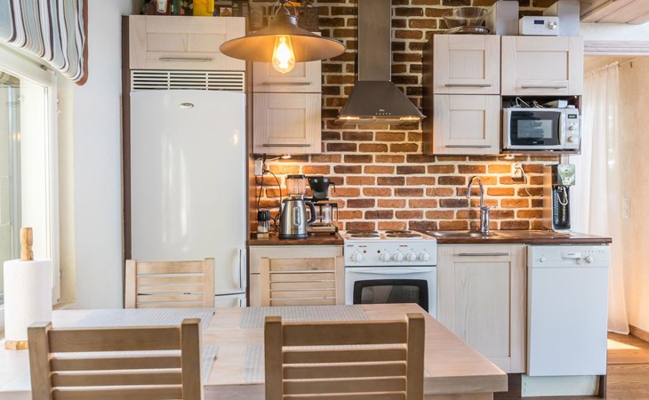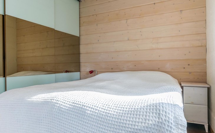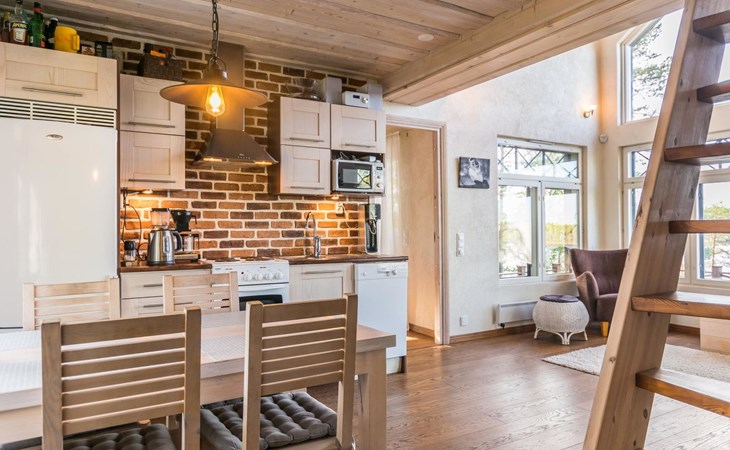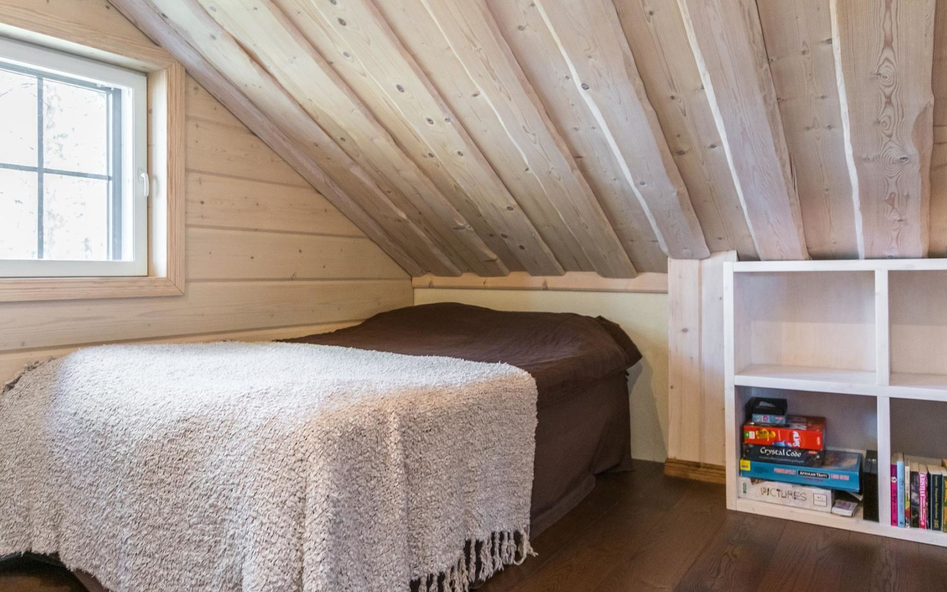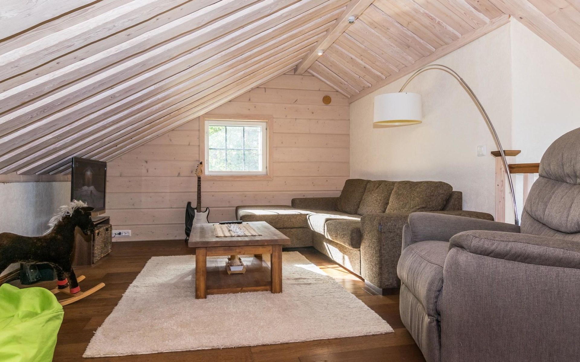 The upper floor has two beds (120 x 200 cm and 80 x 200 cm). The upper floor also includes a cozy lounge area with a sofa, armchair, and TV. The stairs to the upper level are quite steep. The cabin has internet access via Wi-Fi.