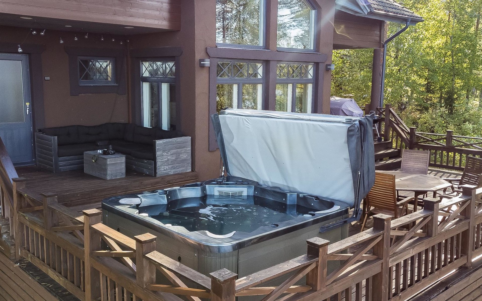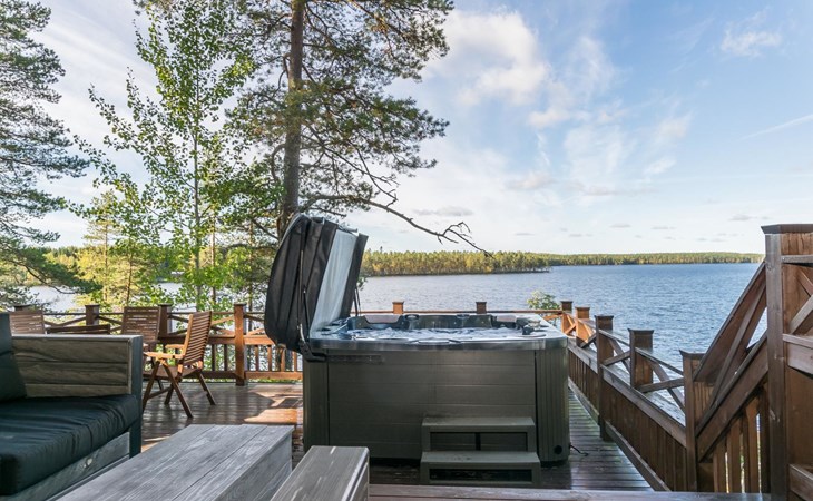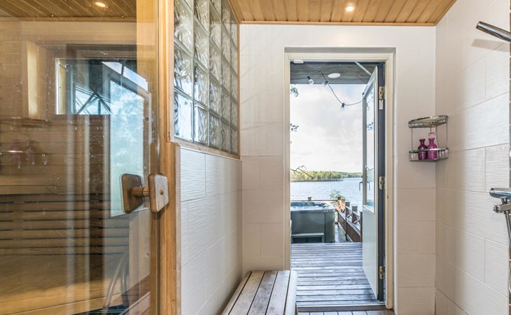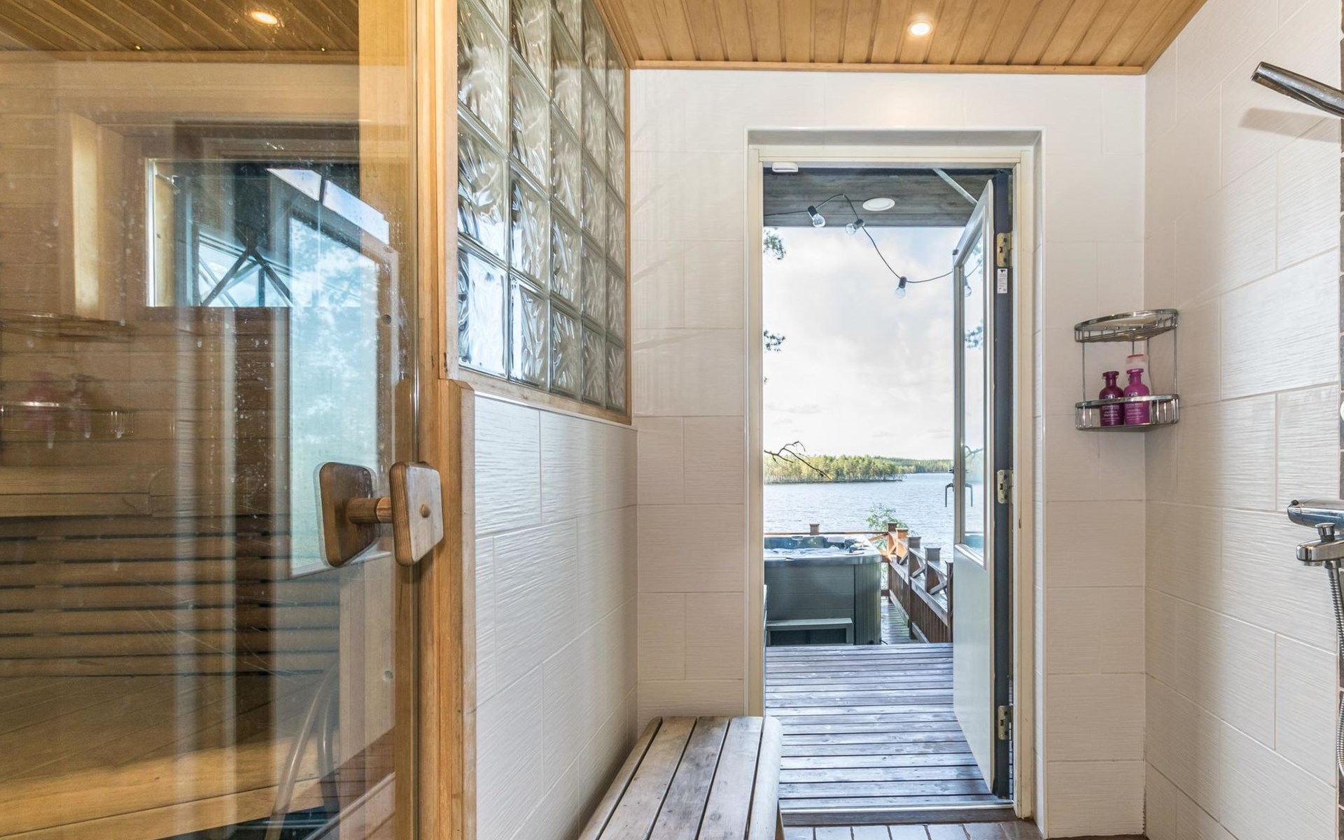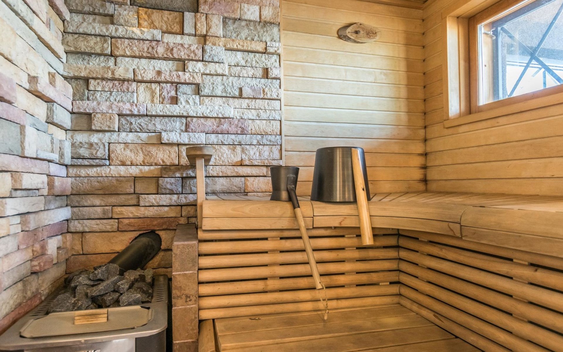 The sauna features a wood-burning stove, and the washroom has a shower, a WC, and a washing machine. A door opens to the terrace, furnished with ample seating, a sofa, and the hot tub. Please note that the hot tub must be booked for the same duration as the accommodation reservation.