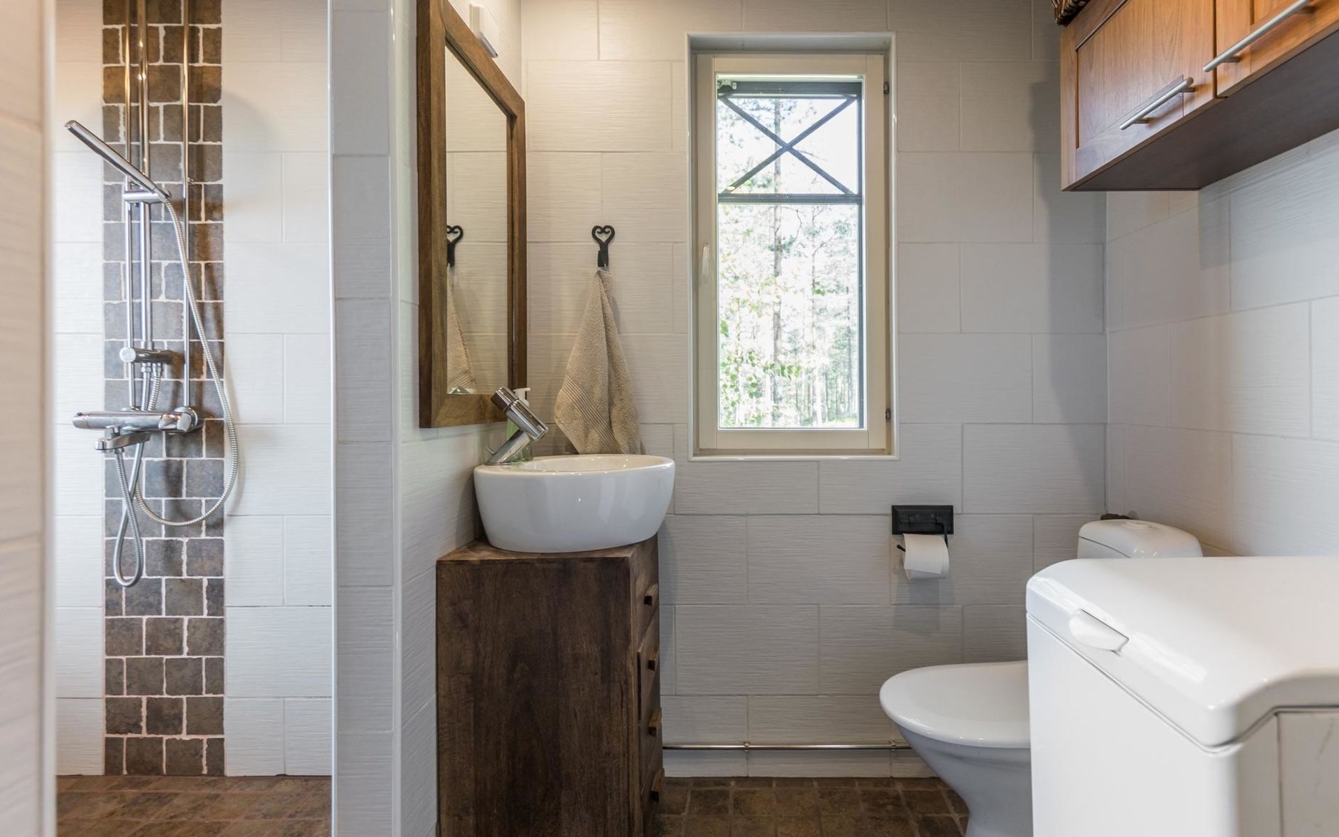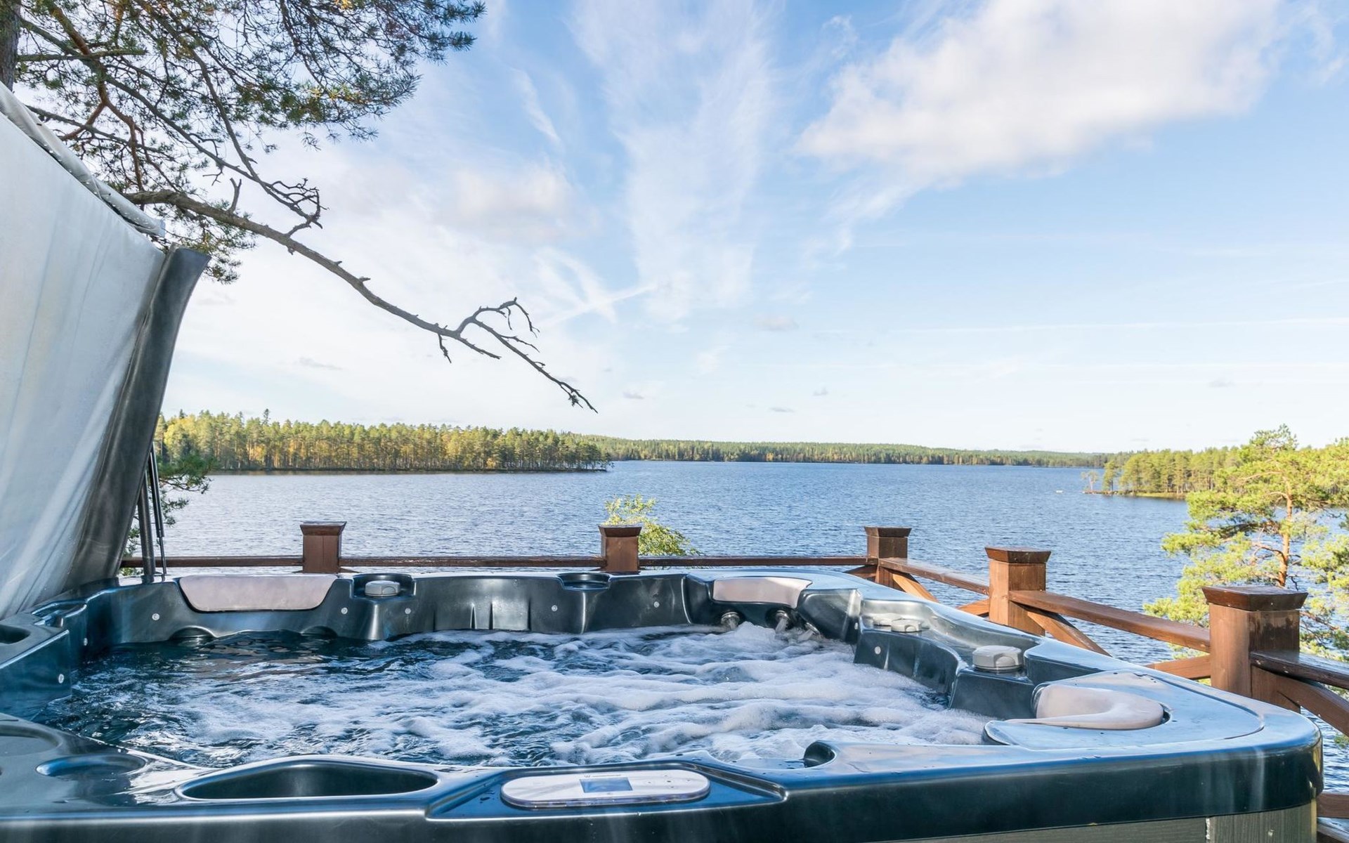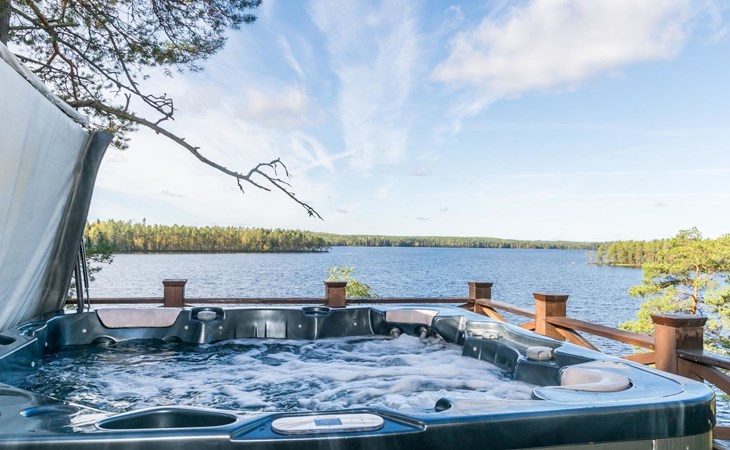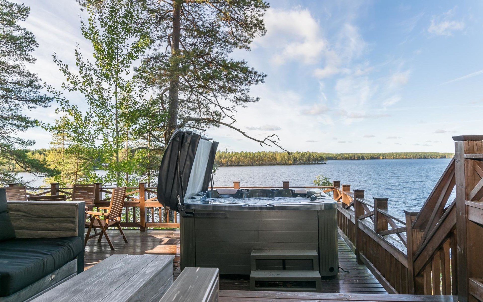 The sauna features a wood-burning stove, and the washroom has a shower, a WC, and a washing machine. A door opens to the terrace, furnished with ample seating, a sofa, and the hot tub. Please note that the hot tub must be booked for the same duration as the accommodation reservation.