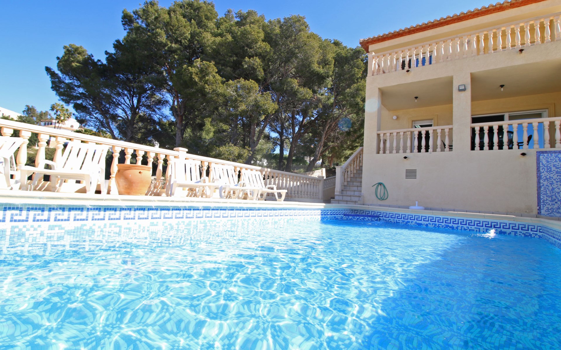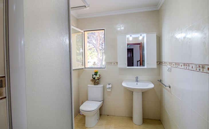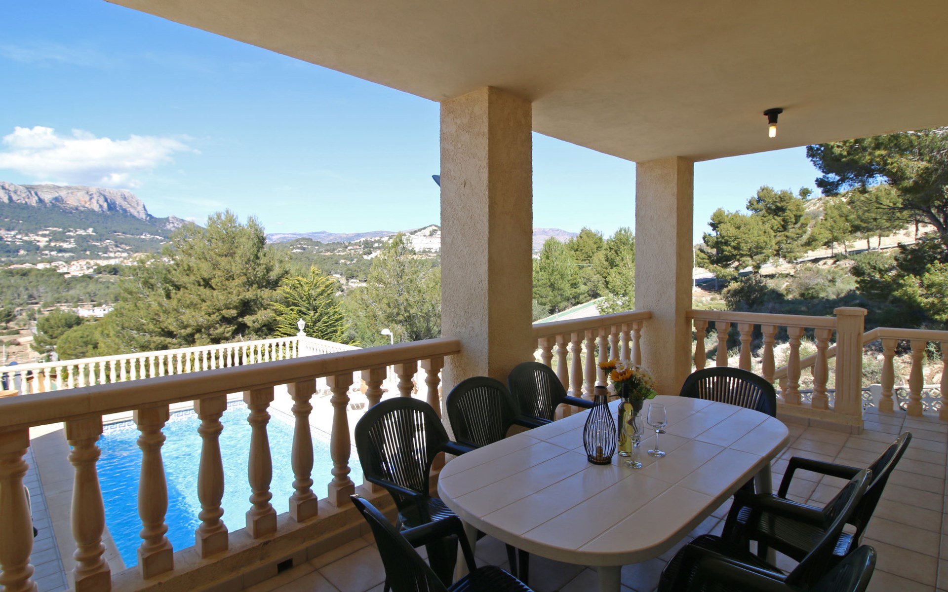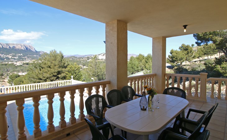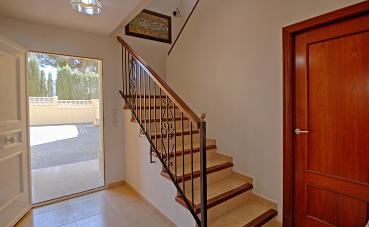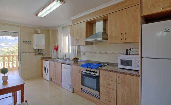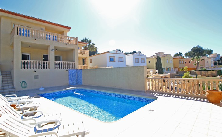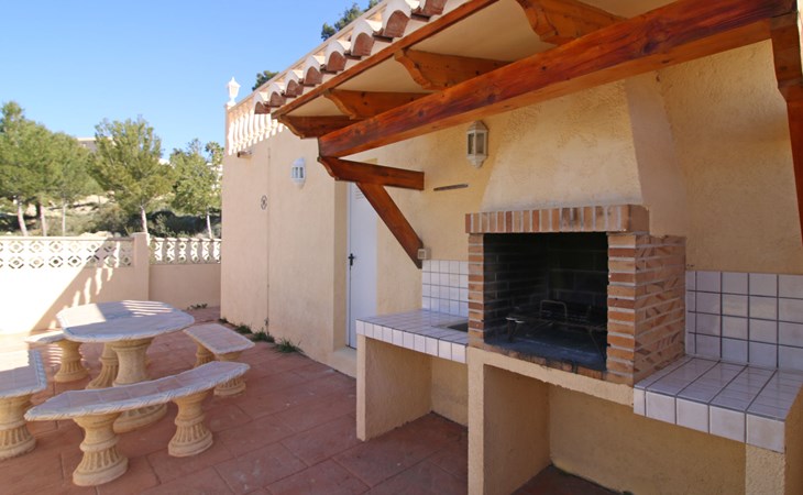 Casanova 2 km from calpe: Beautiful villa "Bajamar", 2 storeys. 2 km from the centre of Calpe, in the district Casanova, in a sunny position residential area (villas), 2.3 km from the sea, 2.3 km from the beach. Private: property 550 m2 (fenced), swimming pool (8 x 4 m, seasonal availability: 01.Jan. - 31.Dec.). Outdoor shower, garden furniture, barbecue house, parking. Grocery 1.7 km, supermarket 1.8 km, restaurant 1.5 km, bar 1.5 km, bus stop 450 m, sandy beach "Playa del Arenal" 2.2 km. Sports harbour 3.4 km, marina 3.4 km, sailing school 3.4 km, tennis 1.5 km. Nearby attractions: Parque de atracciones Terra Mítica 35 km, Parque acuático Aqualandia 25 km. Hiking paths: Parque natural Peñon de Ifach 3 km.