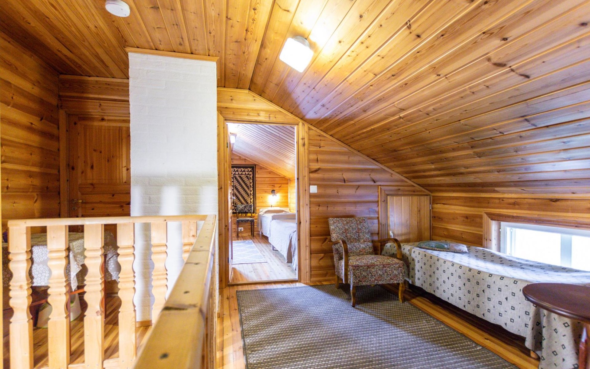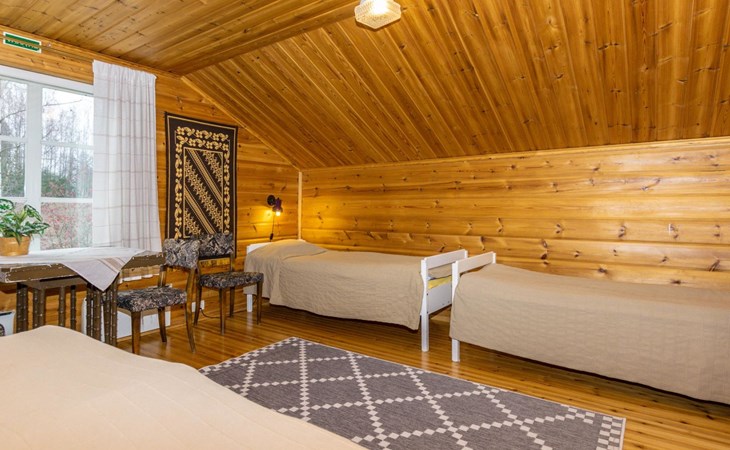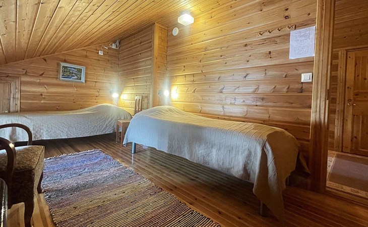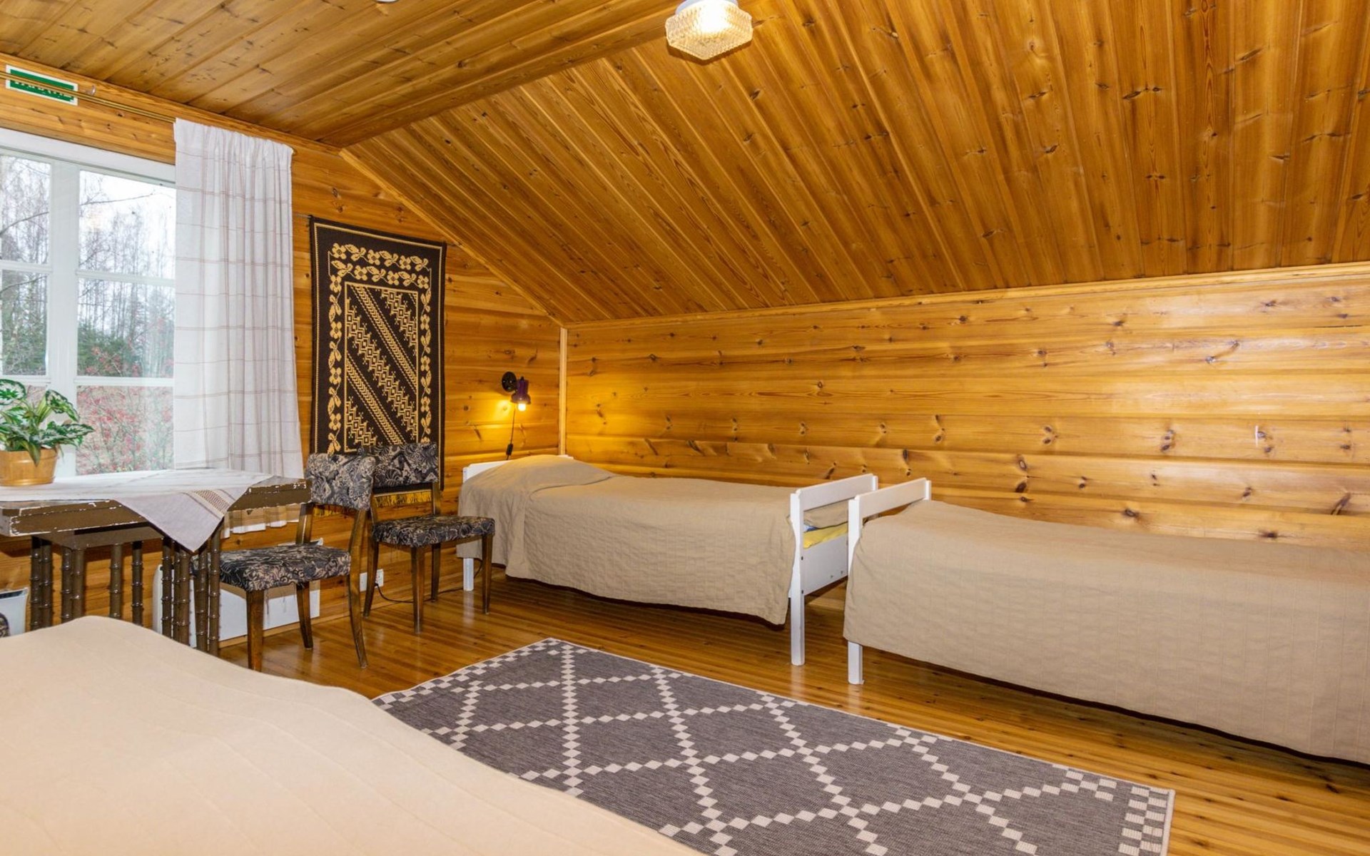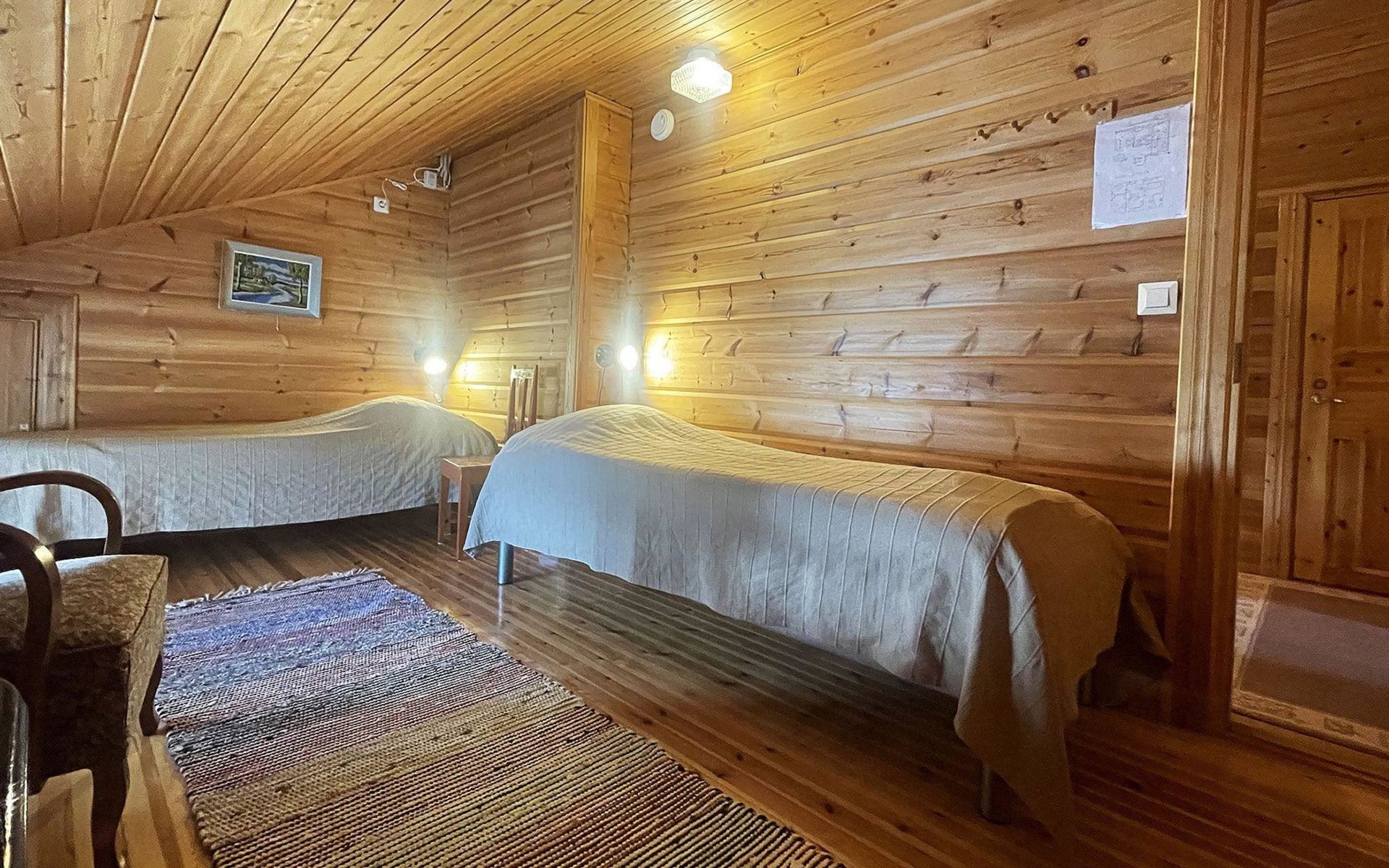 Log-built cabin. On the ground floor, spacious living room, kitchen, 2 bedrooms (both with two beds), WC with shower. On the upper floor, two bedrooms, one with two beds and another with double bed and two single beds, sauna (electric sauna stove), WC / washroom and dressing room. In the backyard, there is a covered cooking area with solid masonry grill.
