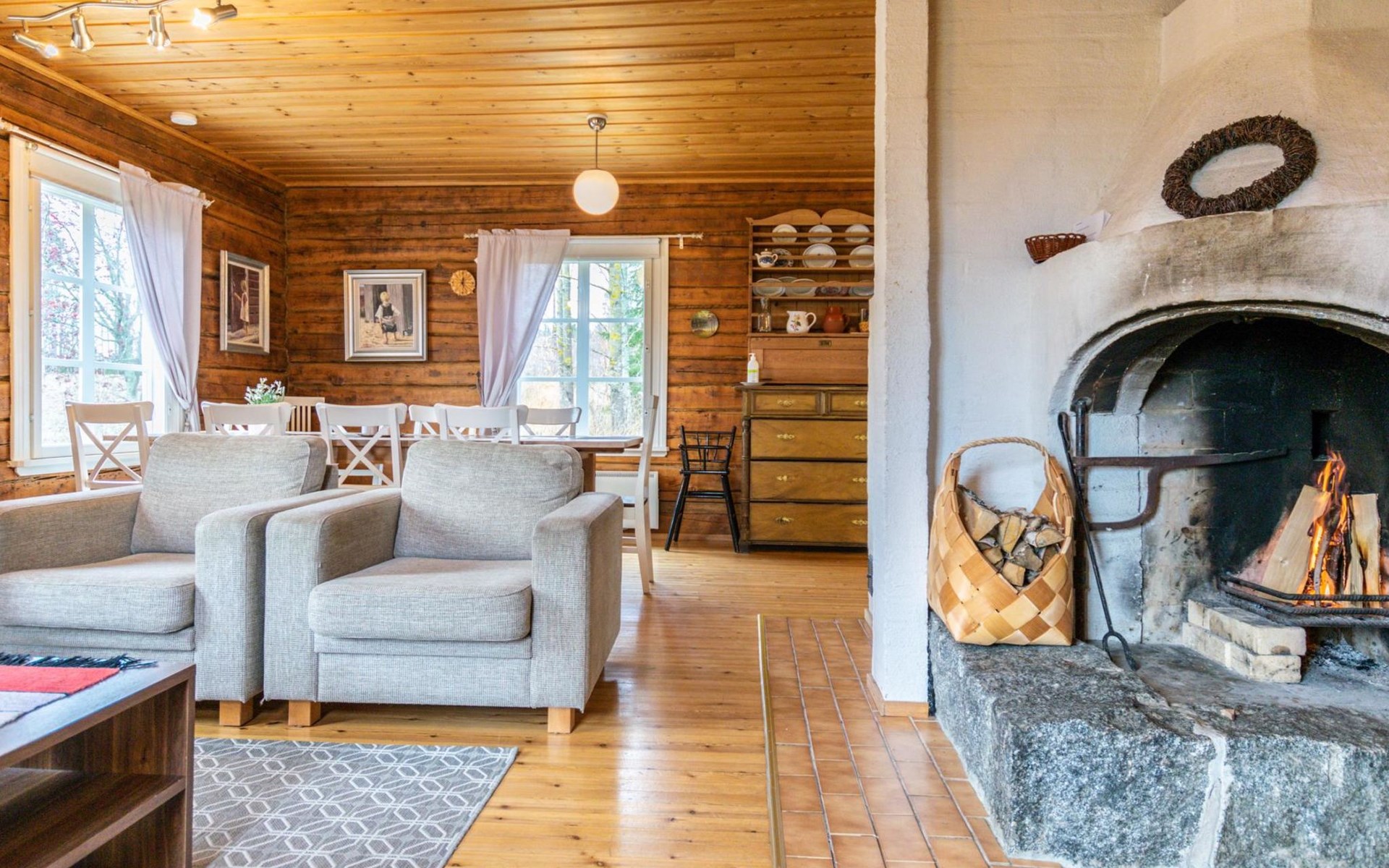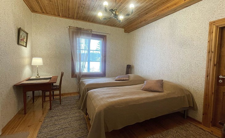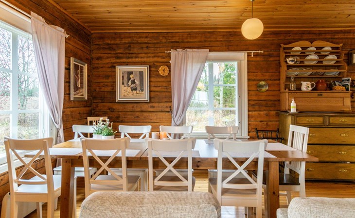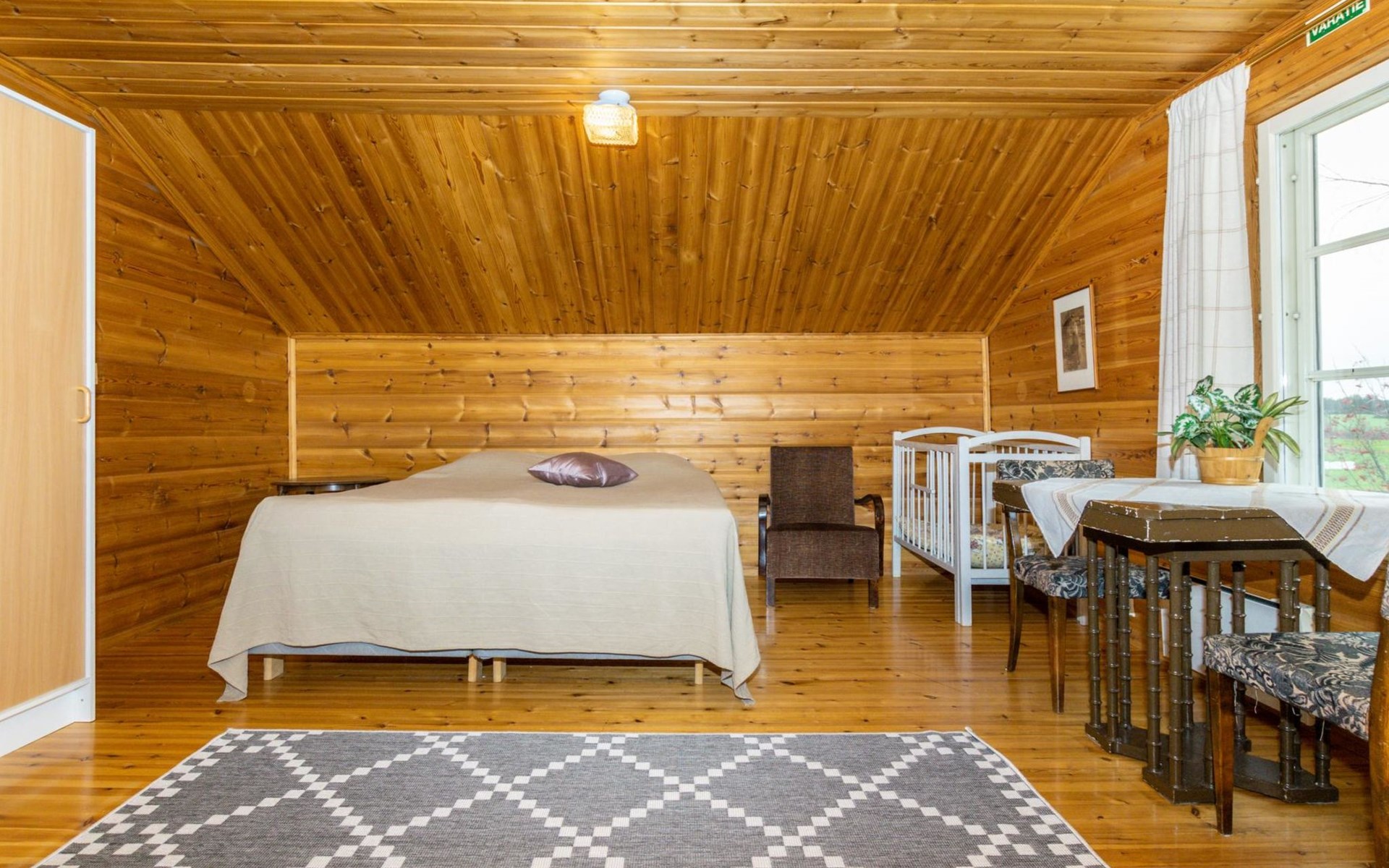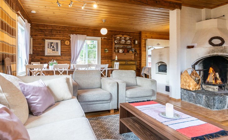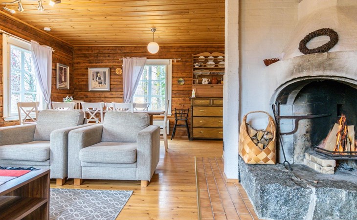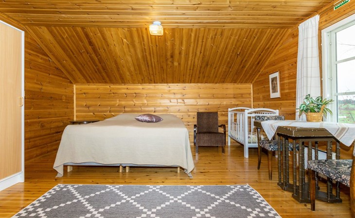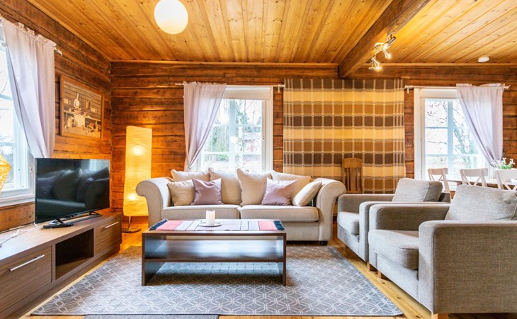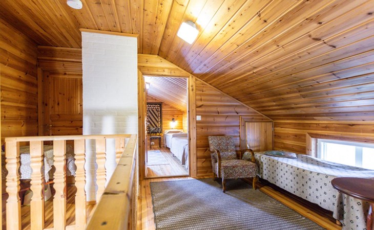 Log-built cabin. On the ground floor, spacious living room, kitchen, 2 bedrooms (both with two beds), WC with shower. On the upper floor, two bedrooms, one with two beds and another with double bed and two single beds, sauna (electric sauna stove), WC / washroom and dressing room. In the backyard, there is a covered cooking area with solid masonry grill.