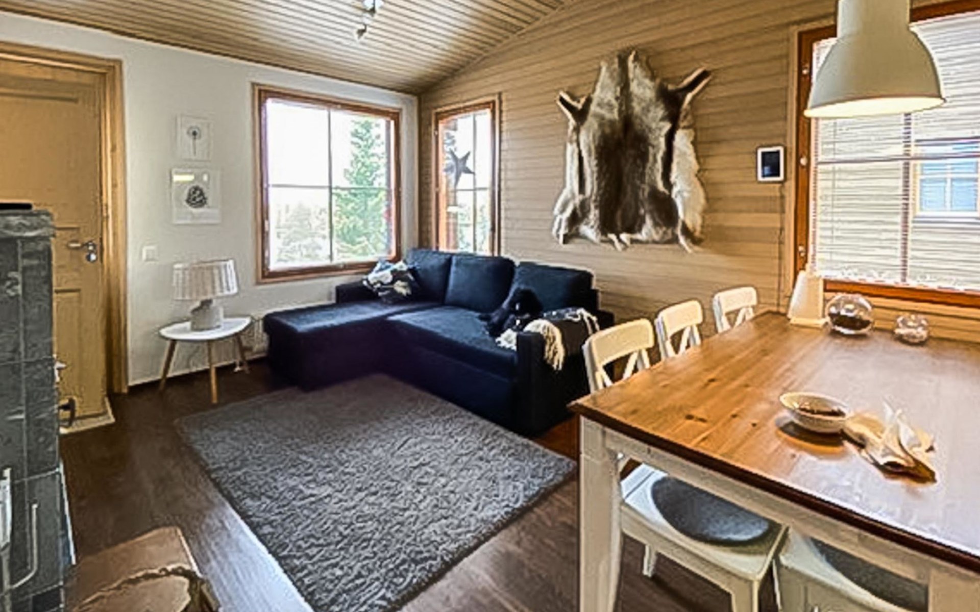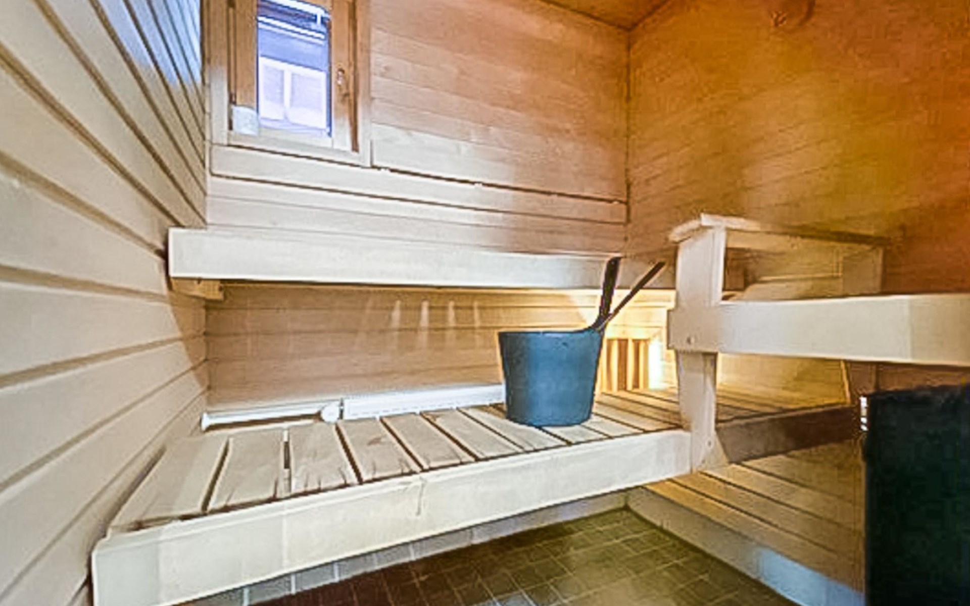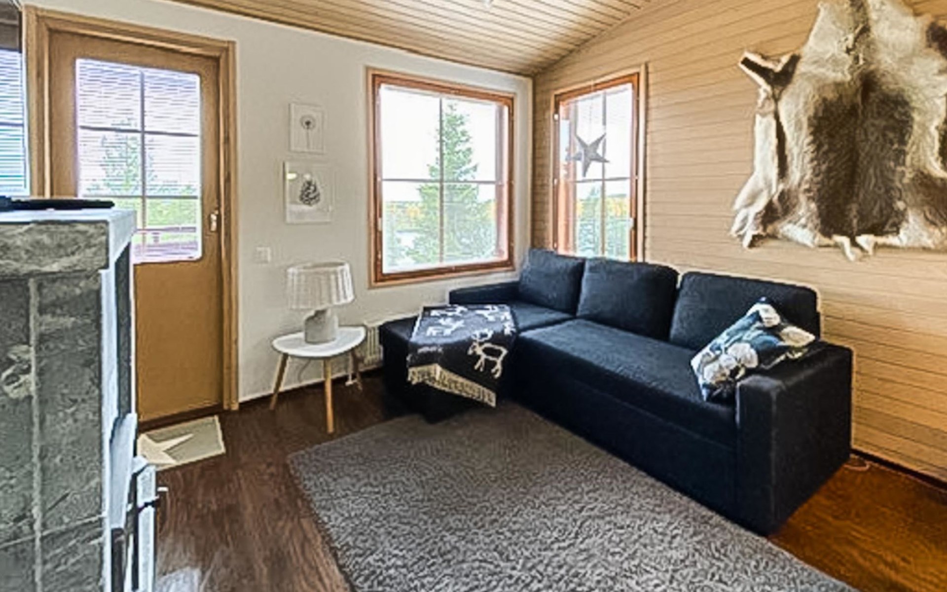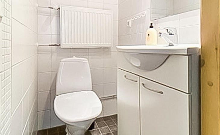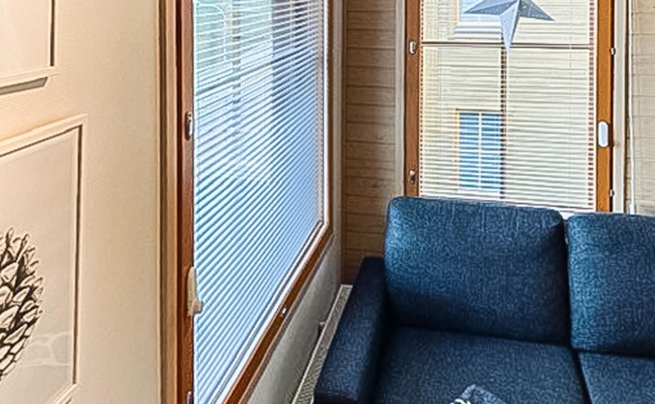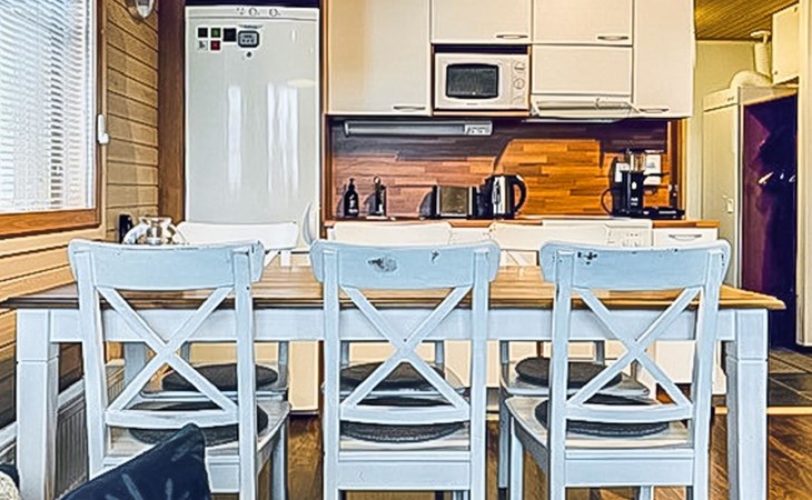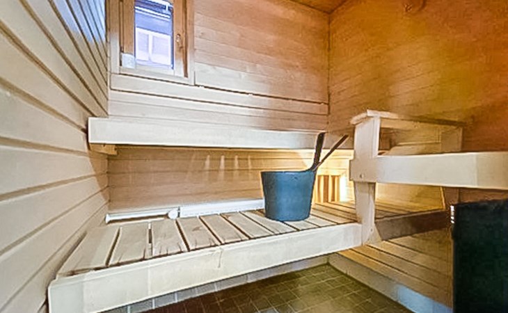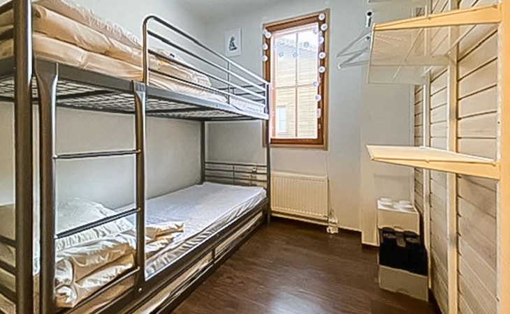 Apartment (built of wood/stone), built in 2007, situated house´s second floor. bedroom 1: double bed, bedroom 2: bunk bed with third drawer bed (all beds width 90 cm), living room: pull out corner sofa, combined kitchen/living room, electric sauna.