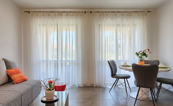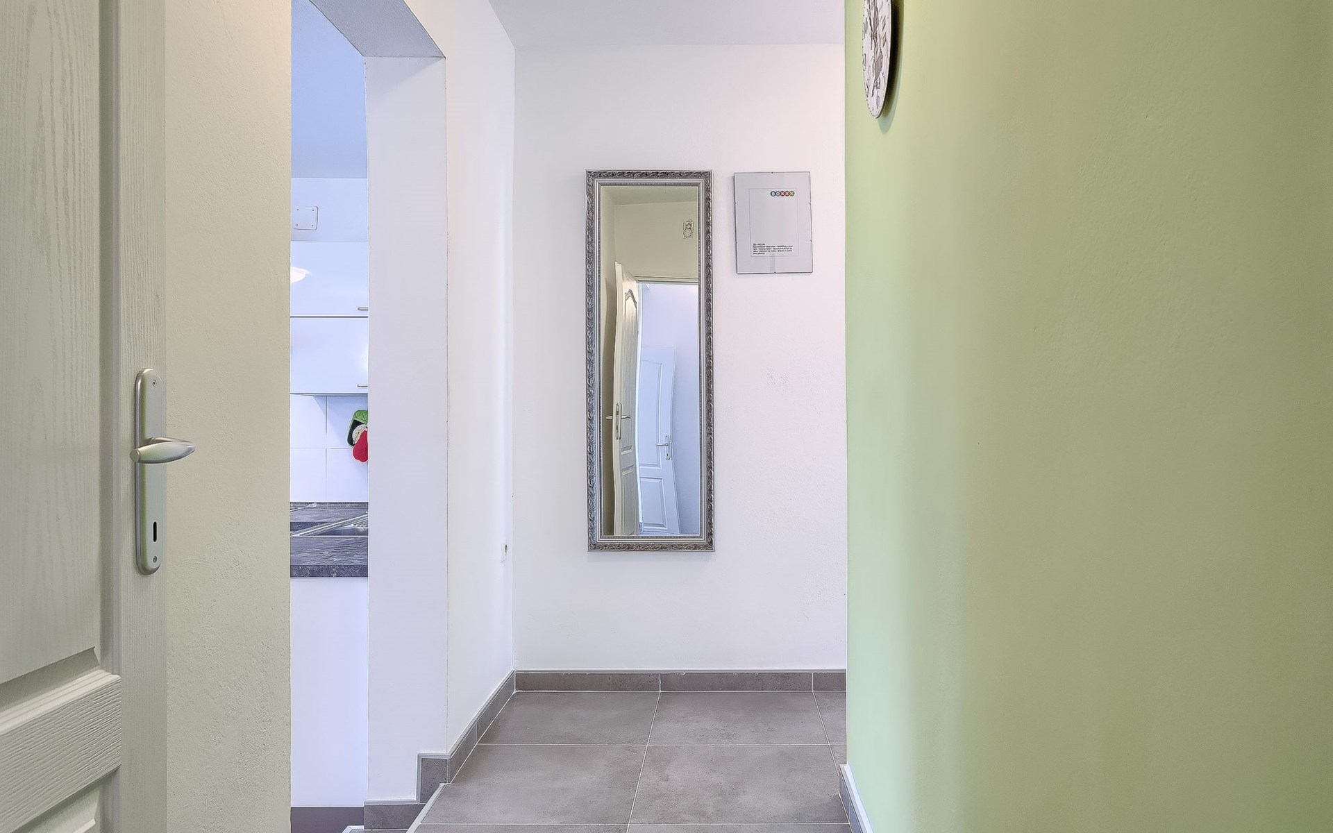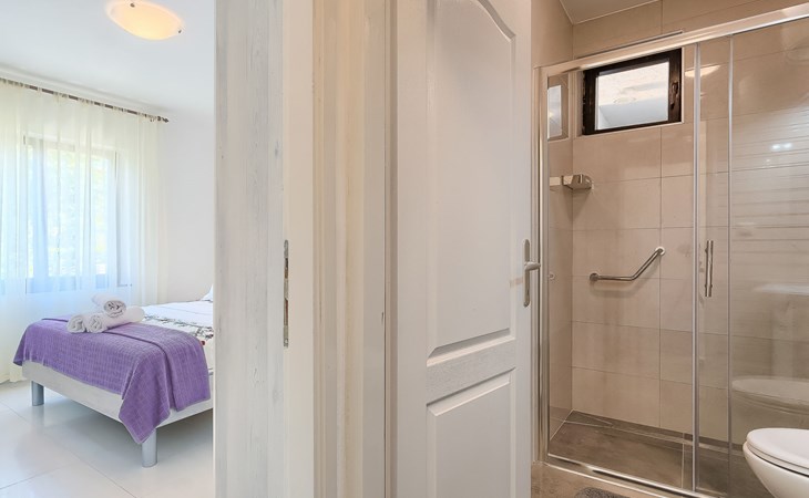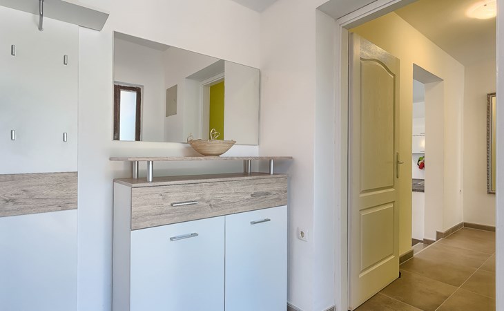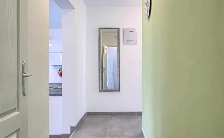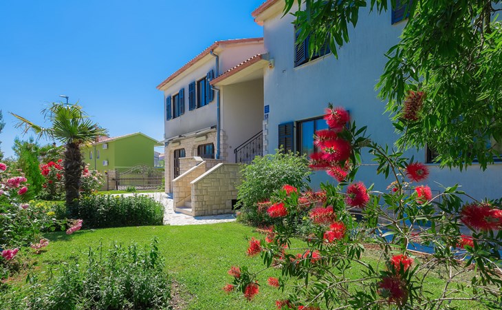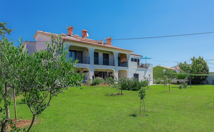 Beautiful apartment house "Muki". 600 m from the centre of Medulin, in a quiet, sunny position, 500 m from the sea, 700 m from the beach. For shared use: property 1'850 m2 (fenced), beautiful garden with lawn and trees. Garden furniture, barbecue. In the house: internet access, storage room for bicycles. Parking at the house on the premises. Shop 200 m, supermarket, restaurant 300 m, bar, bakery 100 m, bus stop 230 m, sandy beach 1 km pebble beach, rocky beach 700 m. Golf course (18 hole) 27 km, surf school 2.5 km, tennis 2.5 km, riding stable 2 km, walking paths from the house 200 m, cycle lane 250 m, children's playground 1 km. Parking for trailer (extra). Video surveillance of the property.