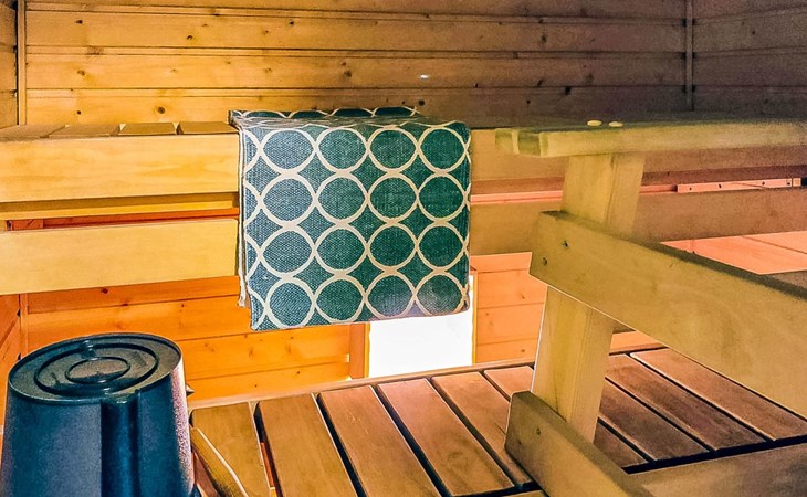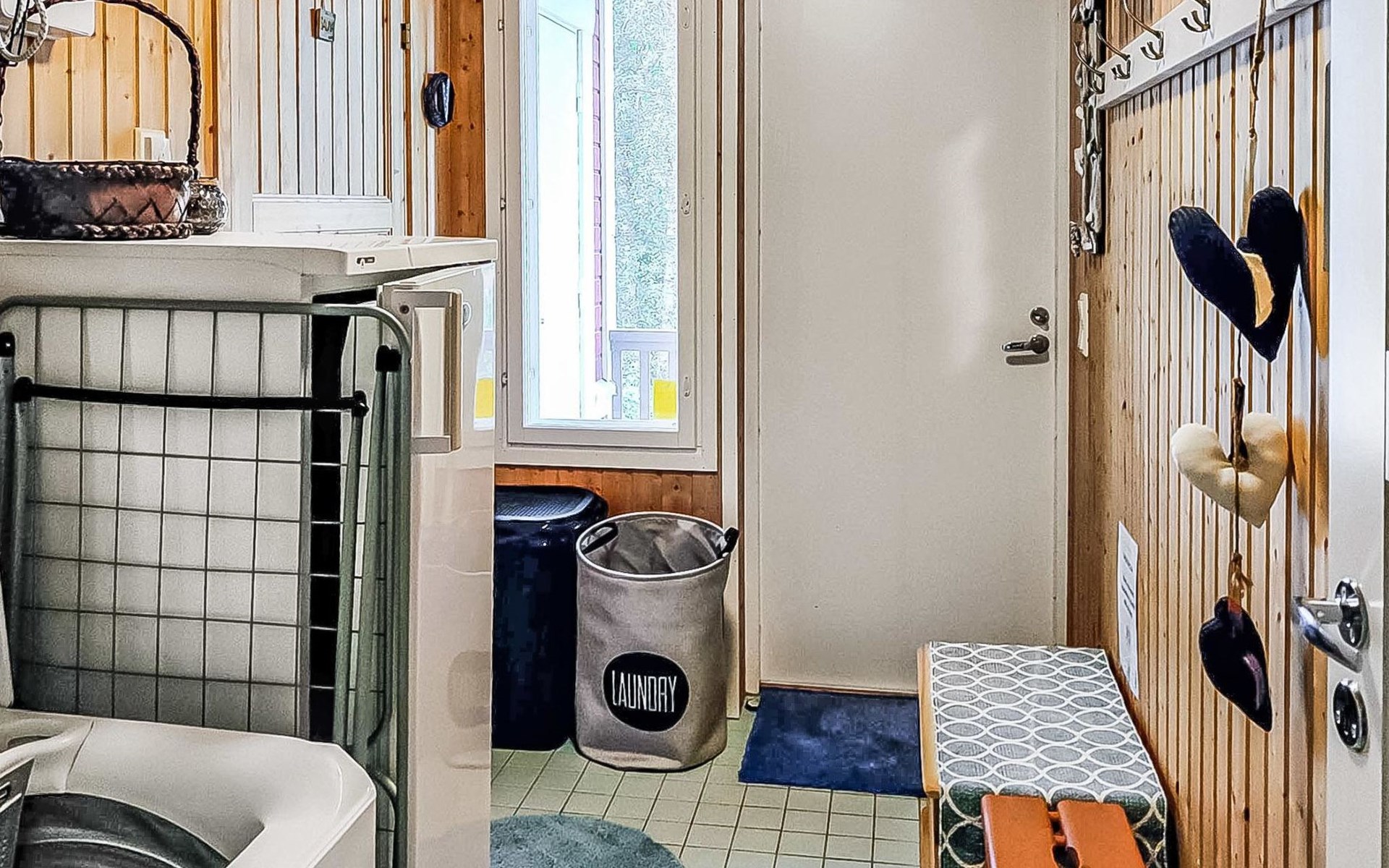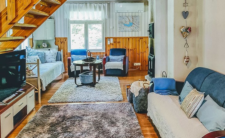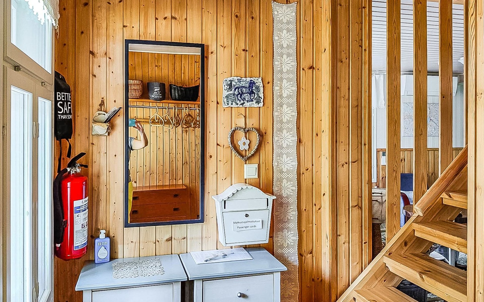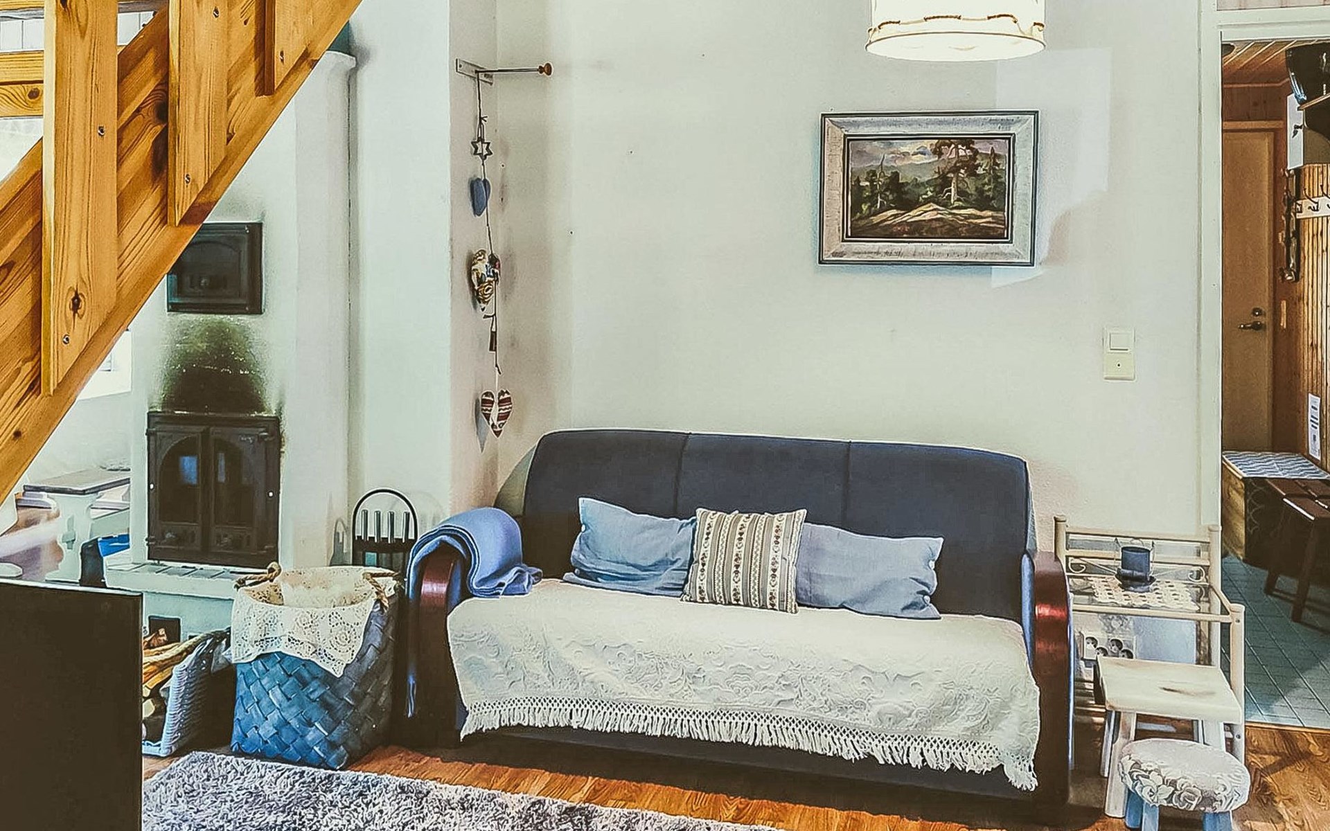 Downstairs: living room (sofa bed for 1 person), kitchen, one bedroom with a double bed, one bedroom with a bunk bed, air source heat pump, separate toilet, wash room and electric sauna.