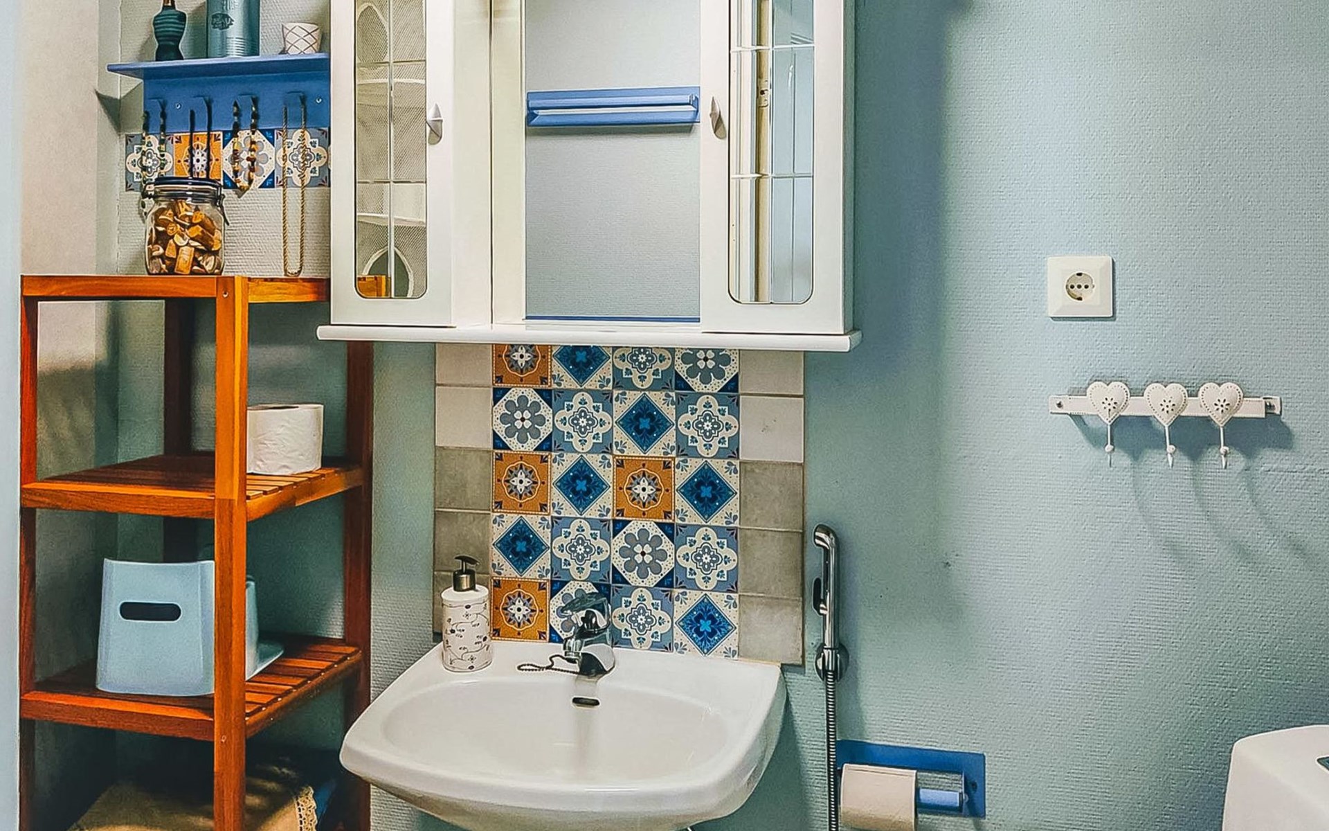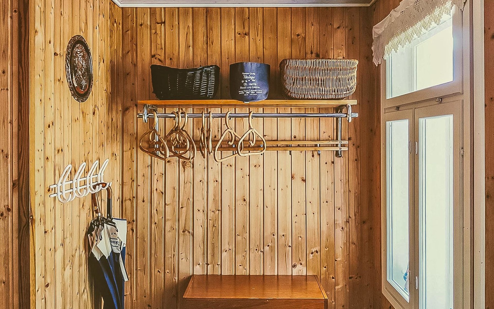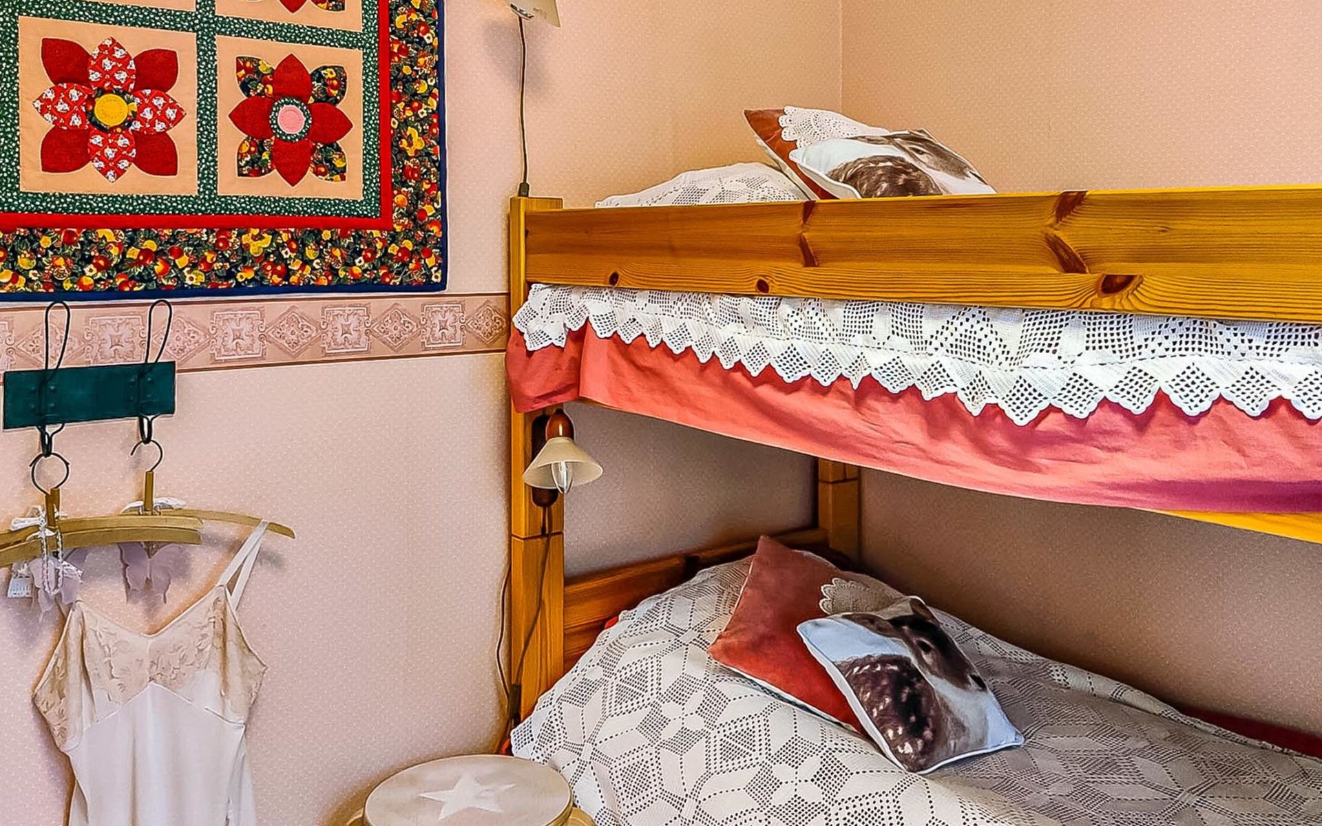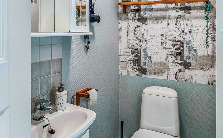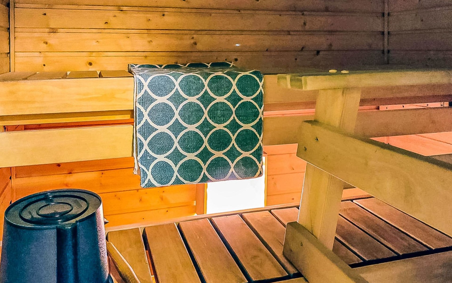 Downstairs: living room (sofa bed for 1 person), kitchen, one bedroom with a double bed, one bedroom with a bunk bed, air source heat pump, separate toilet, wash room and electric sauna.