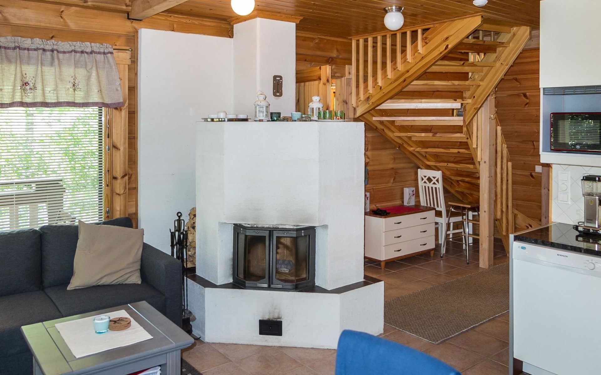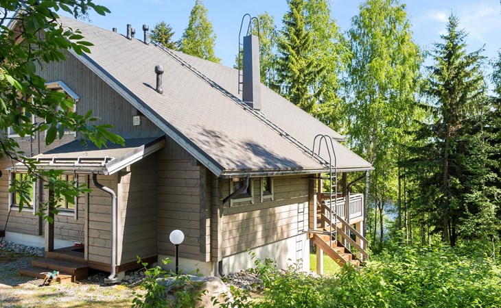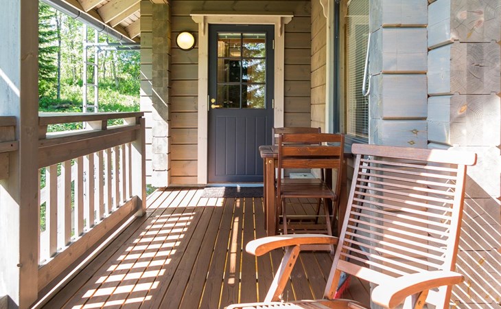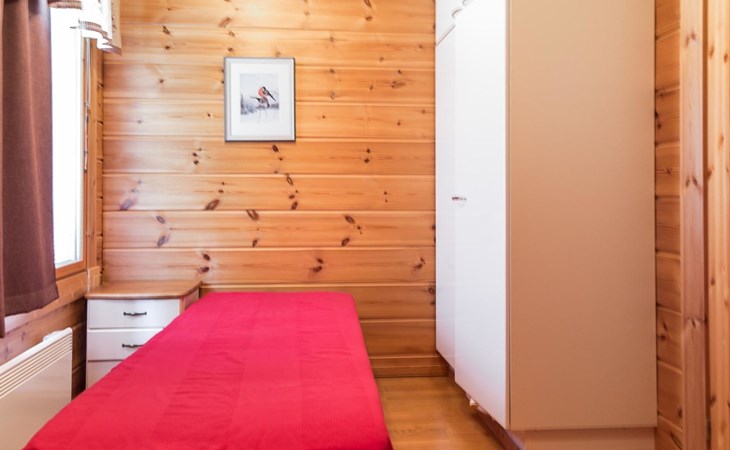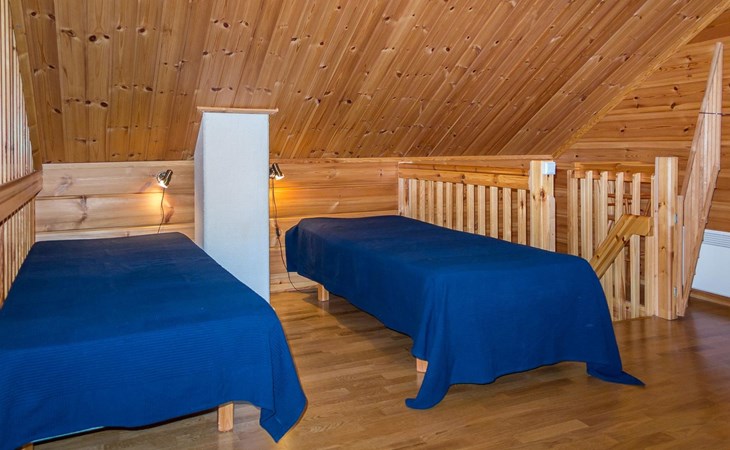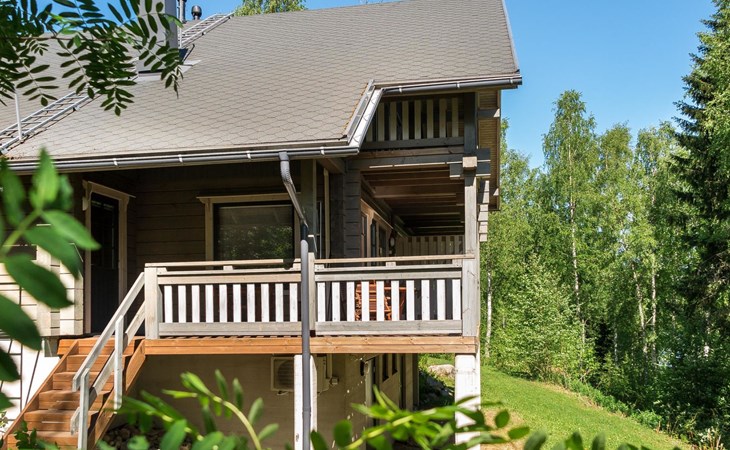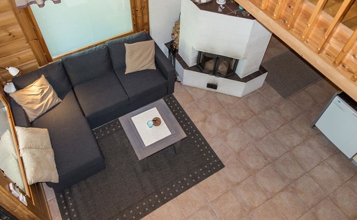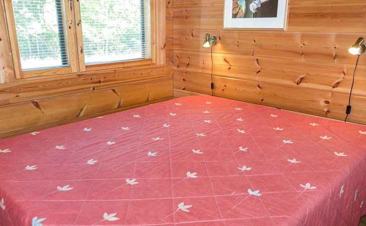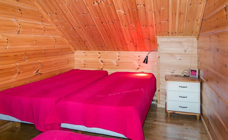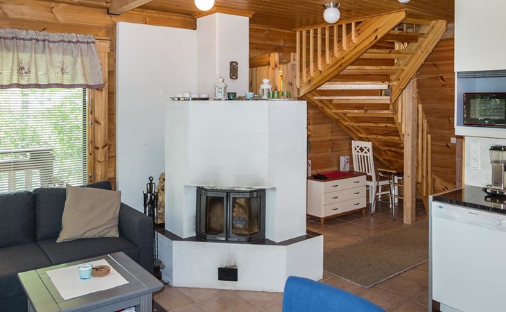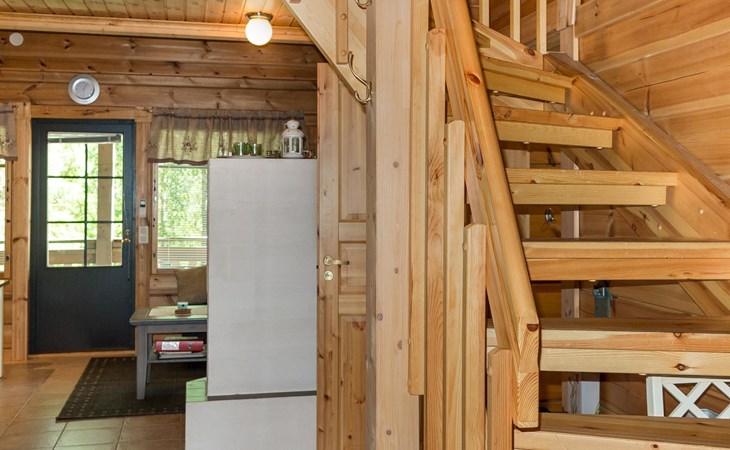 Semidetached log home from 2007, living room/kitchen with sofa-bed for 1 person, bedroom with double bed, washing room, dressing room, WC, sauna (electric stove) terrace, upstairs bedroom with 2 separate beds +1 child bed, hall with 2 beds, TV and WC. A shared washing machine is located in the basement floor, access from outside.