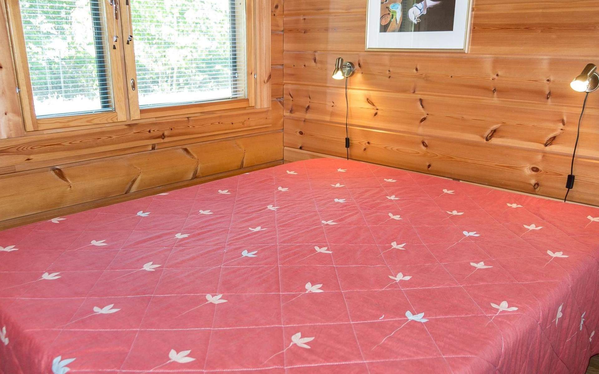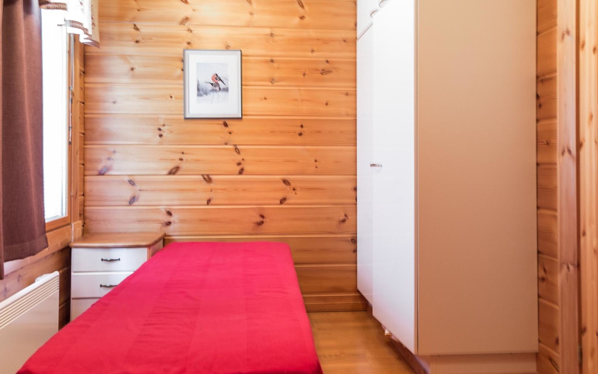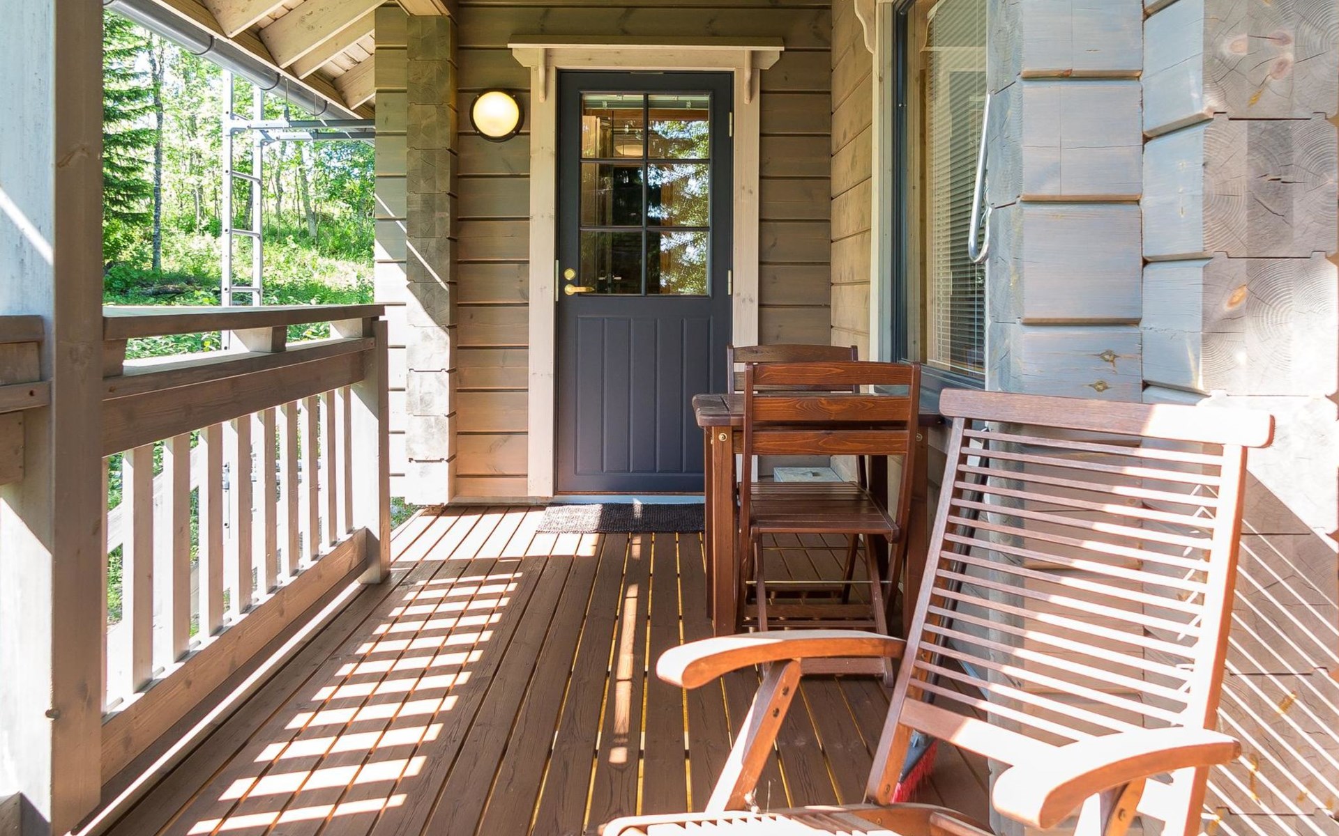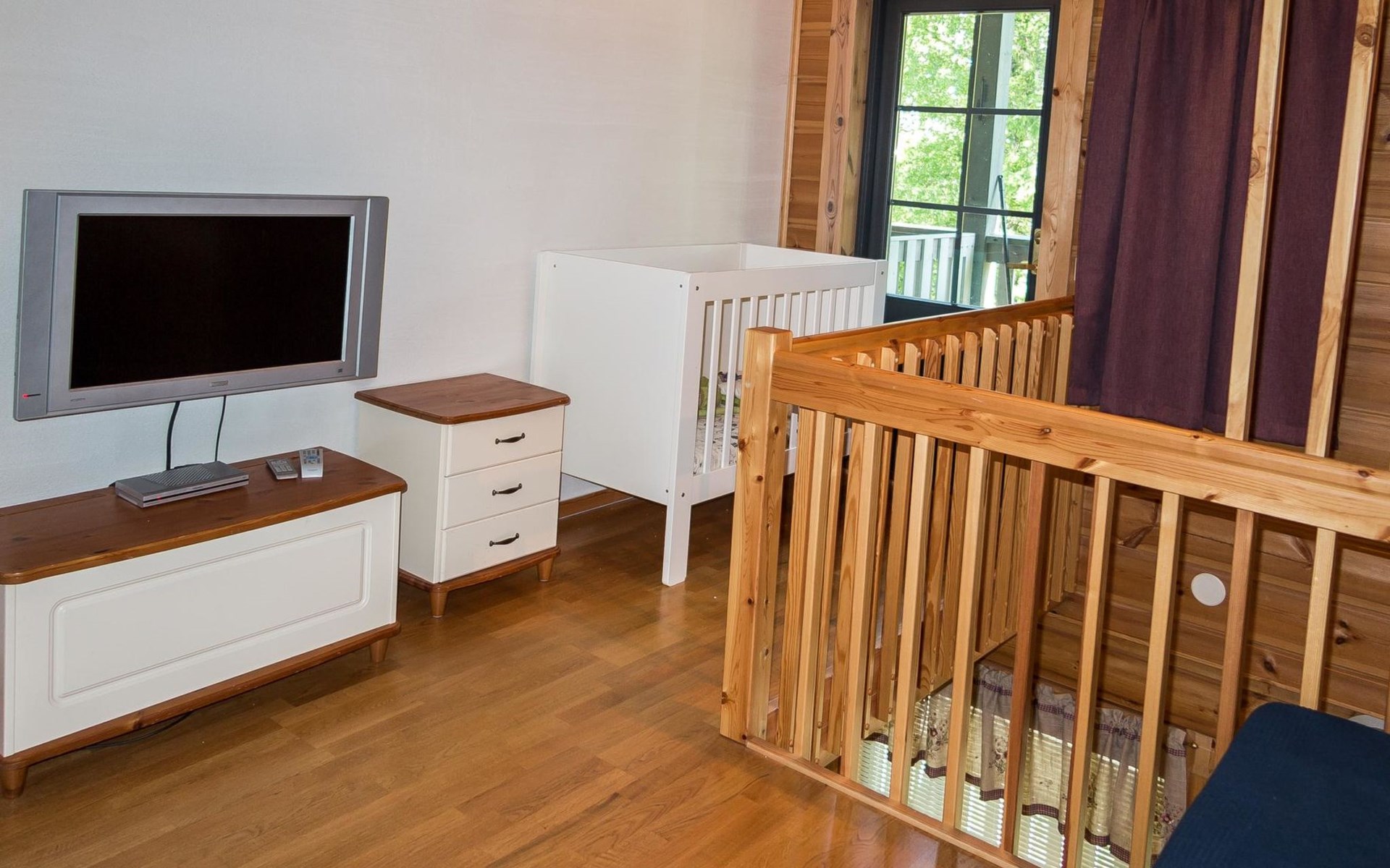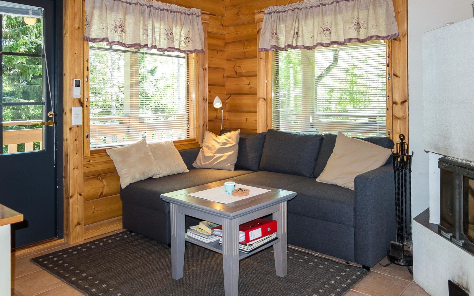 Semidetached log home from 2007, living room/kitchen with sofa-bed for 1 person, bedroom with double bed, washing room, dressing room, WC, sauna (electric stove) terrace, upstairs bedroom with 2 separate beds +1 child bed, hall with 2 beds, TV and WC. A shared washing machine is located in the basement floor, access from outside.