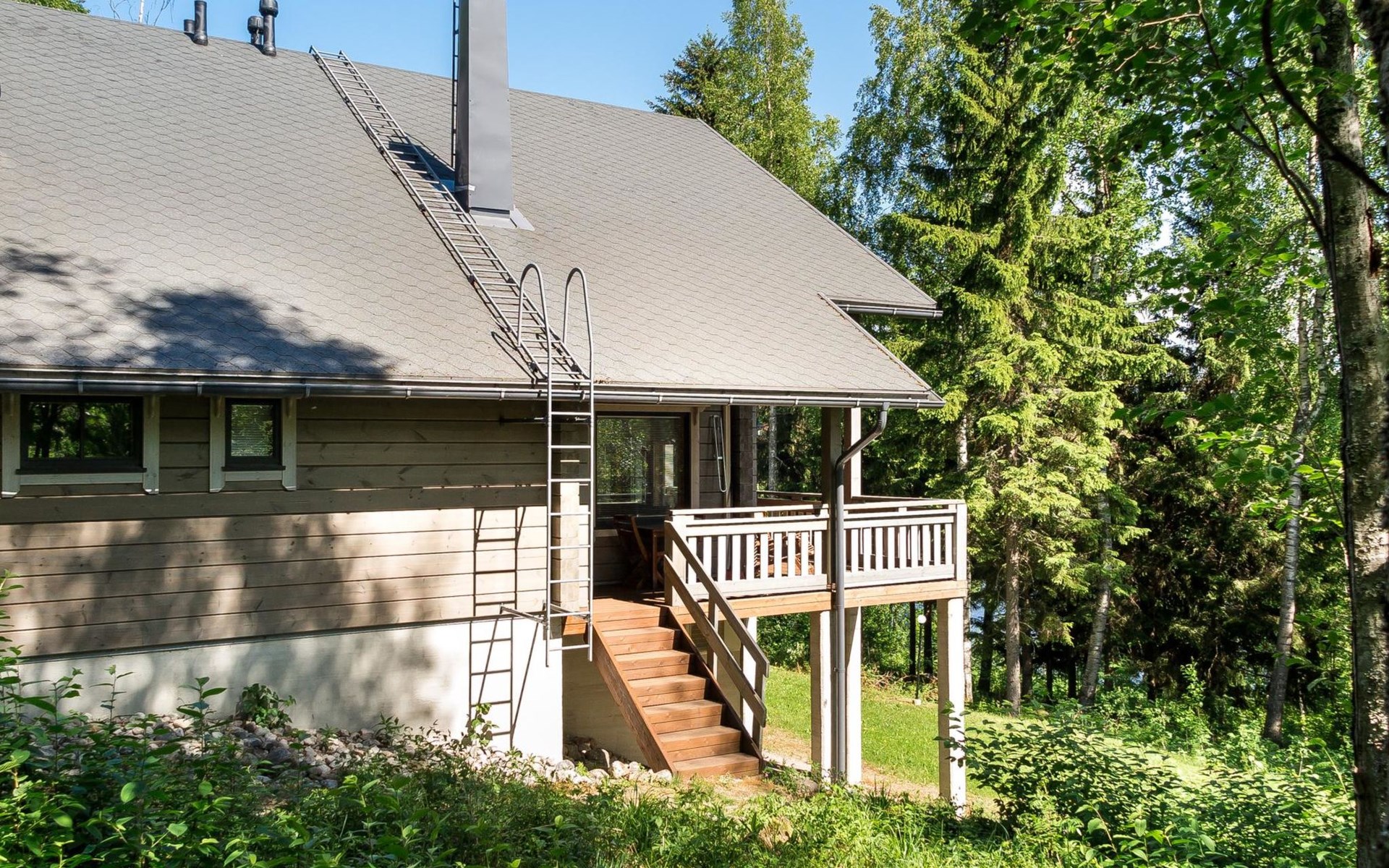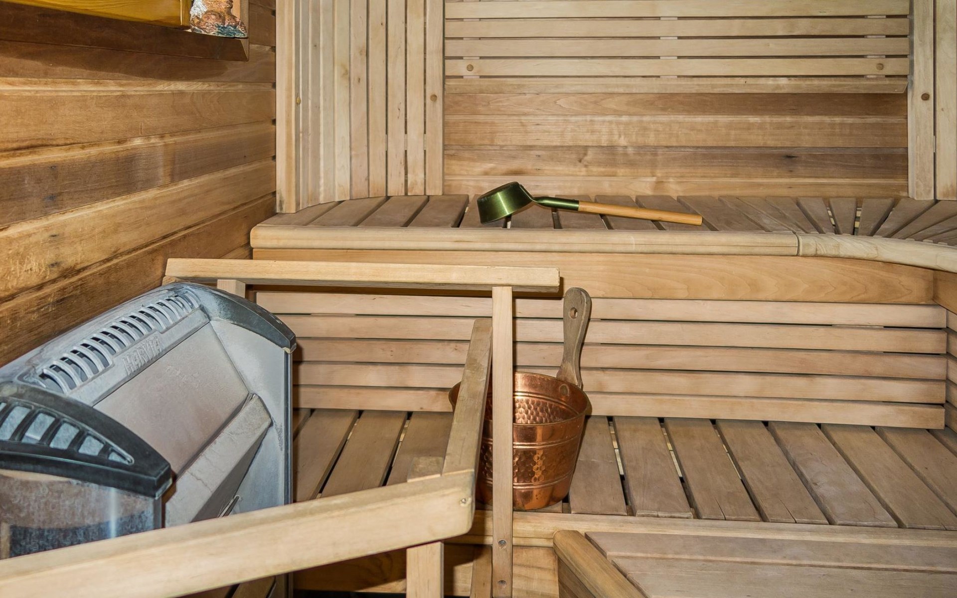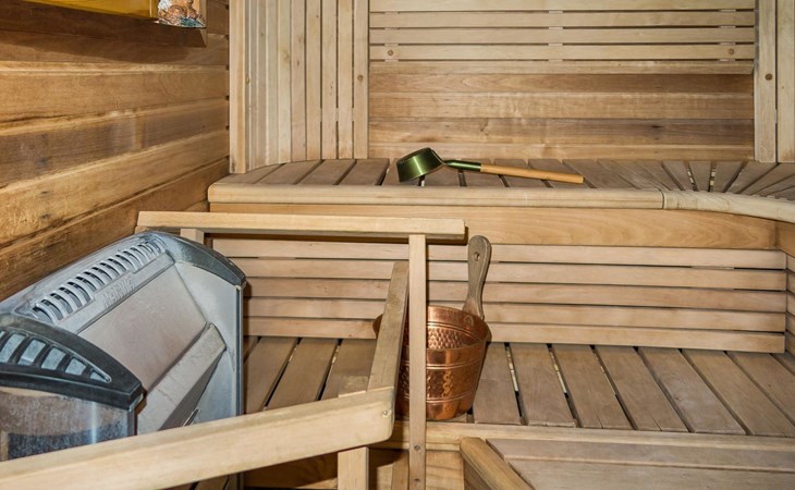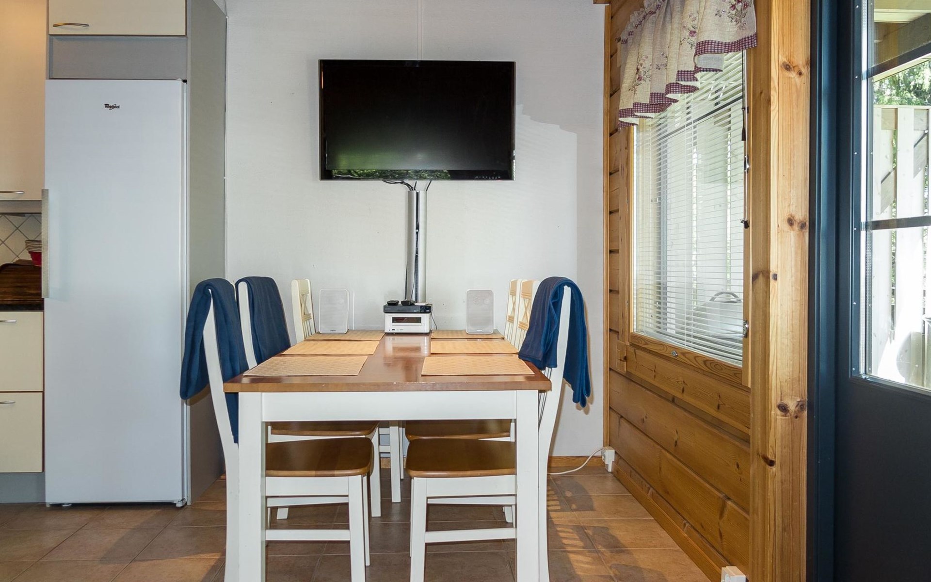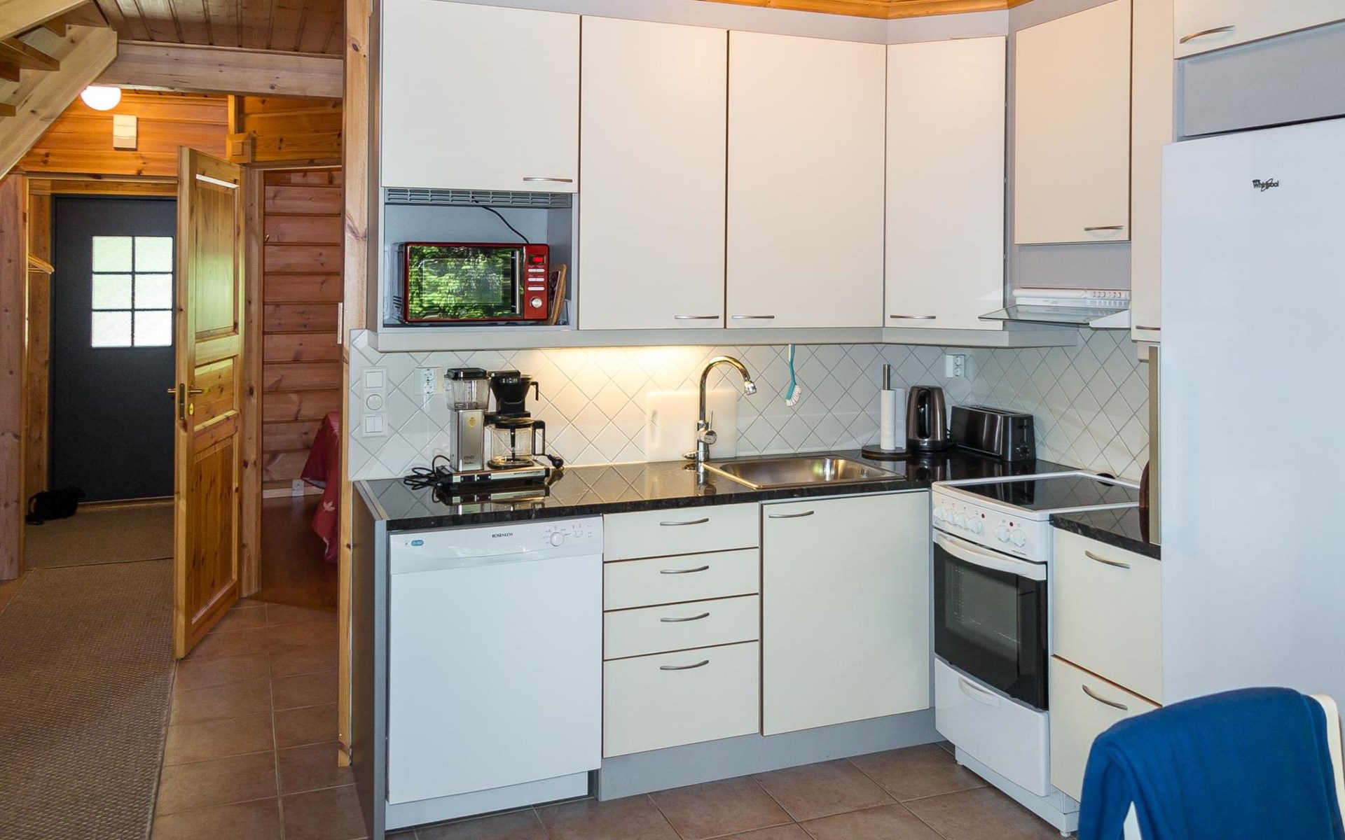 Semidetached log home from 2007, living room/kitchen with sofa-bed for 1 person, bedroom with double bed, washing room, dressing room, WC, sauna (electric stove) terrace, upstairs bedroom with 2 separate beds +1 child bed, hall with 2 beds, TV and WC. A shared washing machine is located in the basement floor, access from outside.