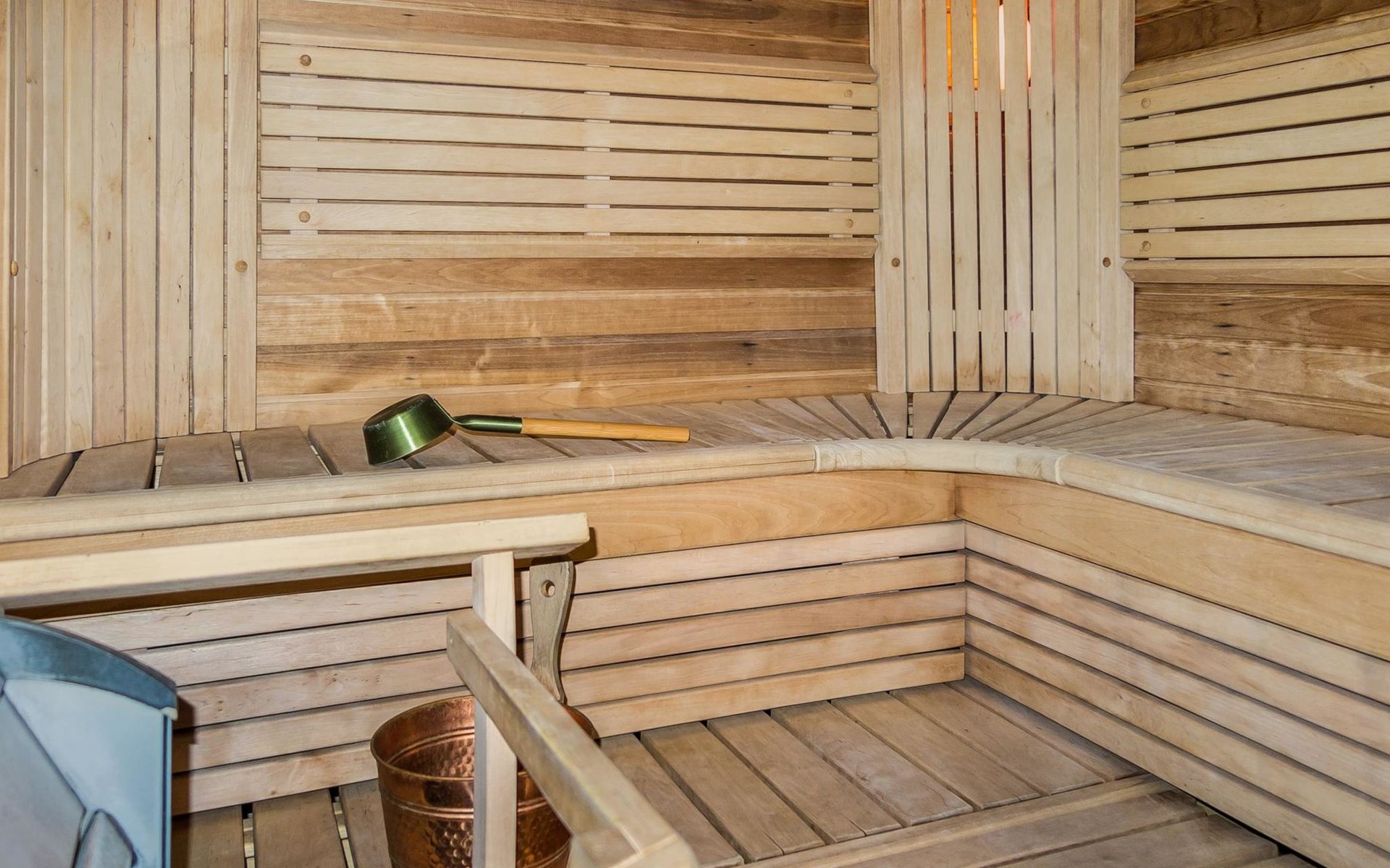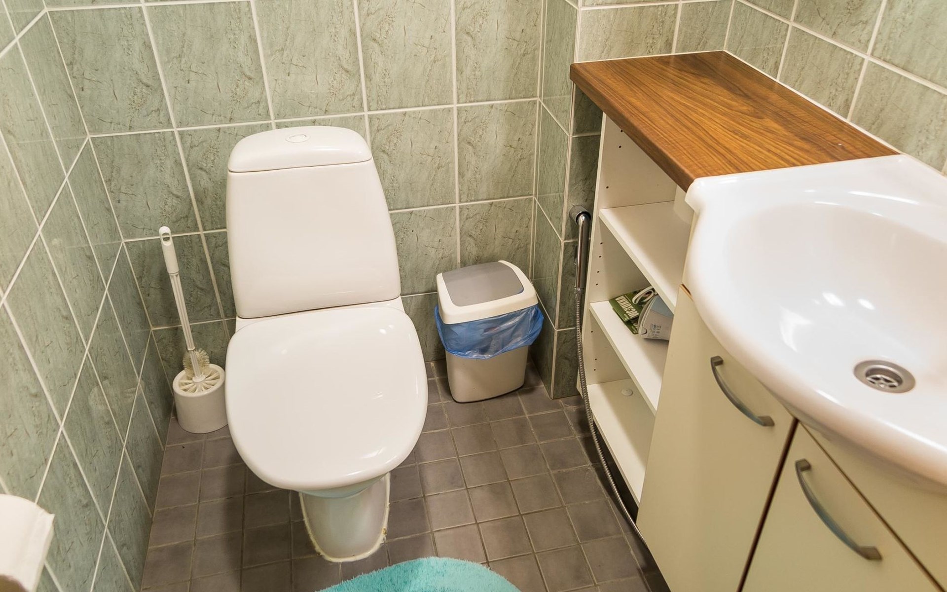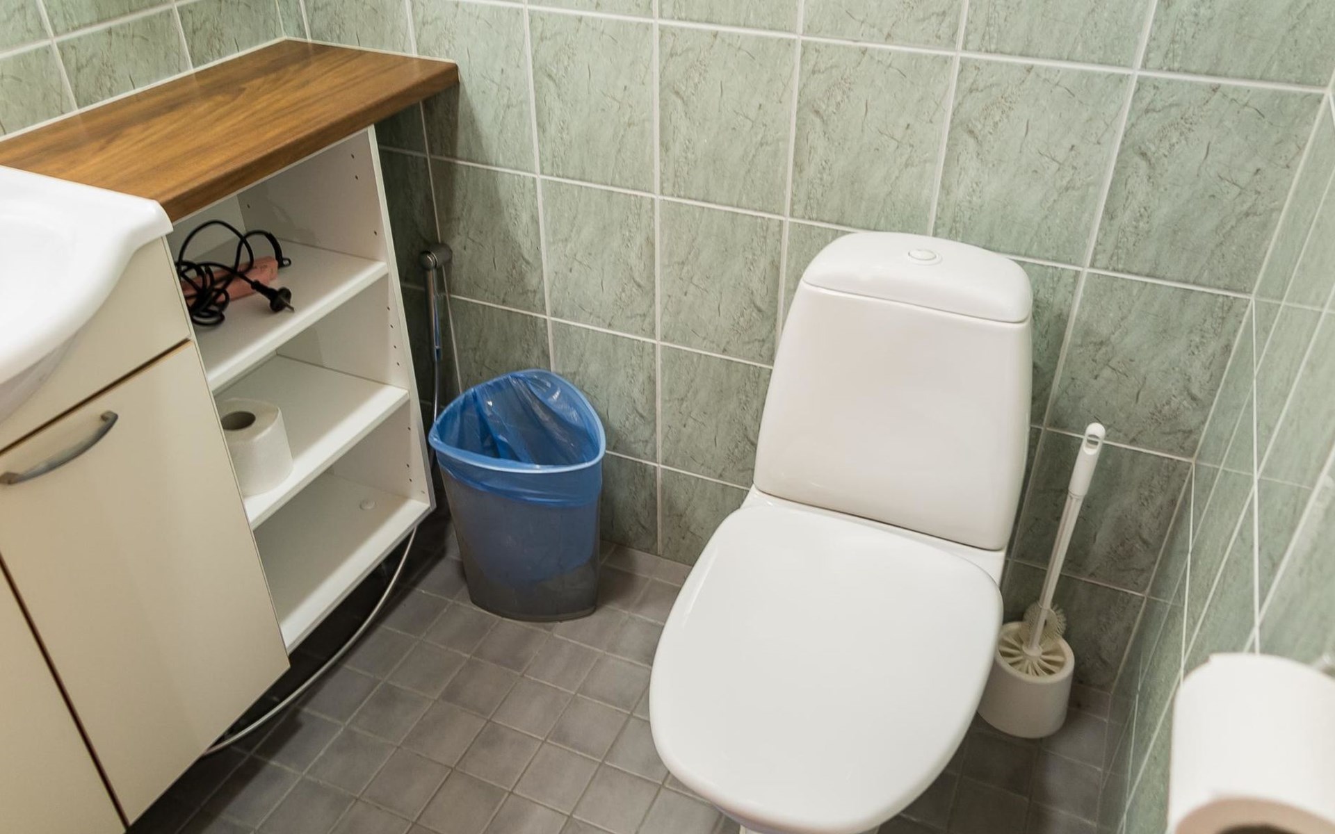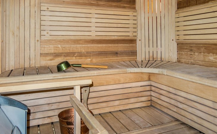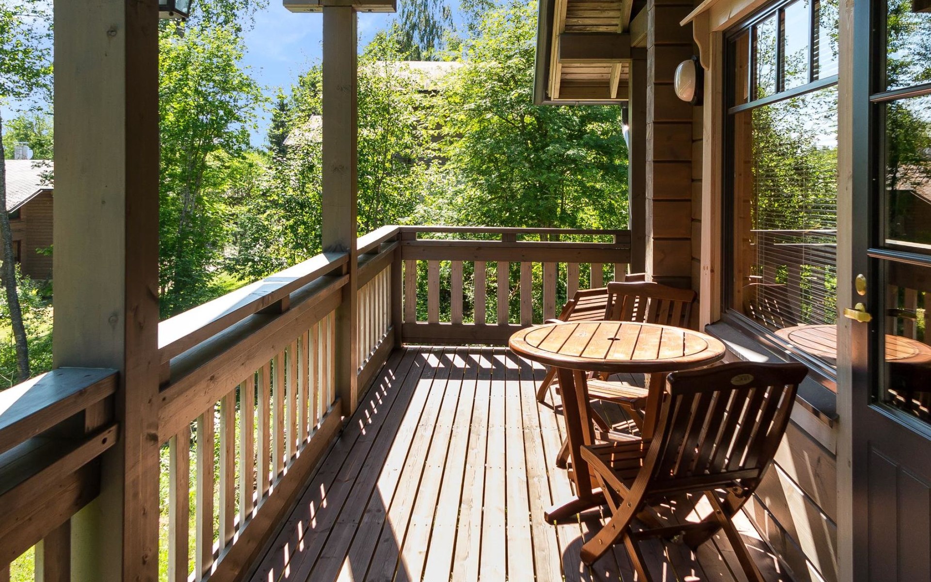 Semidetached log home from 2007, living room/kitchen with sofa-bed for 1 person, bedroom with double bed, washing room, dressing room, WC, sauna (electric stove) terrace, upstairs bedroom with 2 separate beds +1 child bed, hall with 2 beds, TV and WC. A shared washing machine is located in the basement floor, access from outside.
