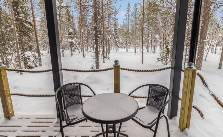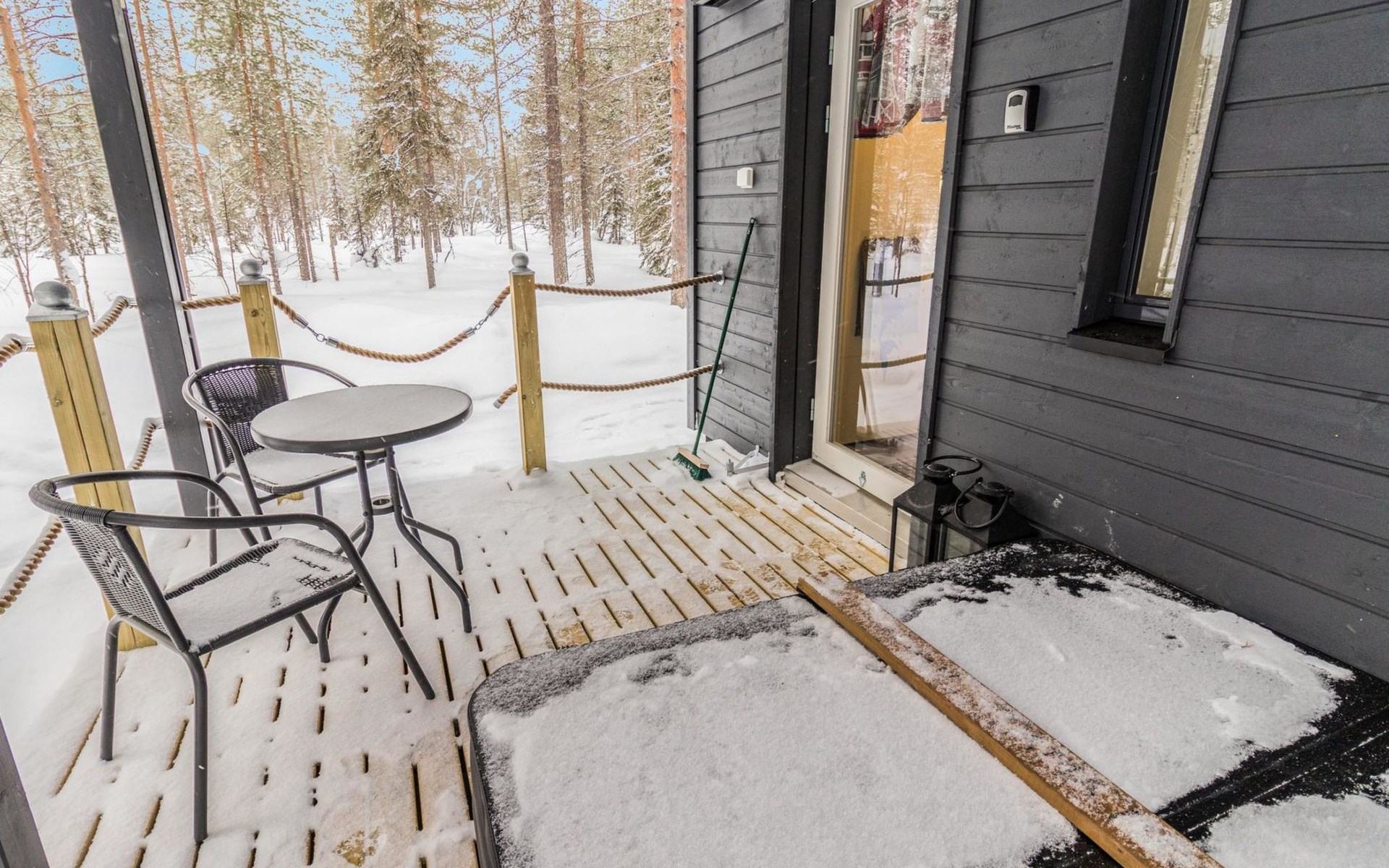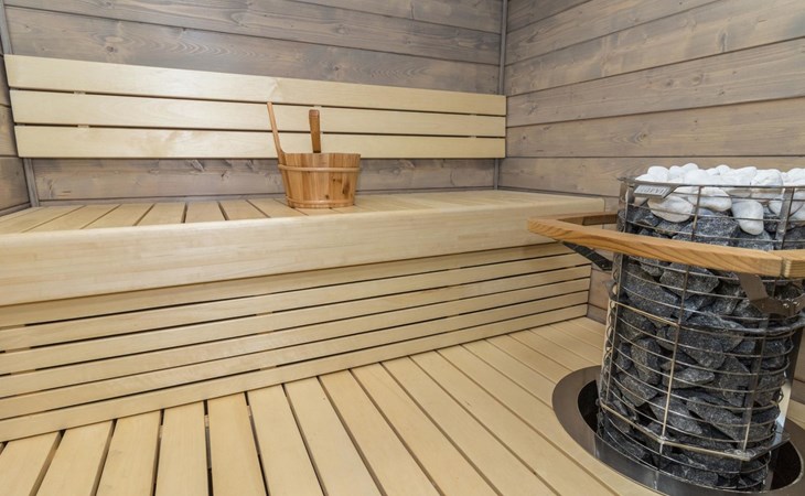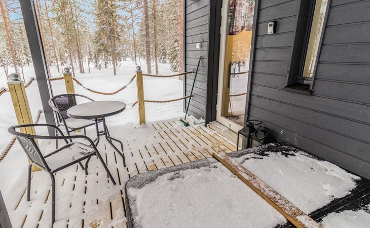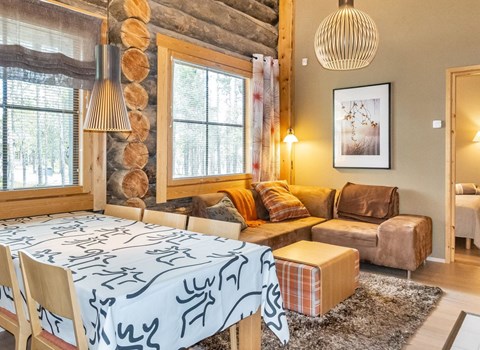 The cabin's amenities include a living room/kitchen, as well as an electric sauna, providing the perfect setting for relaxation and well-being during your stay.