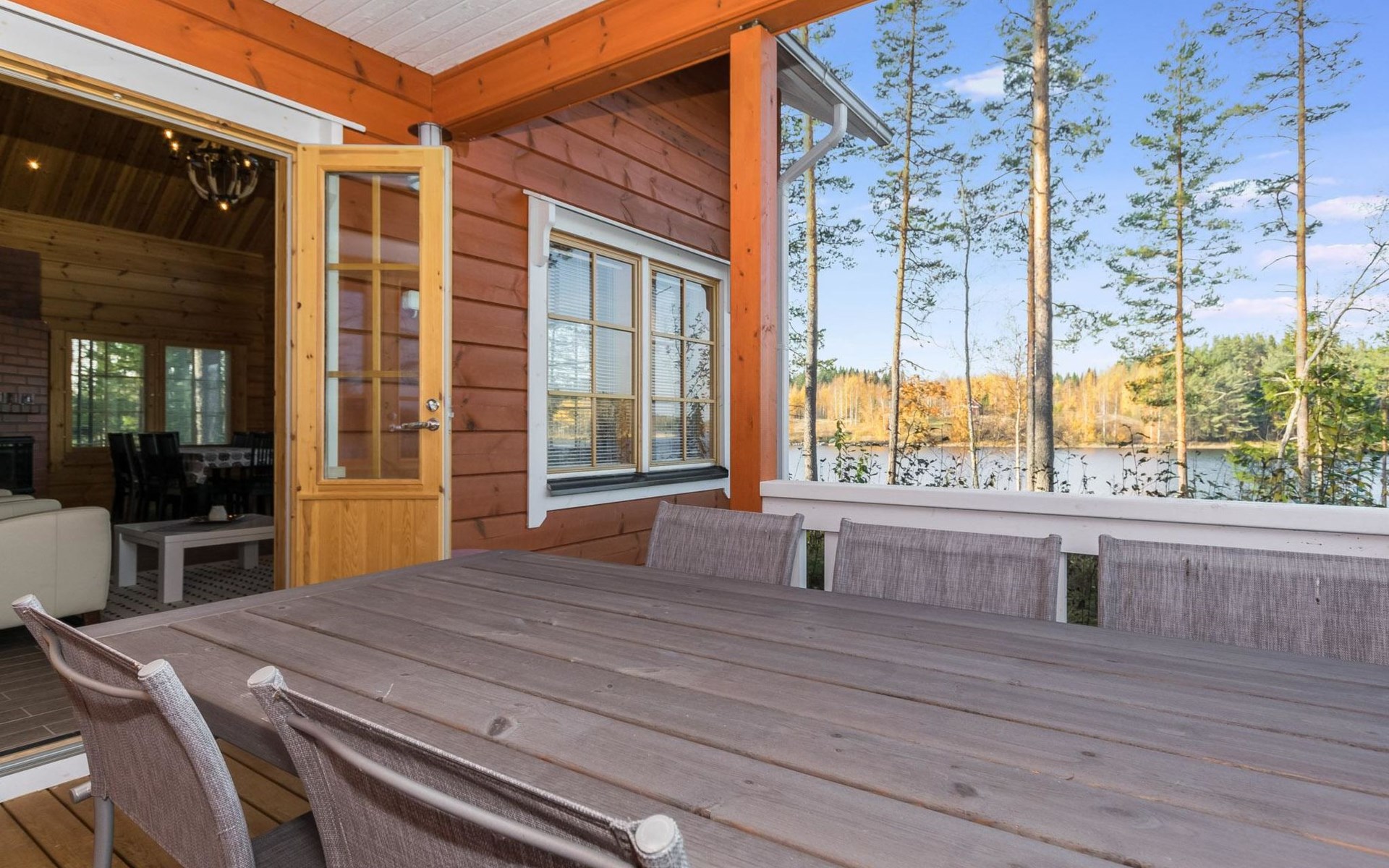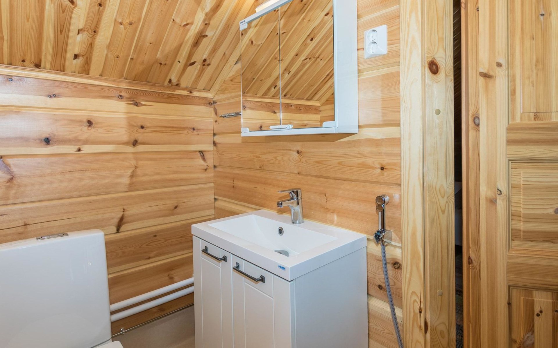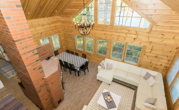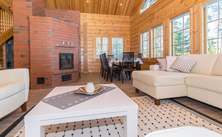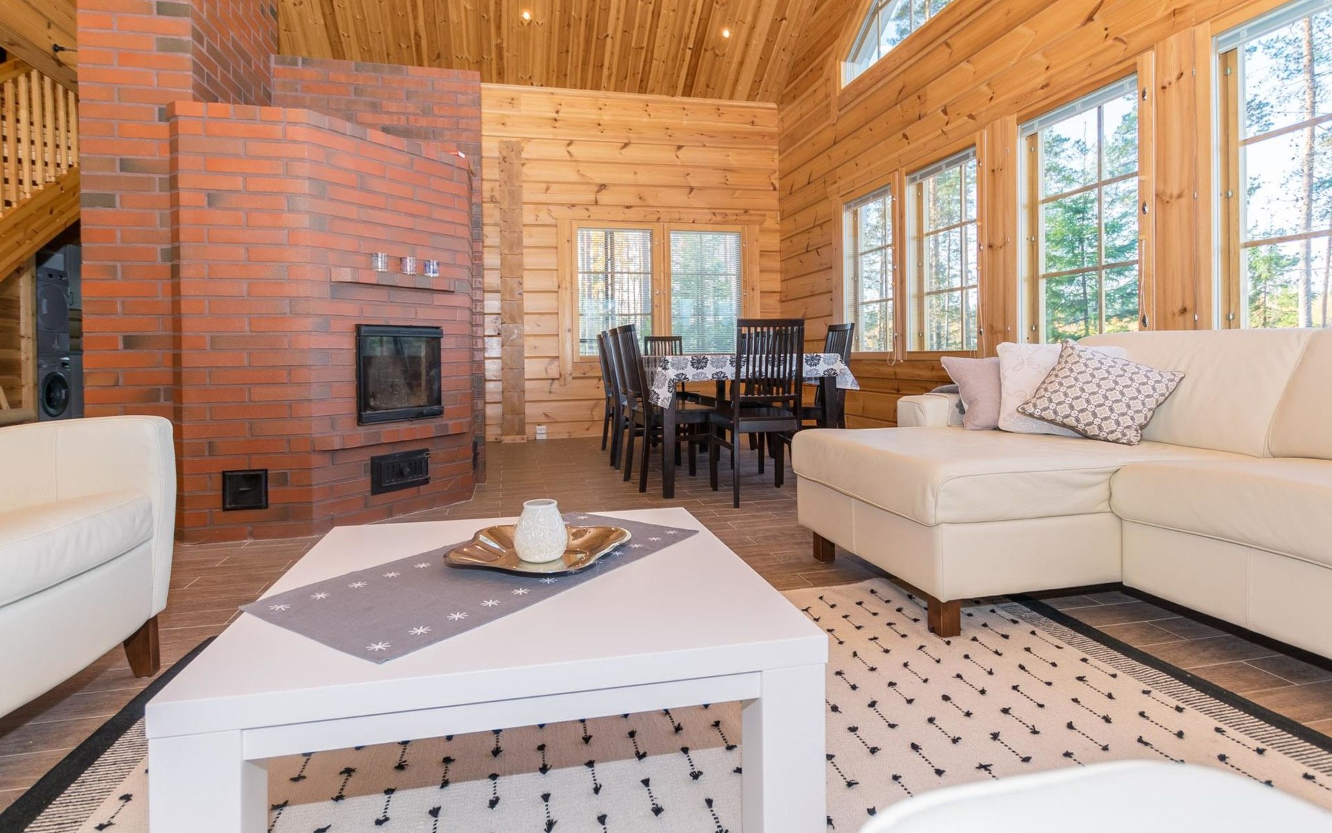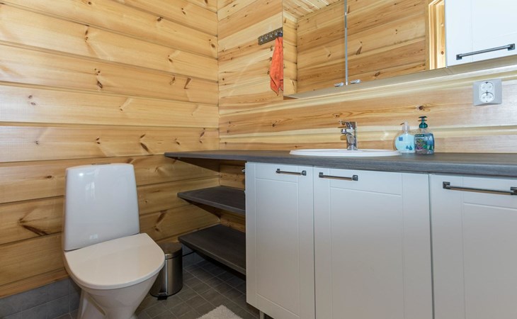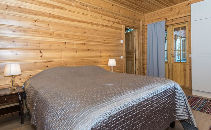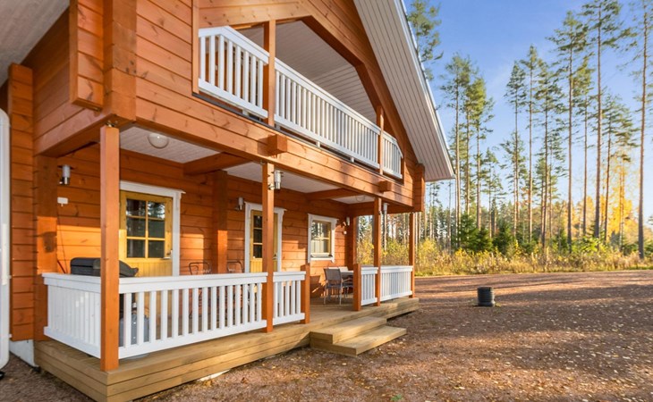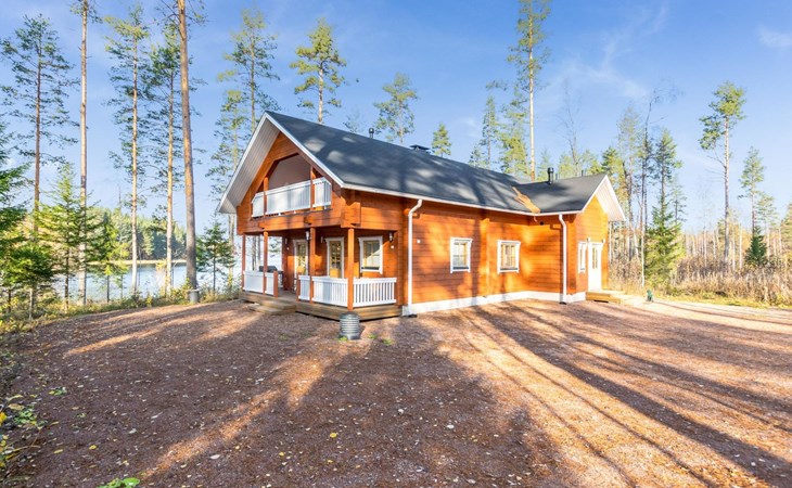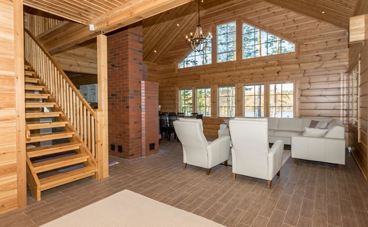 Spacious two-story log house 2017, downstairs vestibule, hallway, technical space, big living room with dining area, separate toilet, well equipped kitchen (access to the terrace), utility room, washroom with toilet, sauna (electricity), bedroom with double bed (access to the terrace), bedroom with 2 beds, 2 terraces.